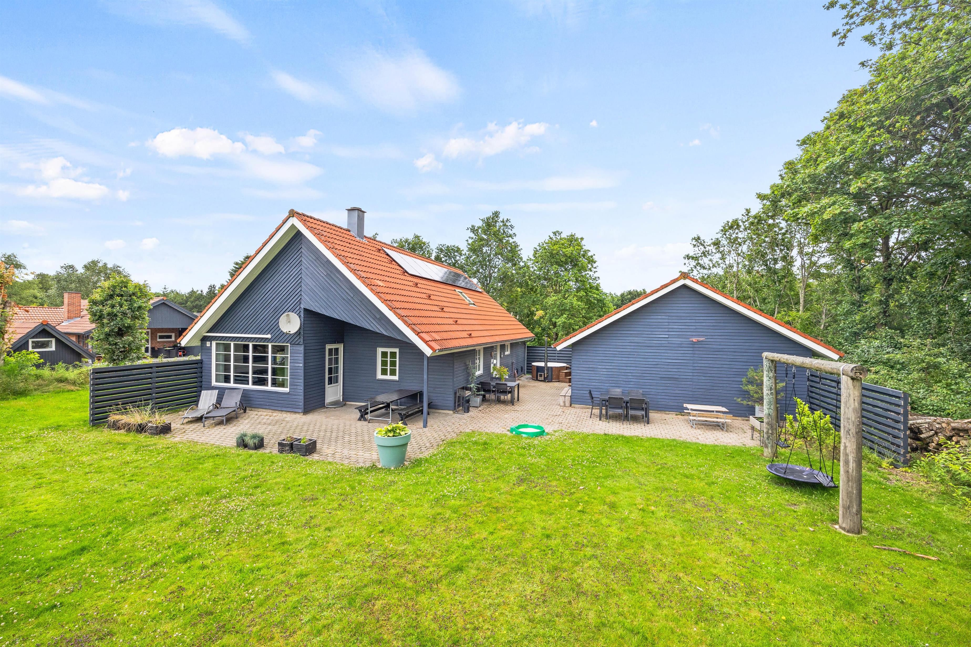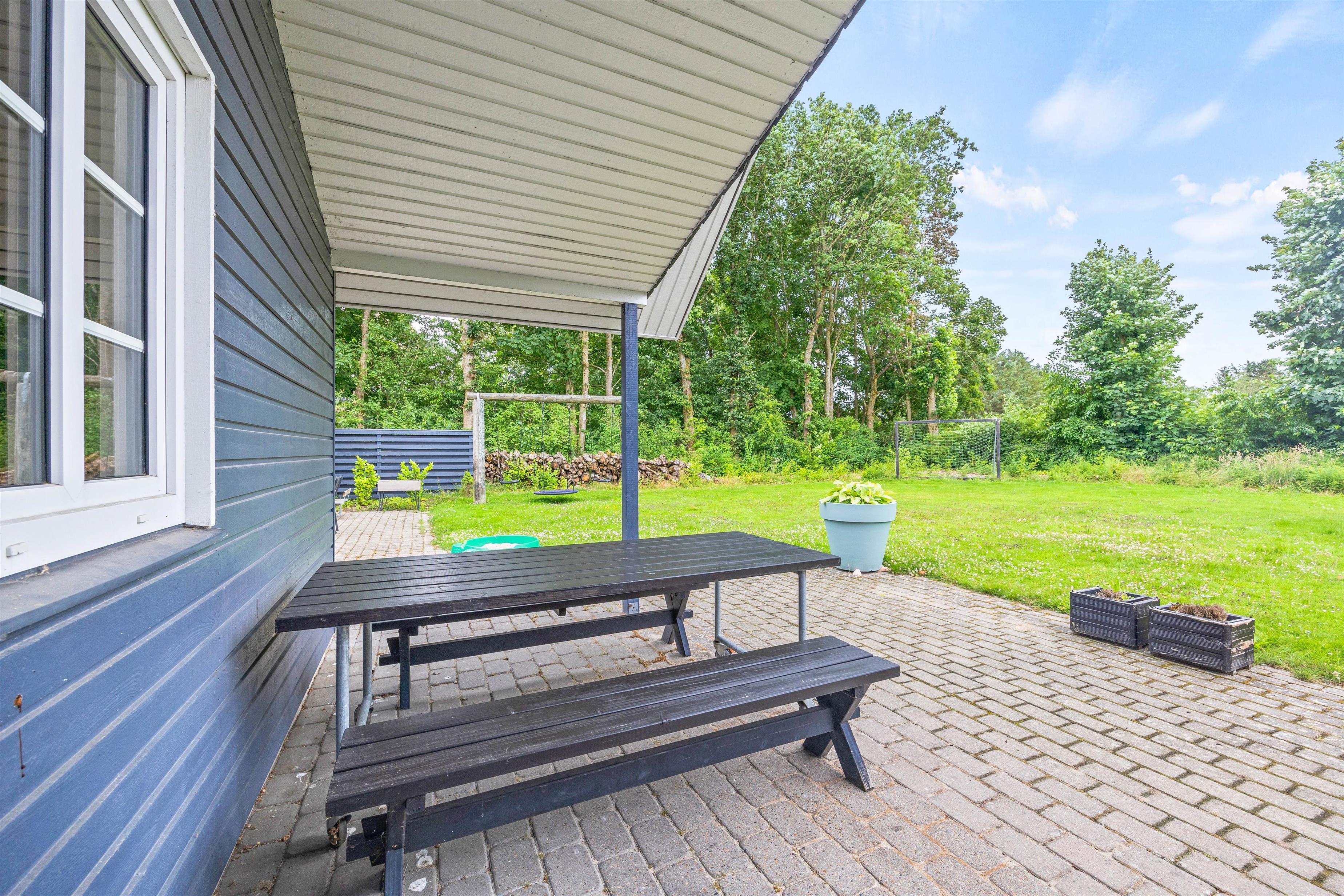 Fra stuen træder I ud på den overdækkede og delvist afskærmede terrasse. Her finder i både grill og havemøbler til en dag med mad under åben himmel, samt solvogne til de solrige dage. Herfra kan I træde ud på den 1540 kvm store plænegrund, der indbyder til spil og leg. Disse terrasser gør det nemt at finde det perfekte sted, om I vil solbade, spise udendørs eller bare slappe af med en god bog.