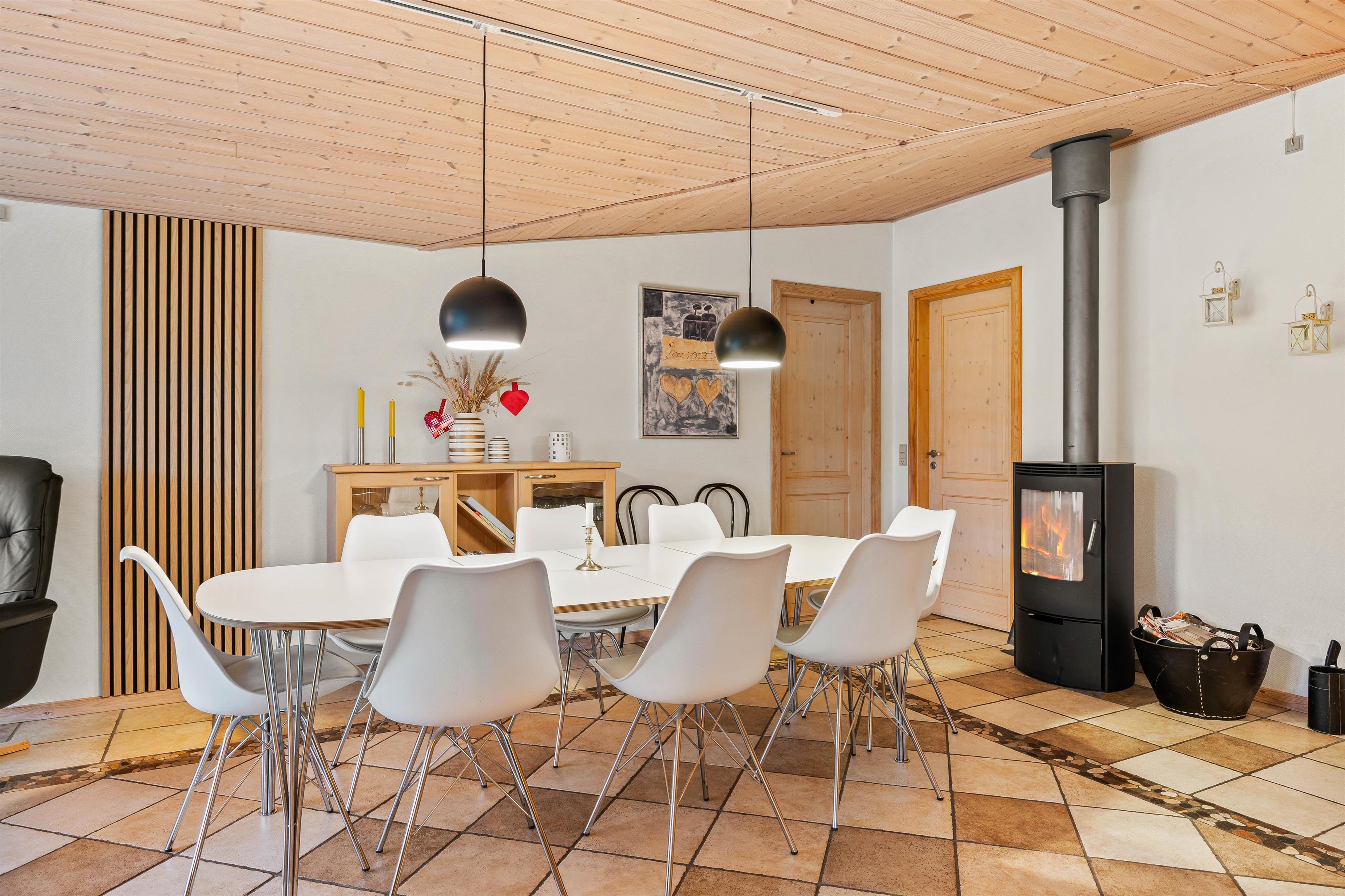 Det store opholdsrum, hvor køkken, stue og spisestue er samlet, ligger op til mange hyggelige stunder sammen. Hele rummet varmes nemt og effektivt op af varmepumpen, og når det skal være ekstra hyggeligt, kan I tænde op i brændeovnen og falde i staver over de dansende flammer, mens I mærker varmen brede sig.
