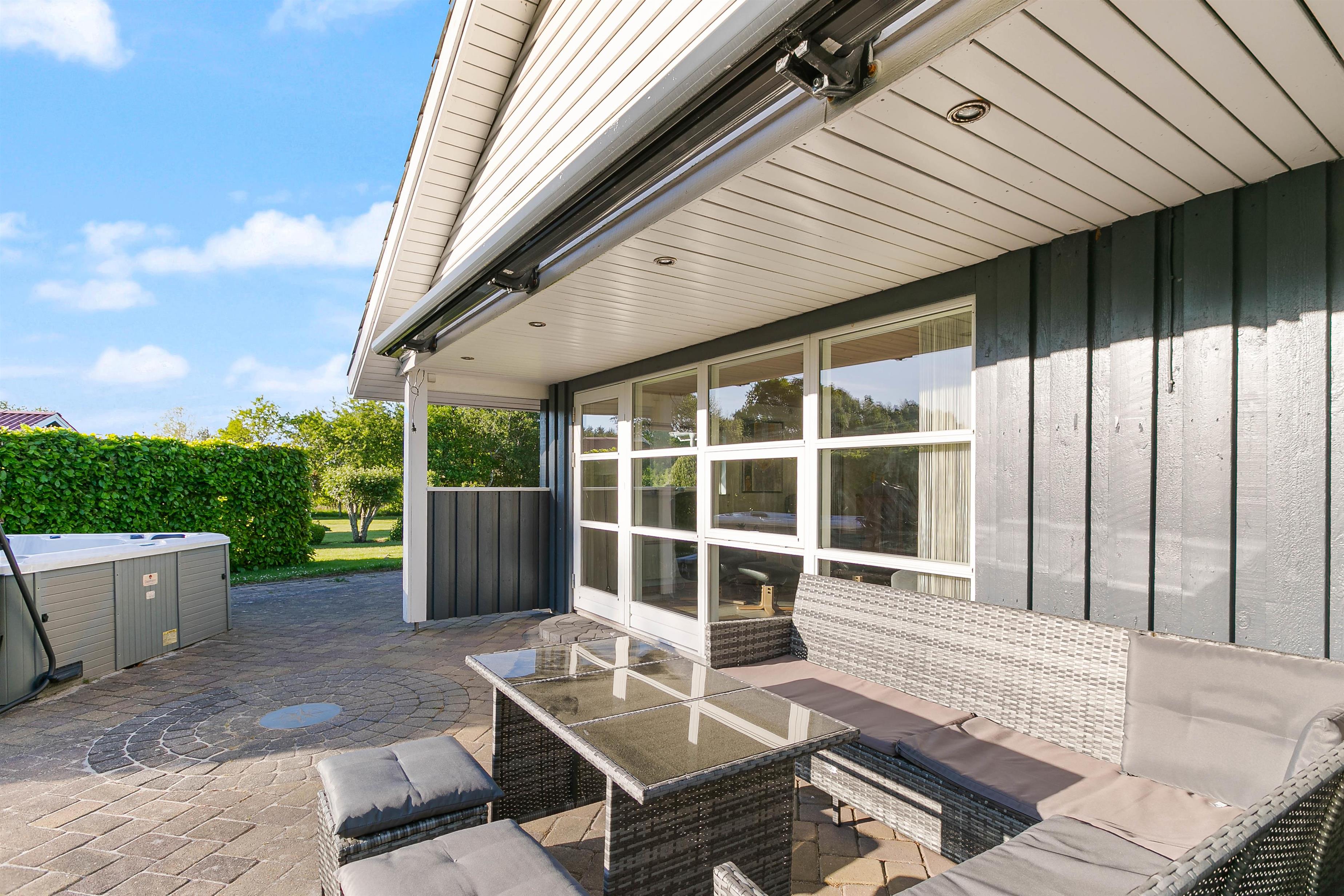 Feriehuset er placeret på en 1645 m2 stor plænegrund, hvoraf det dejlige terrasseområde og bålpladsen er indhegnet. Her kan både hunde og børn boltre sig. Til børnene er der også både trampolin, et legetårn med gynger og rutsjebane, sandkasse og en bålplads, hvor I kan nyde mørket falde på en stille sommeraften, mens I rister skumfiduser og lægger planer for de kommende feriedage.