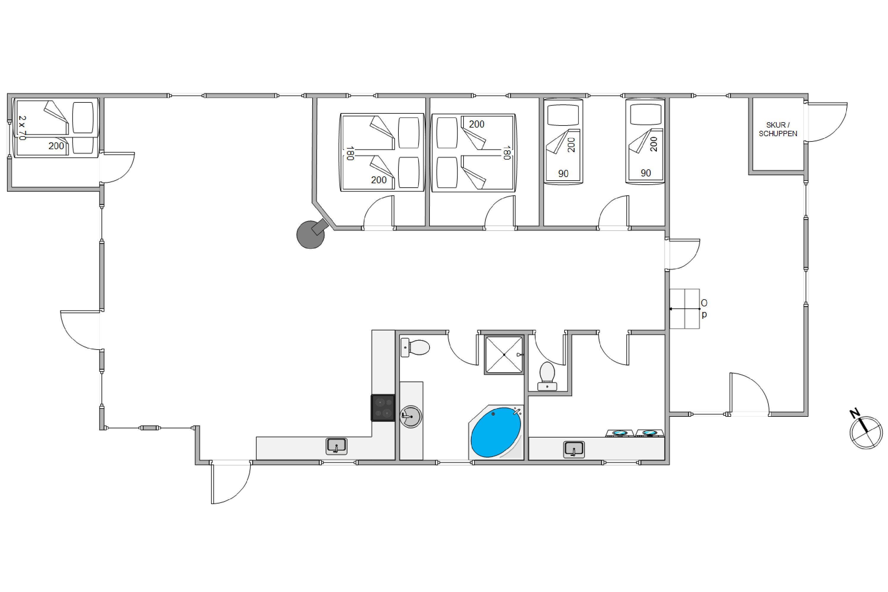 Sommerhuset har fire soveværelser: to med dobbeltsenge, et med to enkeltsenge og det sidste med en dobbeltseng, hvilket gør det oplagt til både familier og vennepar. Badeværelset byder på en tømmespa, og der er også et praktisk gæstetoilet, begge med behagelig gulvvarme. Desuden sørger vaskemaskine og tørretumbler for, at I let kan tage jer af jeres tøj under opholdet.