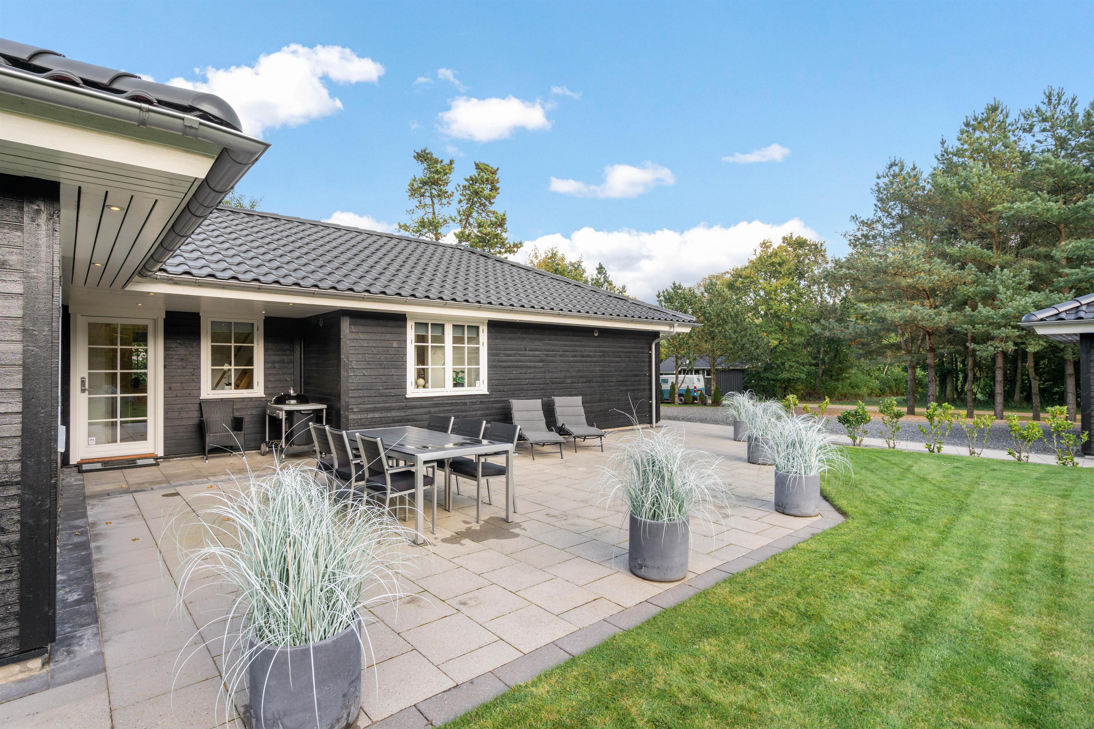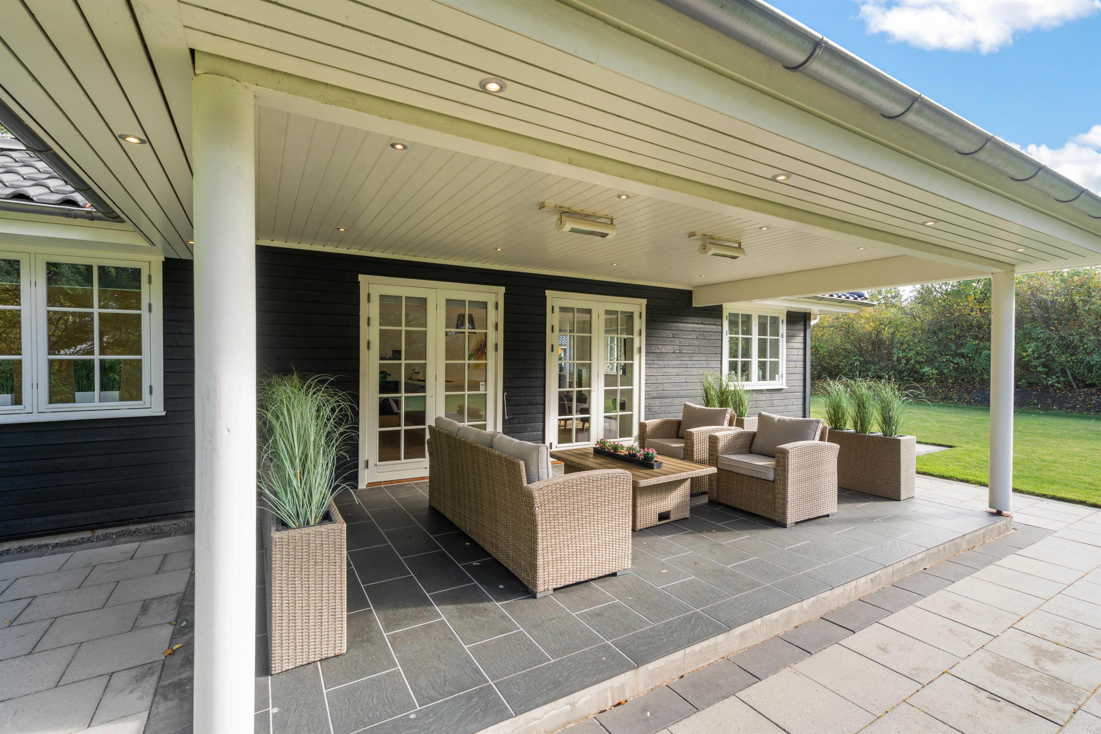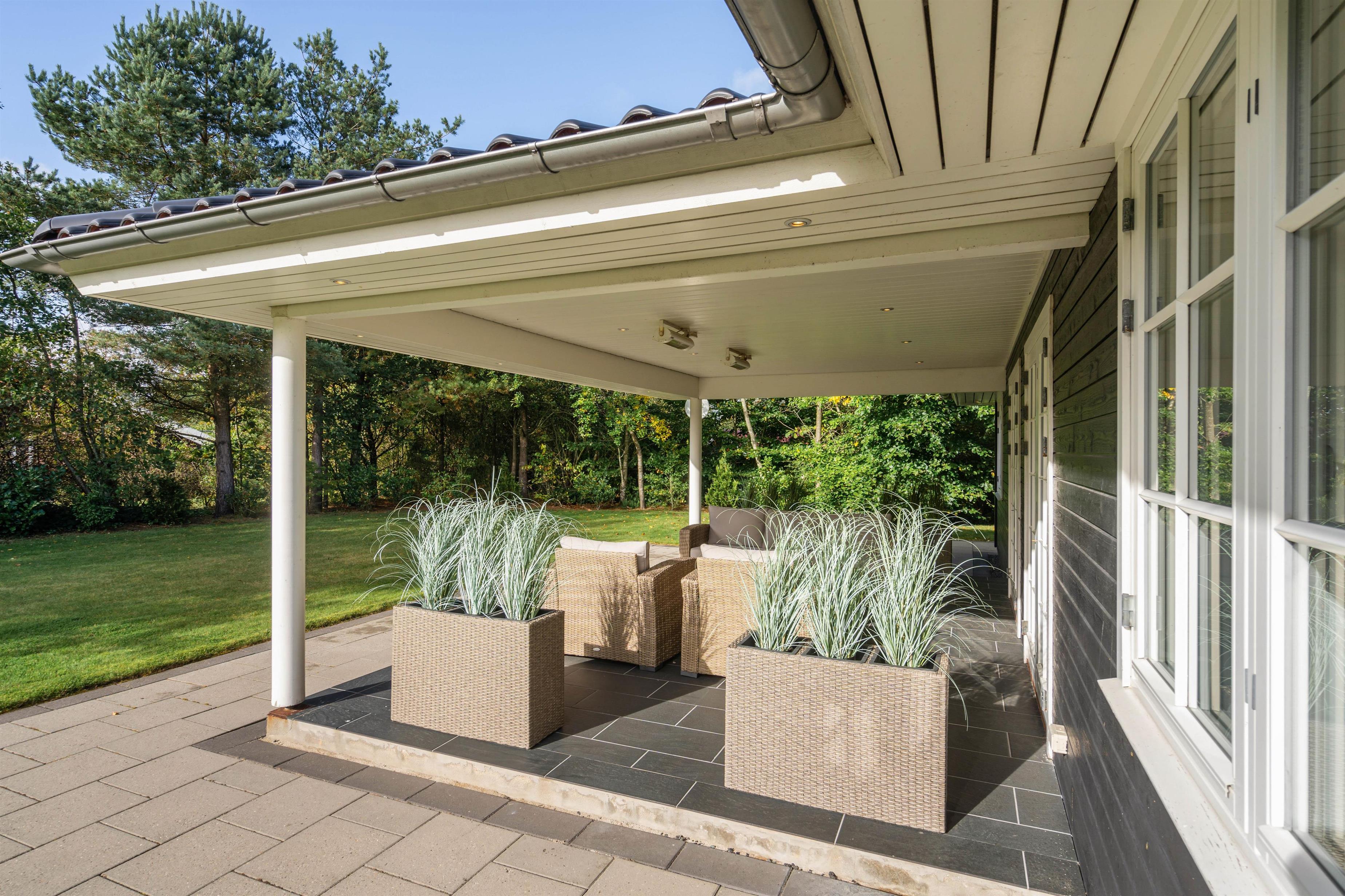 Fra sommerhuset træder I ud på den skønne terrasse, der både er åben og delvist overdækket til at nyde grillaftener på. På de varme dage kan I finde jer godt til rette i solen i diverse havemøbler og på liggestole.