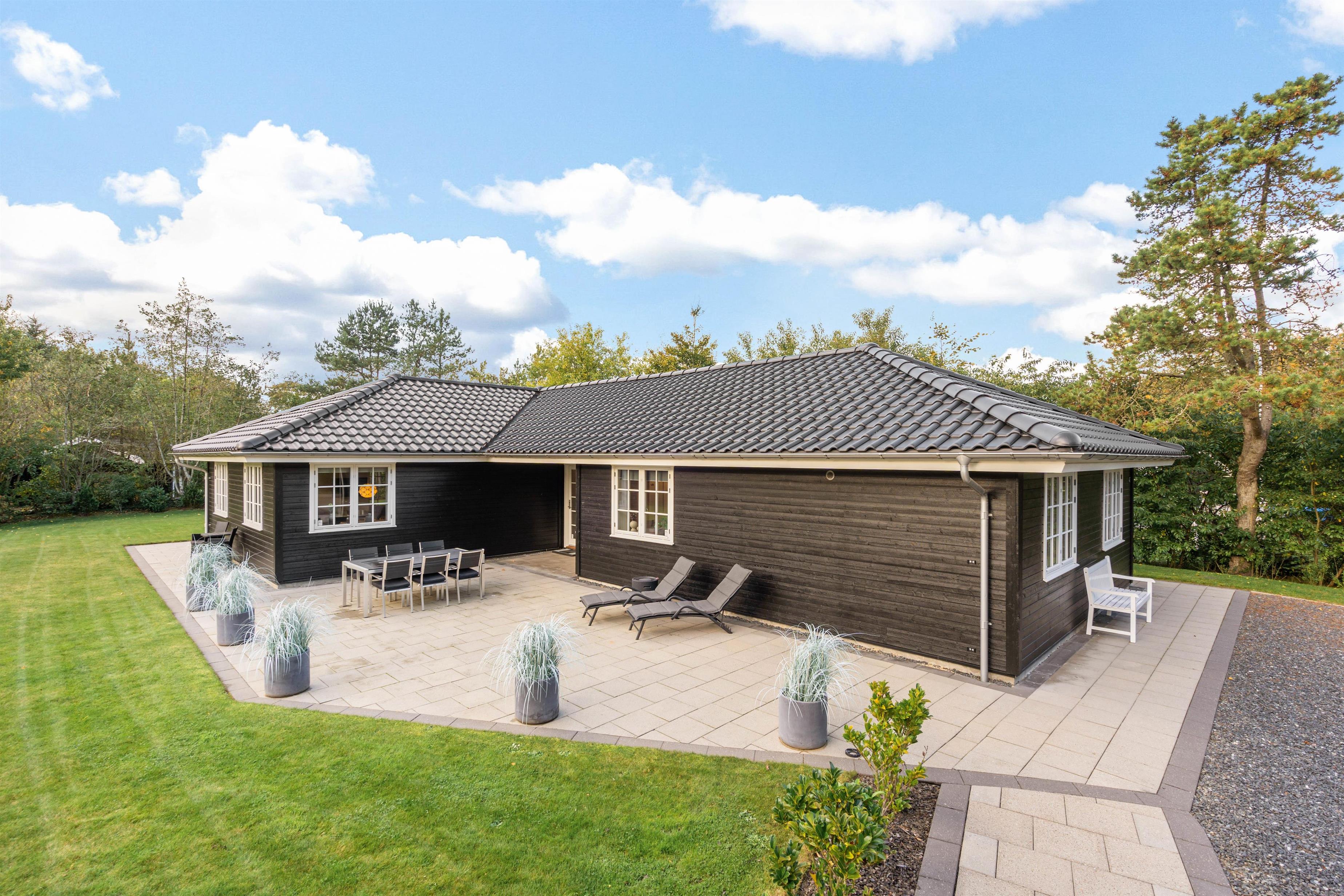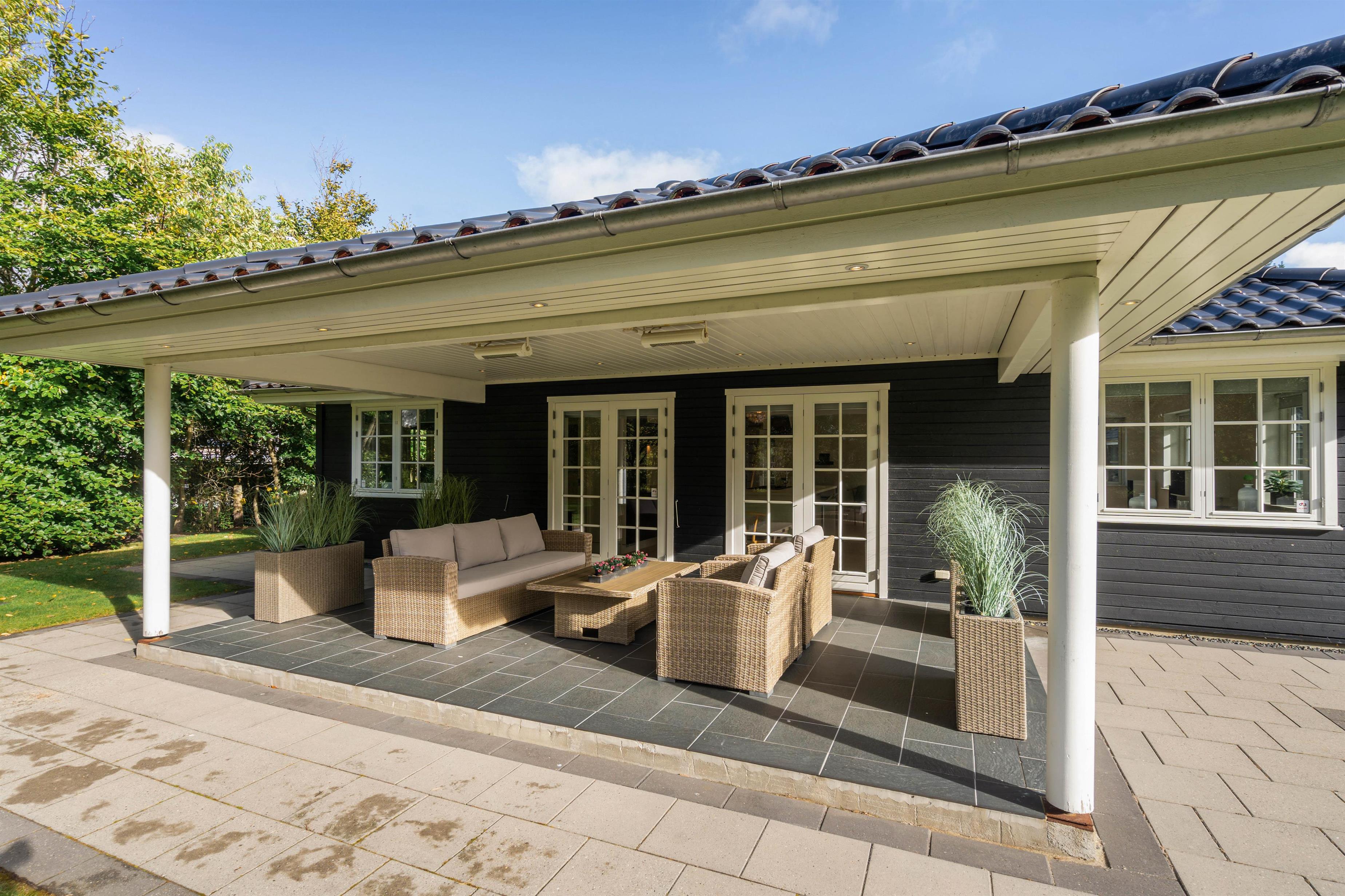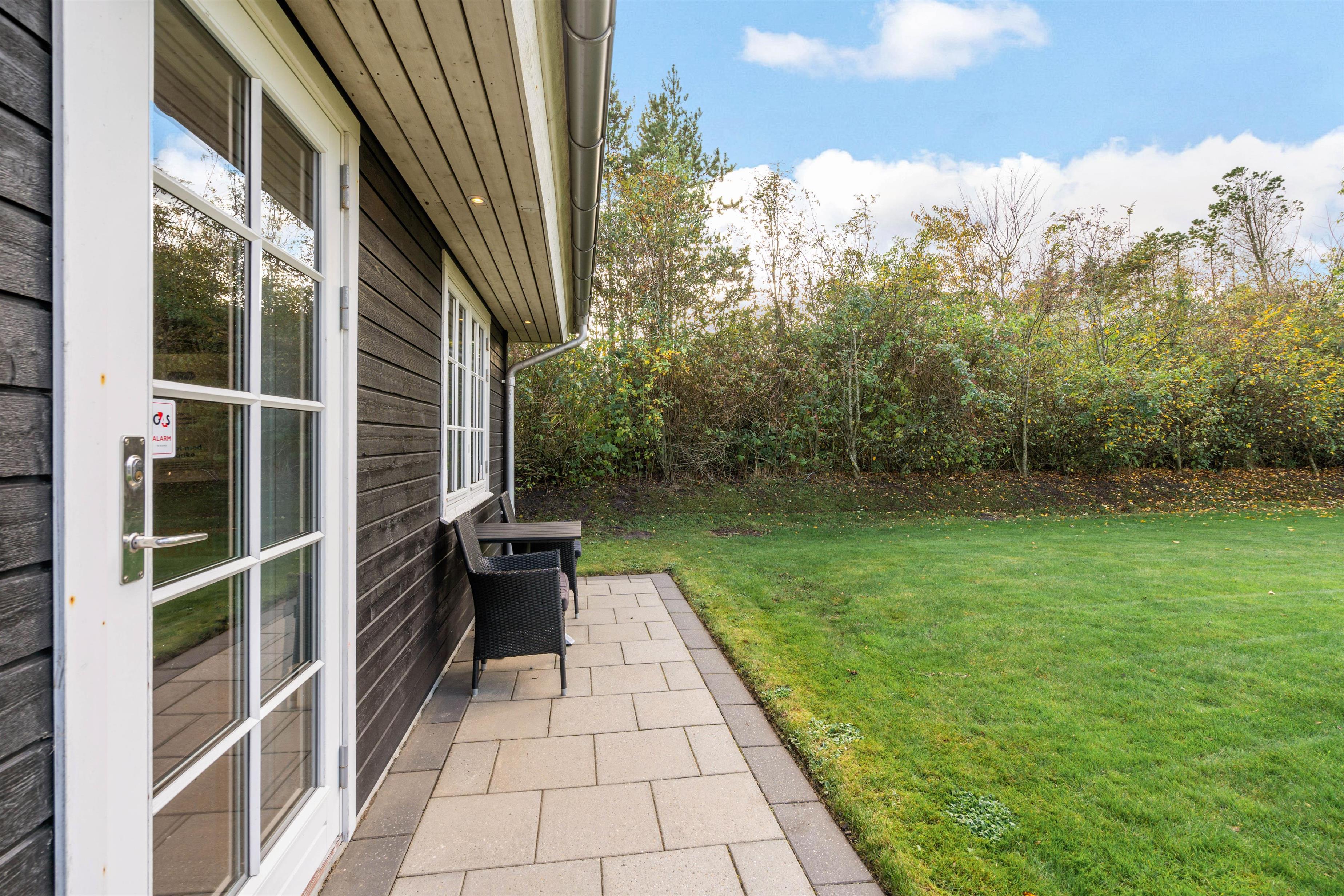 Fra sommerhuset træder I ud på den skønne terrasse, der både er åben og delvist overdækket til at nyde grillaftener på. På de varme dage kan I finde jer godt til rette i solen i diverse havemøbler og på liggestole.
