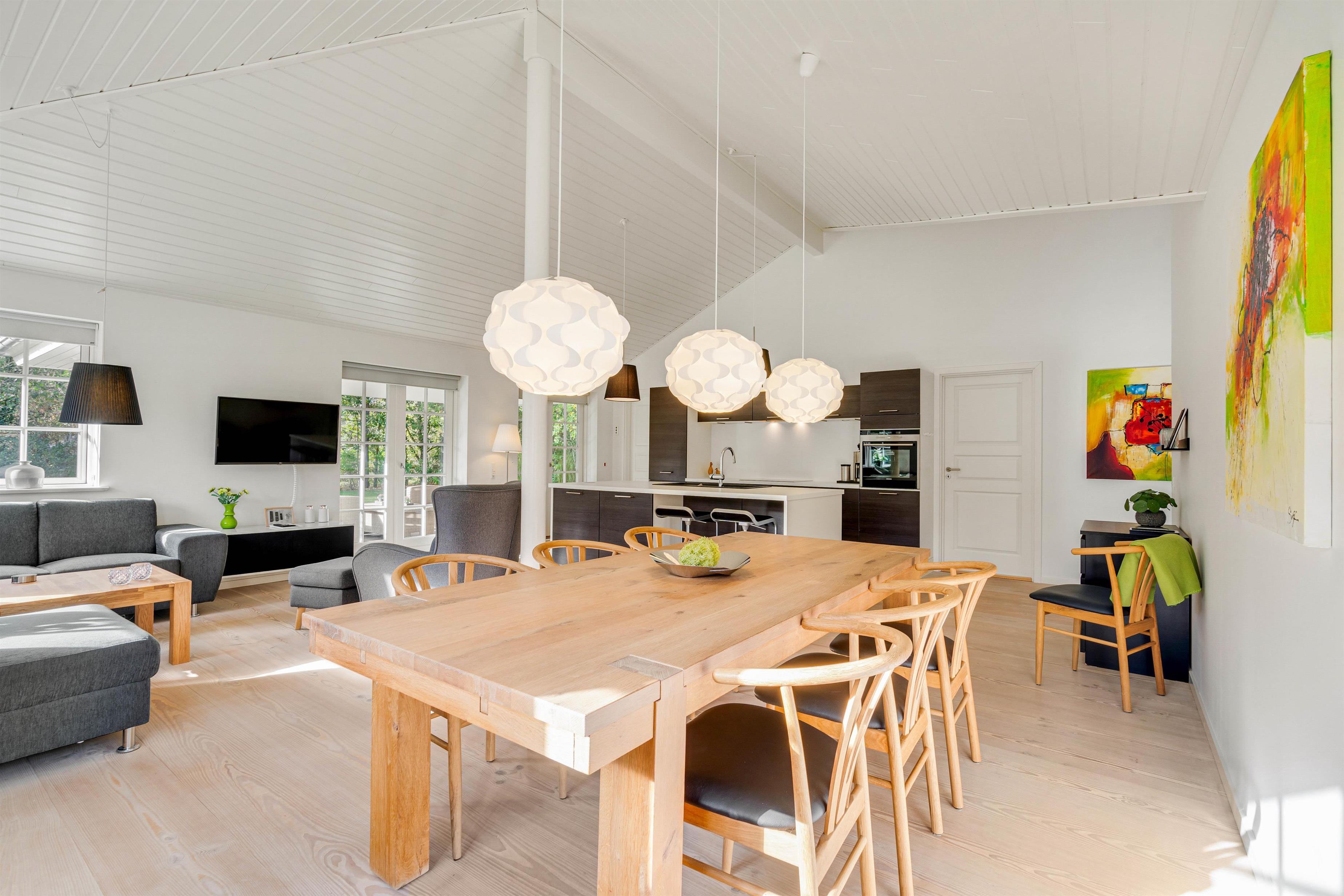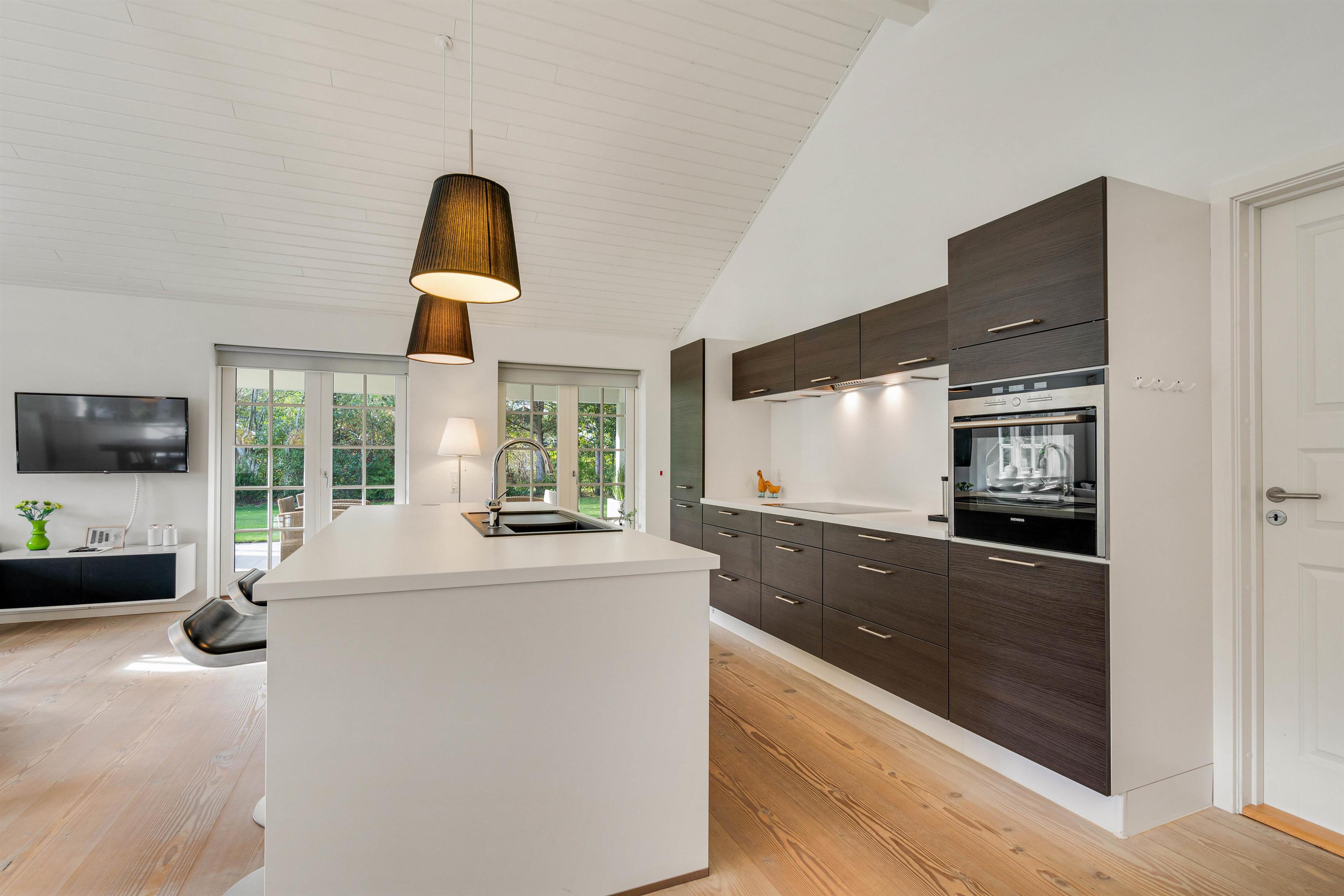 Det indbydende køkken og alrum hænger sammen, så her kan ferieflokken samles i et opholdsrum, hvor stemningen inviterer til feriehygge. Her kan I slænge jer i den store hjørnesofa med en god bog eller en film på tv’et. Desuden er køkkenet indrettet bekvemt med induktion, indbygget 80 liters fryser samt et praktisk bryggers med både vaskemaskine og tørretumbler til rådighed.