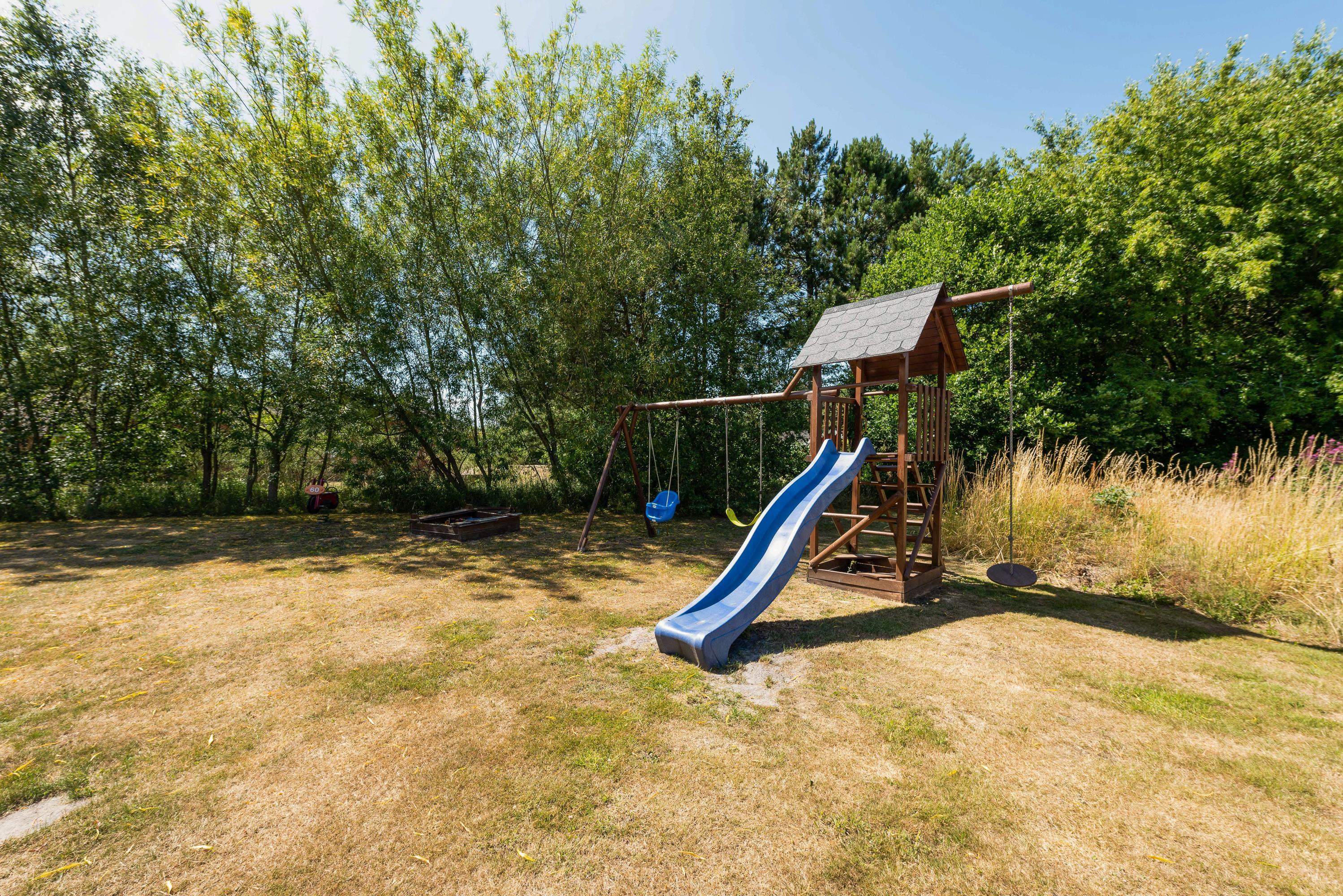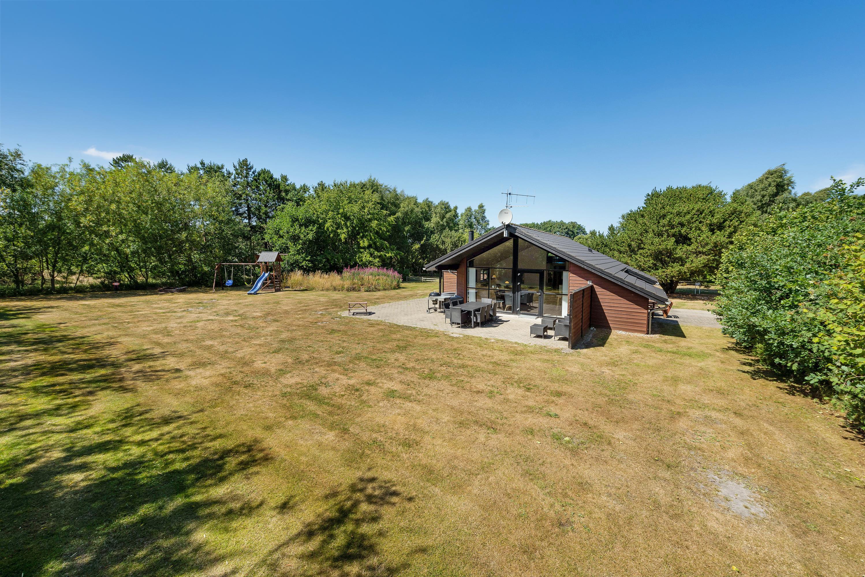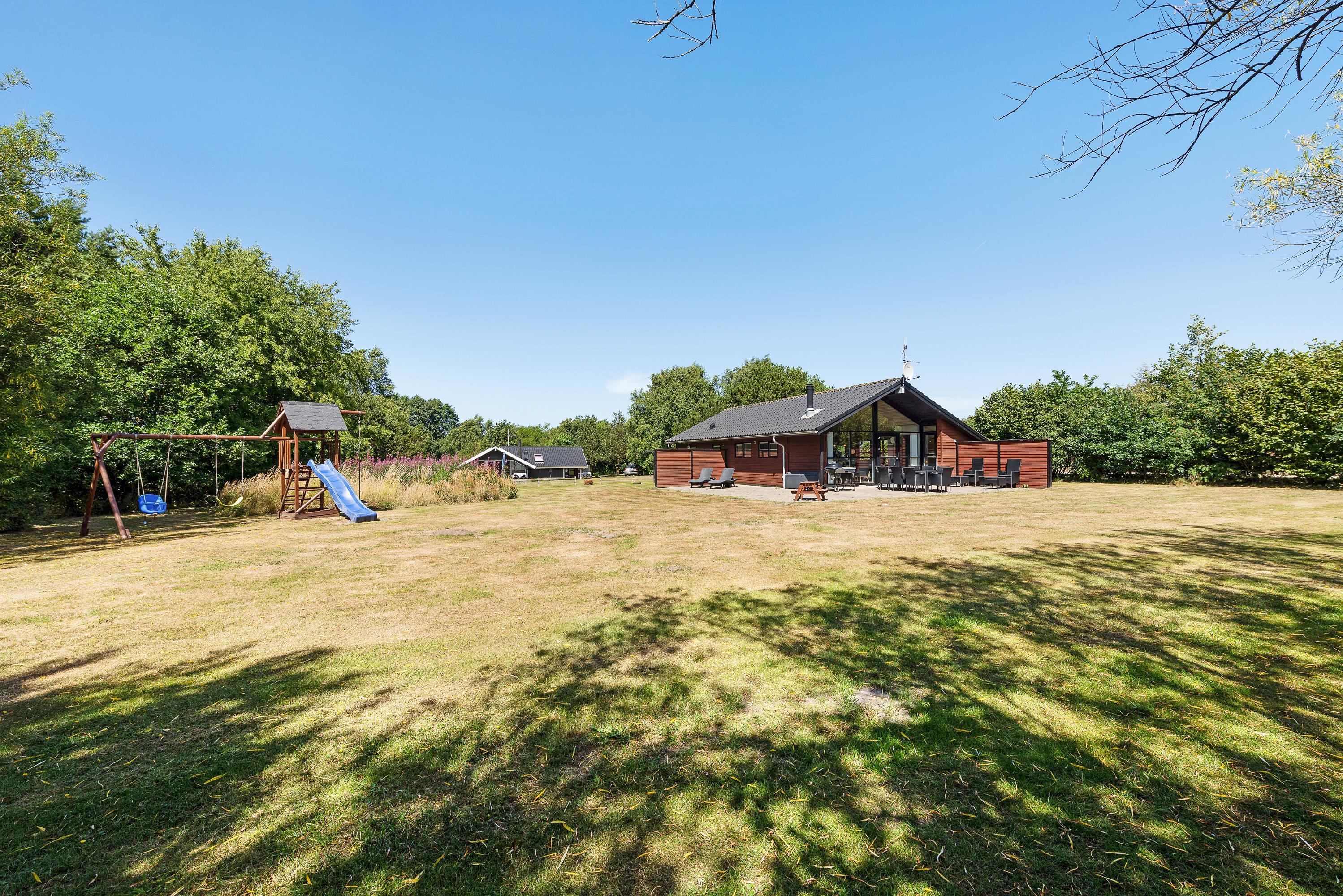 Huset har en skøn beliggenhed midt i den flotte natur, og hele vejen rundt om huset går en stor græsplæne, hvor børnene kan få lov at lege eller spille en omgang fodbold. Der er både gyngestativ og rutsjebane til glæde for de mindre feriegæster.