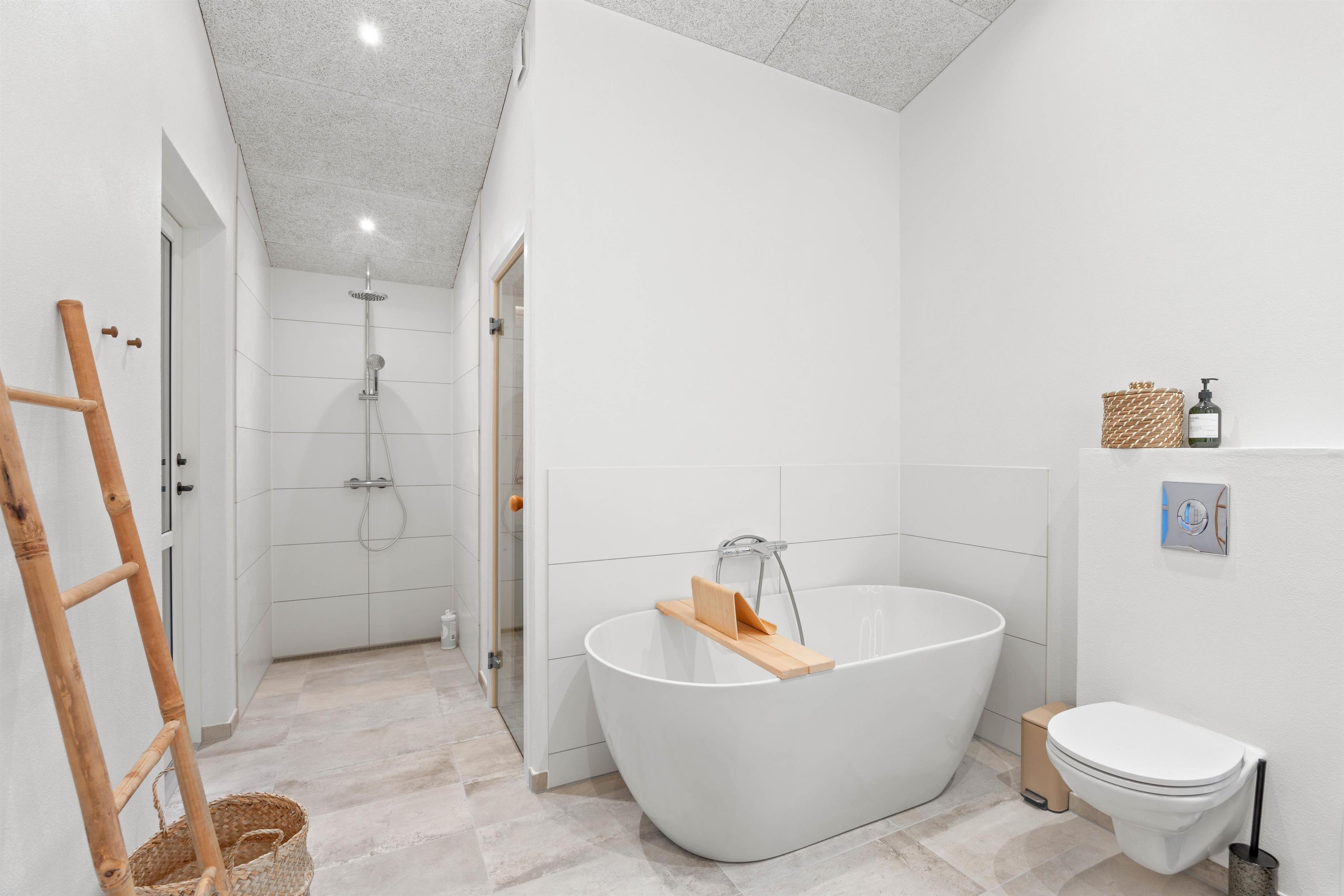 Der er adgang til 2 ud af de i alt 4 rummelige soveværelser direkte fra aktivitetsrummet, hvor begge er indrettet med komfortable dobbeltsenge, hvor I kan se frem til en god nats søvn. De sidste 2 soveværelser er placeret i henholdsvis køkkenet og gangen. Sommerhuset råder også over 2 velindrettede badeværelser; det ene lokker med et afslappende badekar og en dampende sauna, hvor I kan belønne jer selv med lidt ekstra luksus og velvære under ferien.
