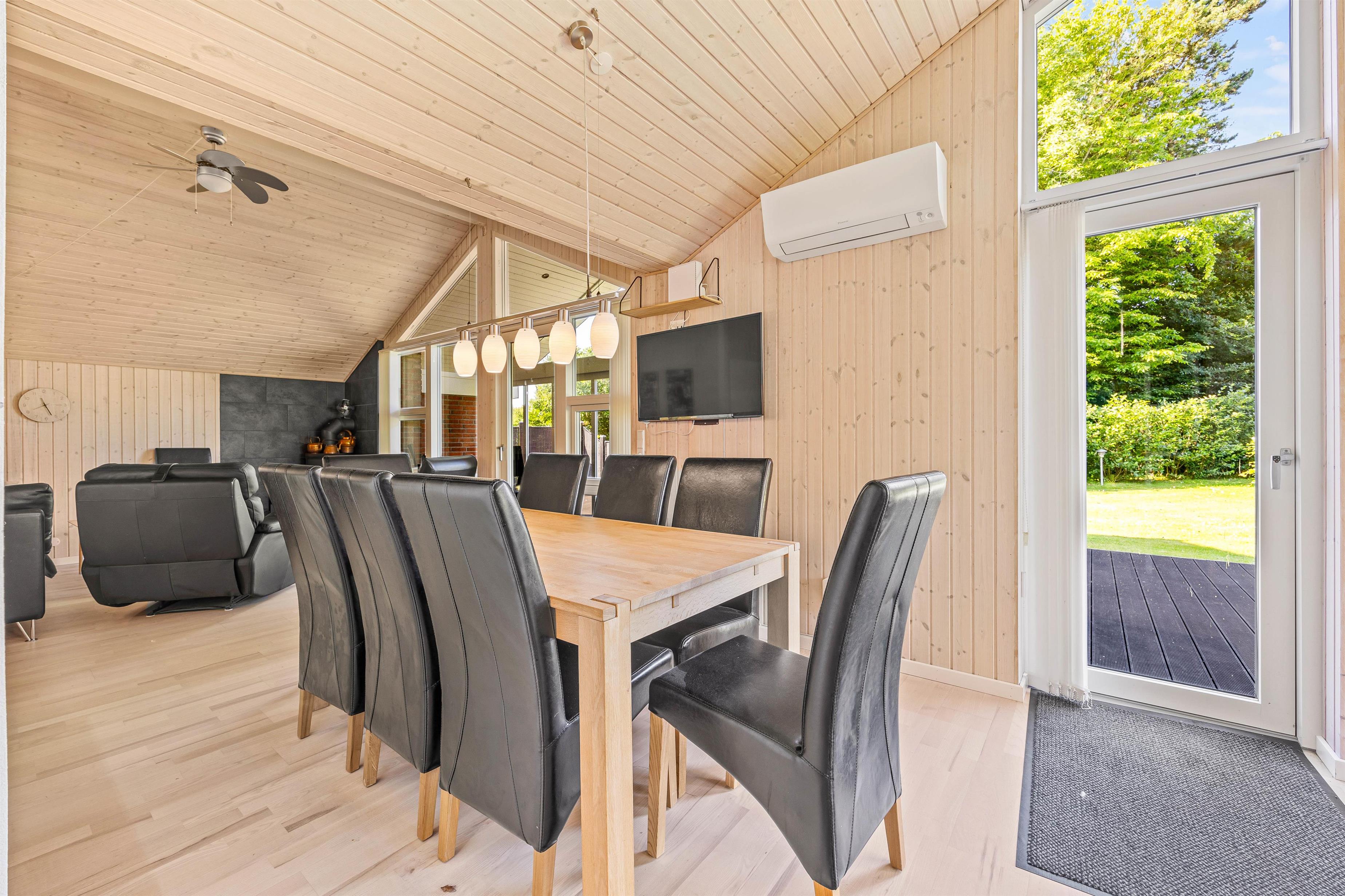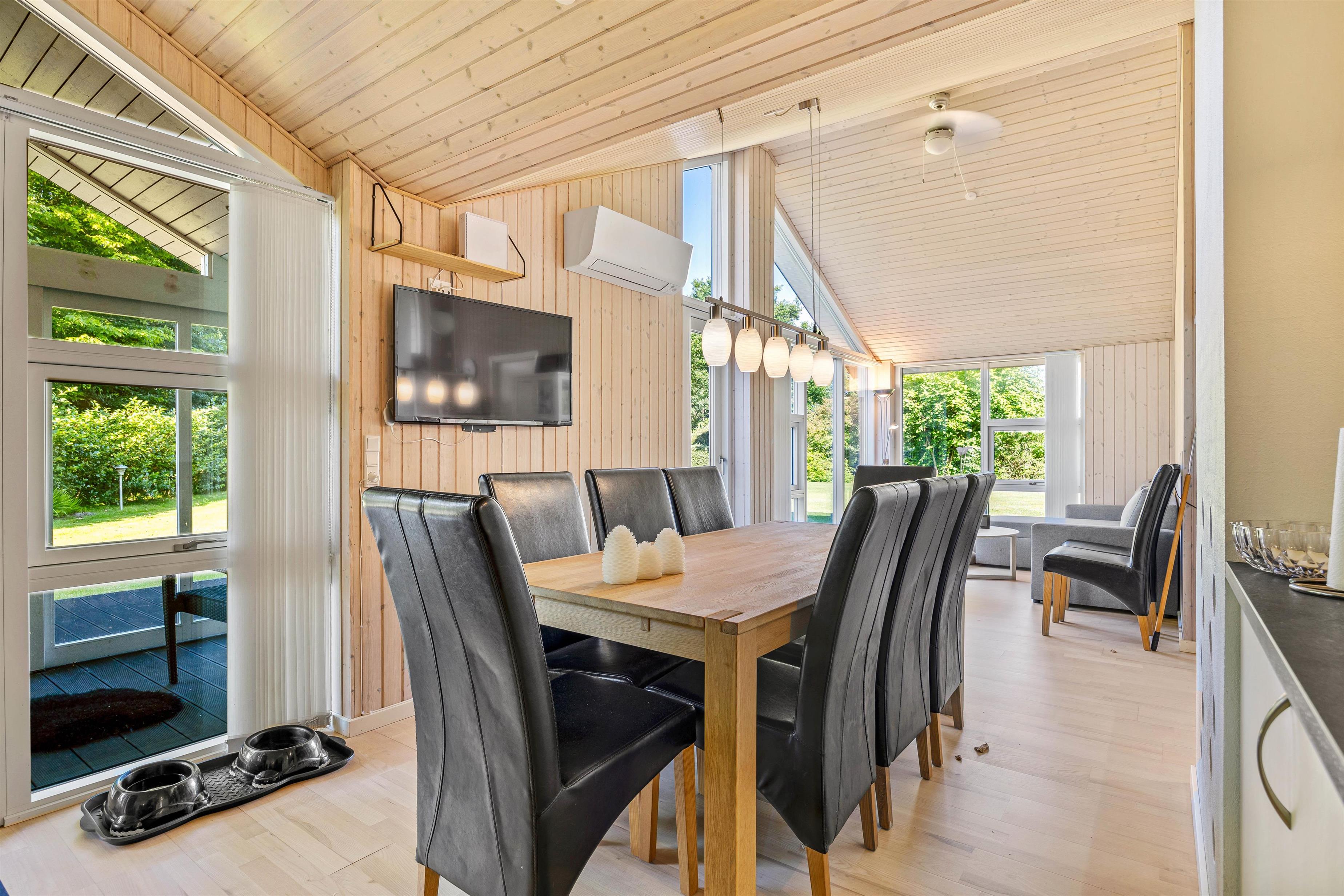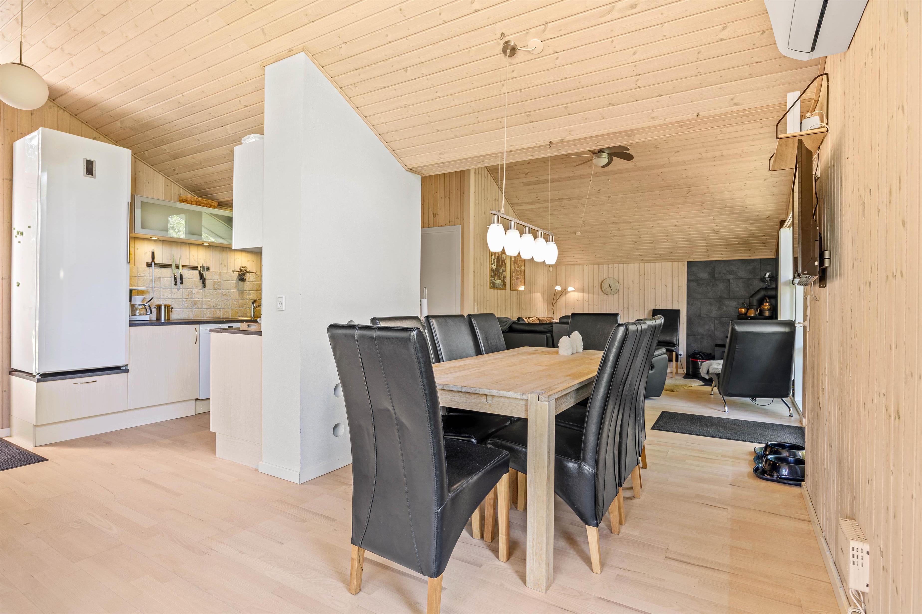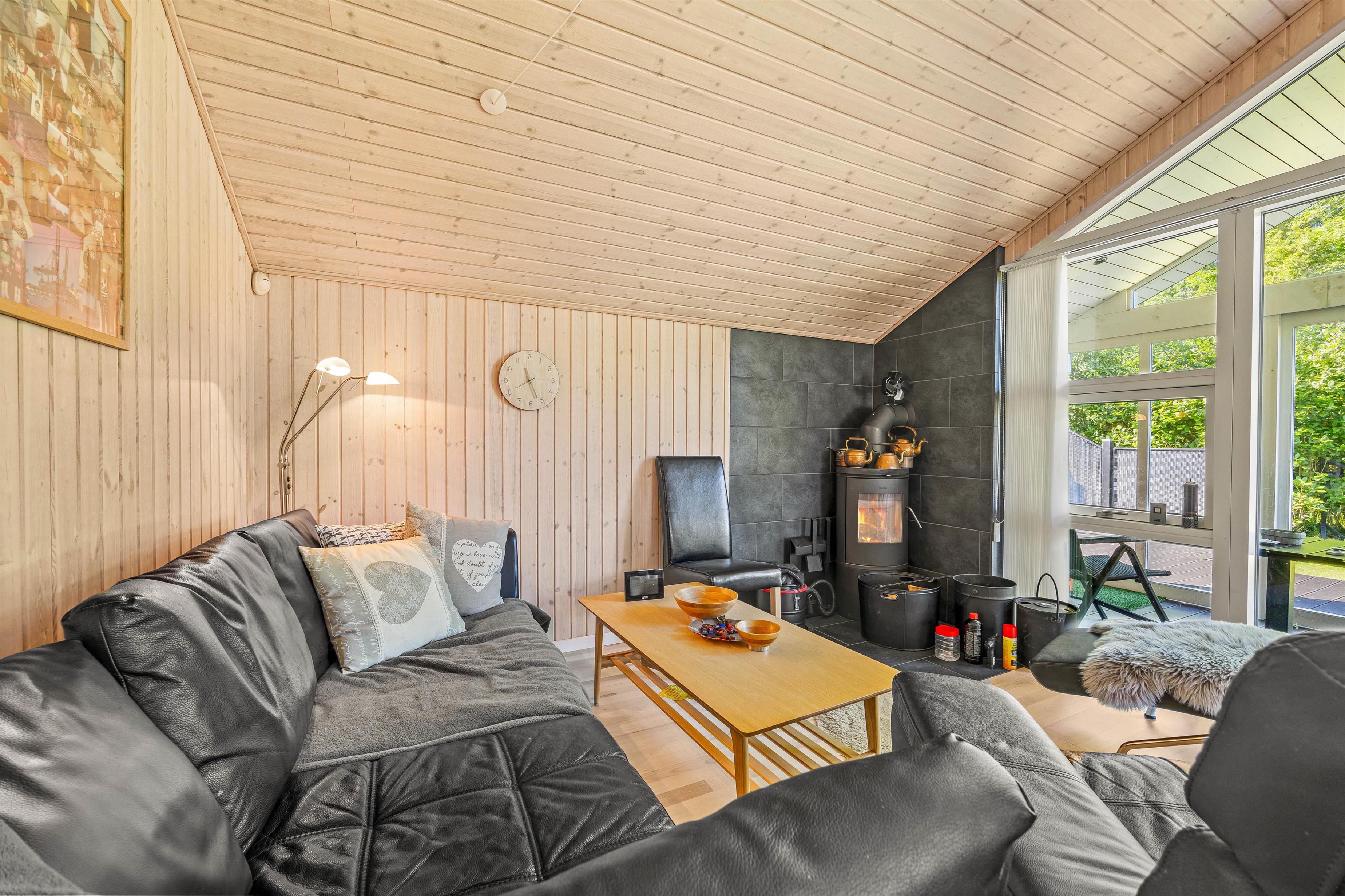 Den åbne planløsning, som kombinerer køkken, spisestue og stue, gør det nemt at holde samtalen kørende, mens brændeovnen i stuen sørger for varme og hygge på kølige aftener. Stuen er også udstyret med Chromecast, så du kan streame dine yndlingsserier og film. Fjernsynet kan drejes over mod stuen, så alle kan nyde det, uanset hvor de sidder. Store vinduer i stuen slipper masser af naturligt lys ind og giver et smukt udsyn ud over den omgivende natur. Fra stuen kan I træde ud i en hyggelig udestue.