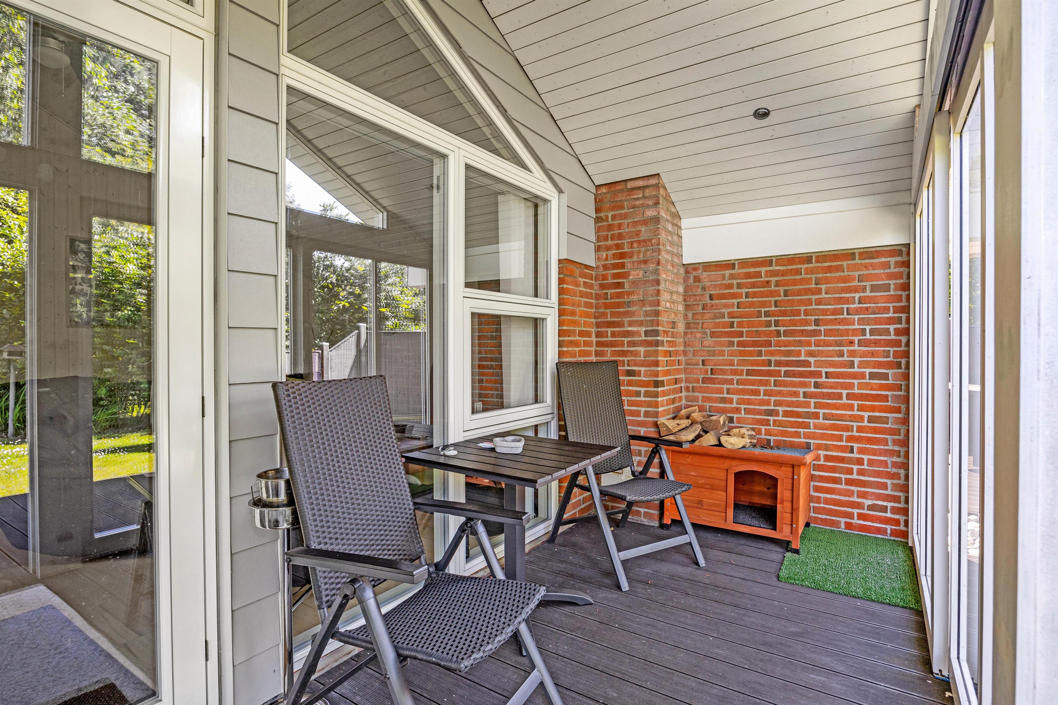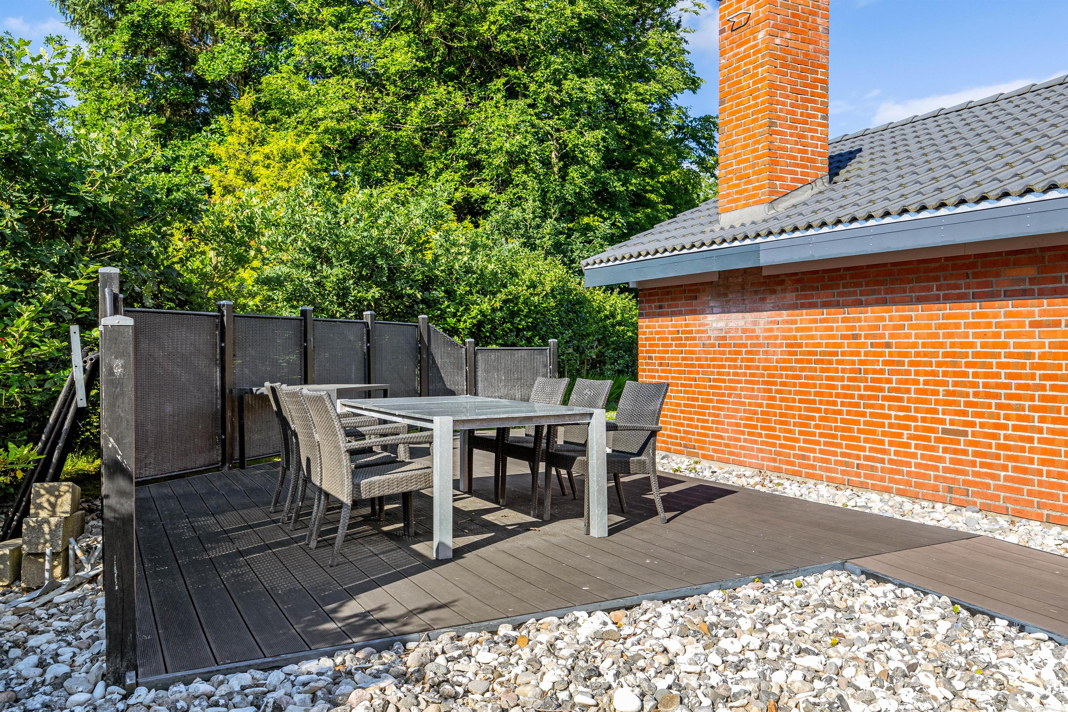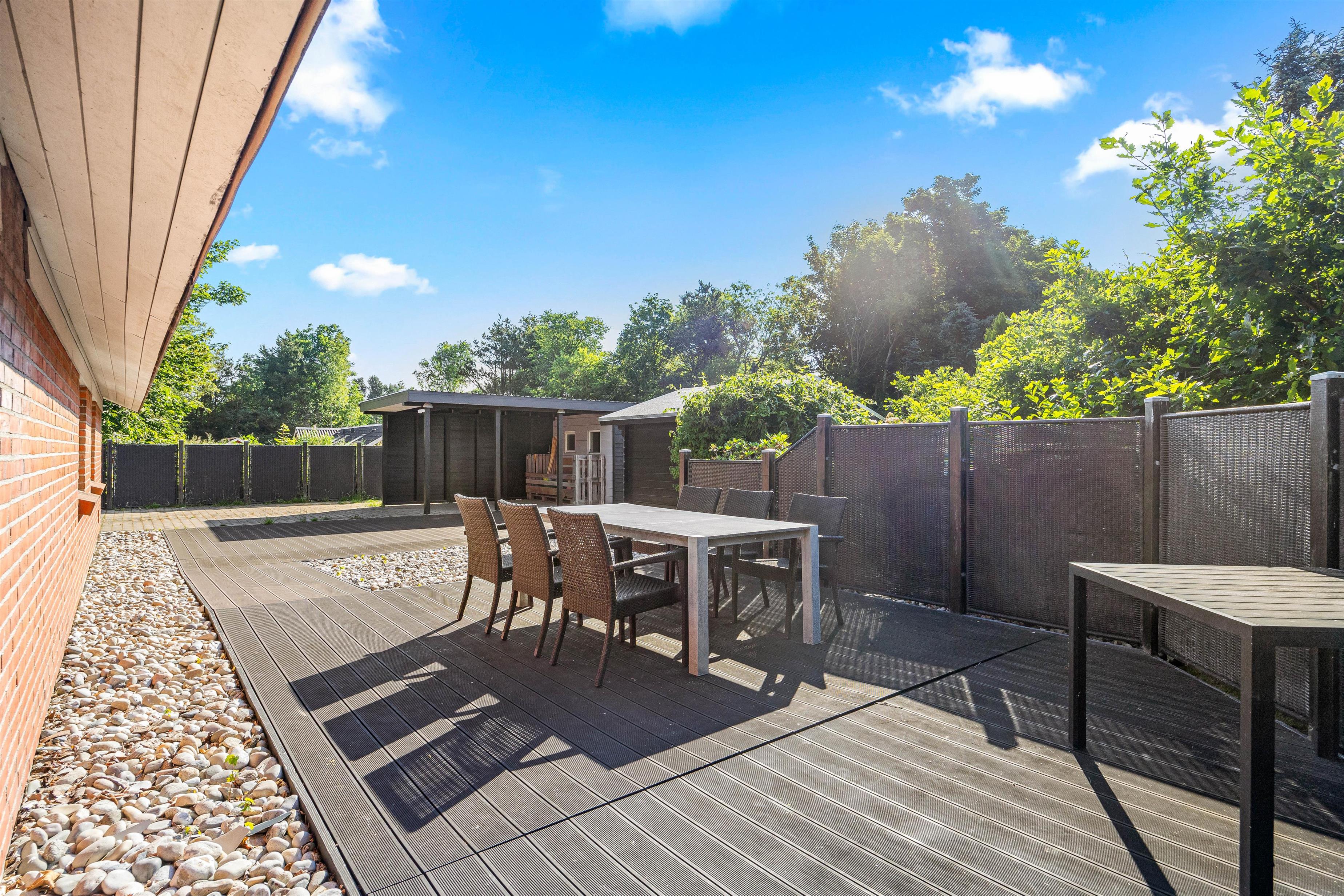 Der er desuden en afskærmet del af terrassen, som giver mulighed for privatliv og læ for vinden. Om aftenen kan I samles omkring grillen og nyde en hyggelig middag under åben himmel.