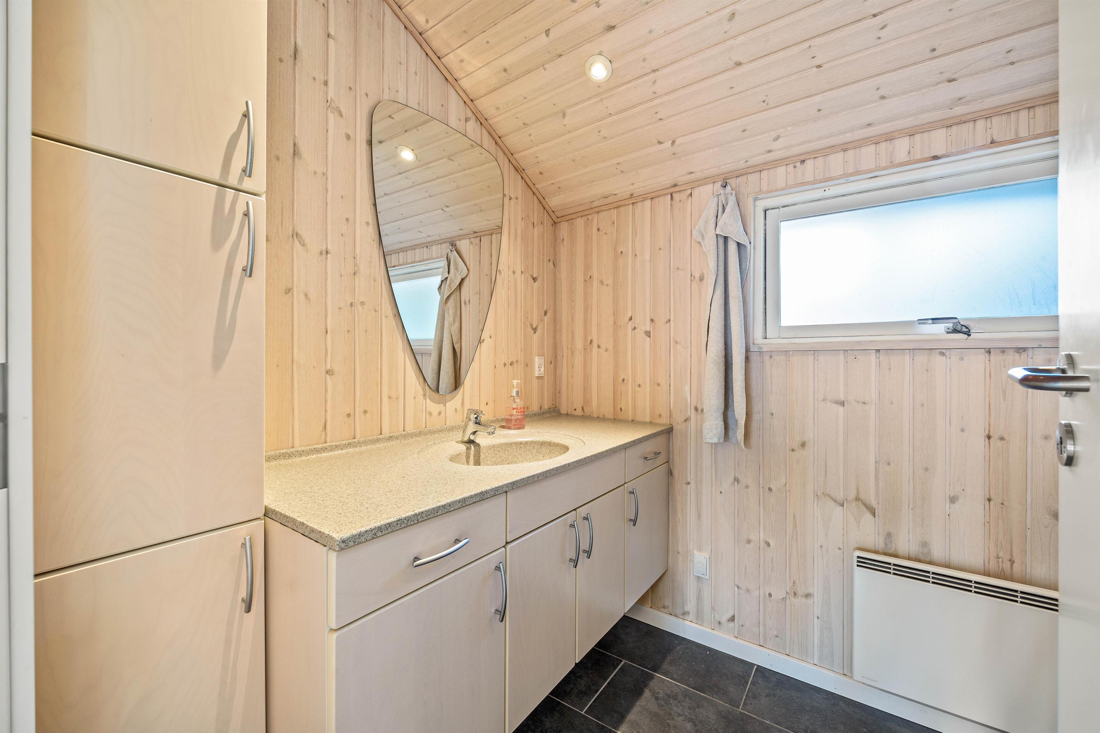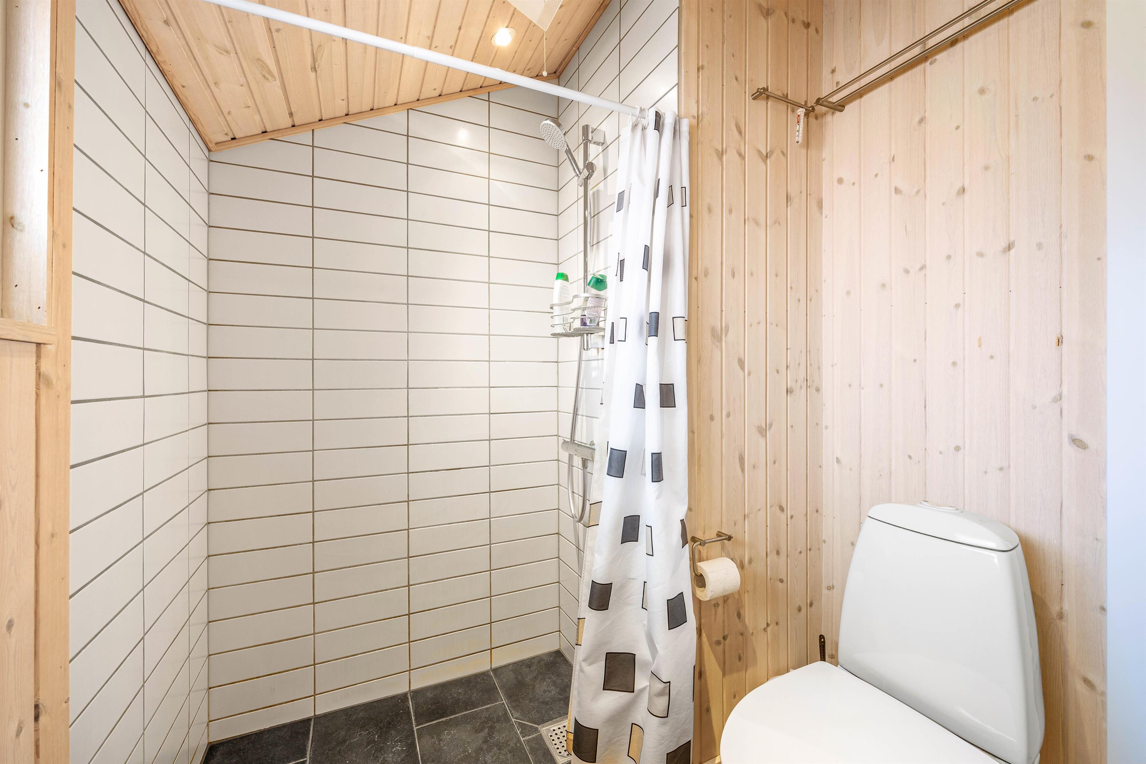 Badeværelset er udstyret med gulvvarme, hvilket sikrer, at du altid har en behagelig start på dagen. Yderligere faciliteter inkluderer en vaskemaskine og tørretumbler, som gør længere ophold mere bekvemme.