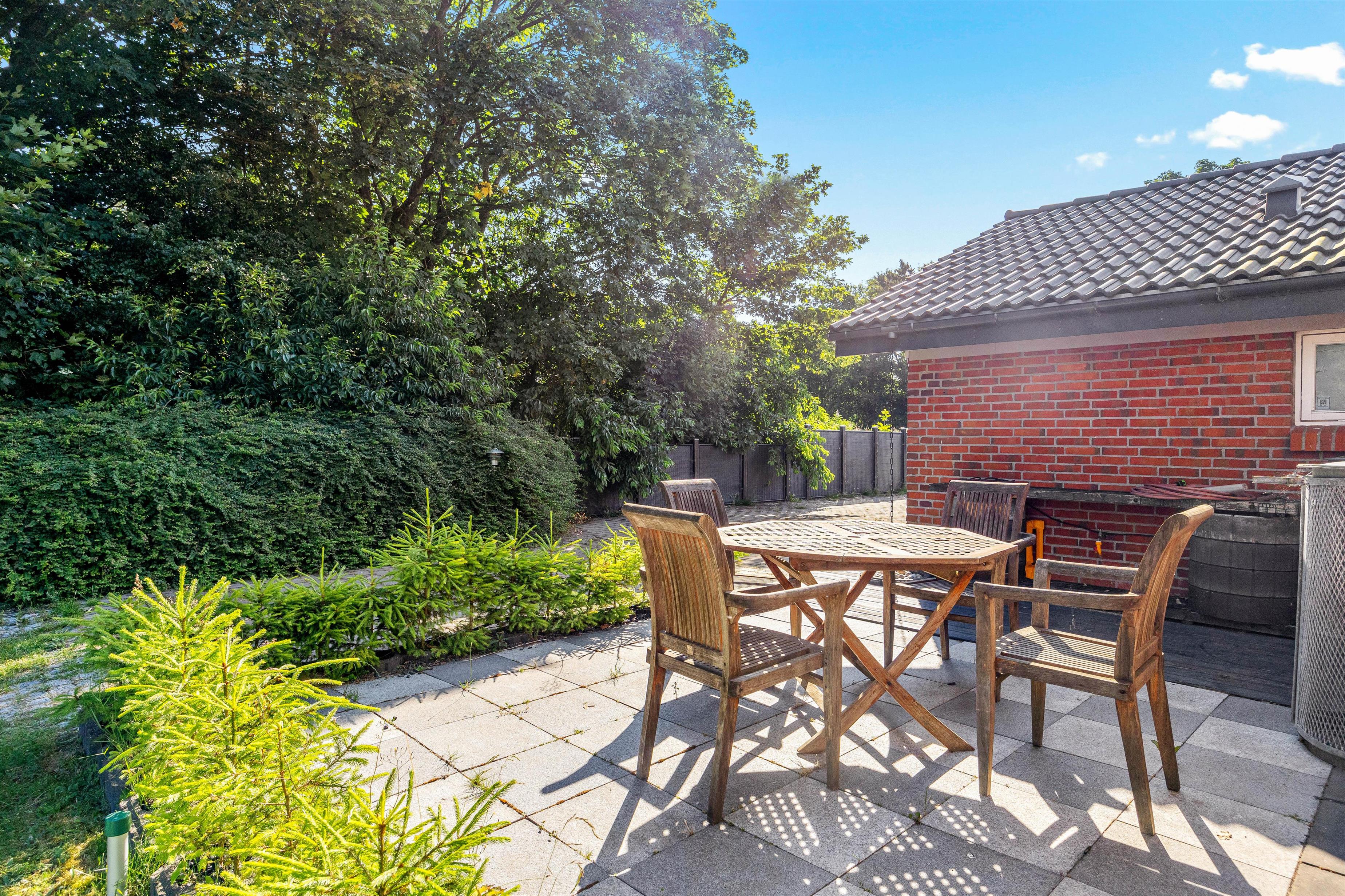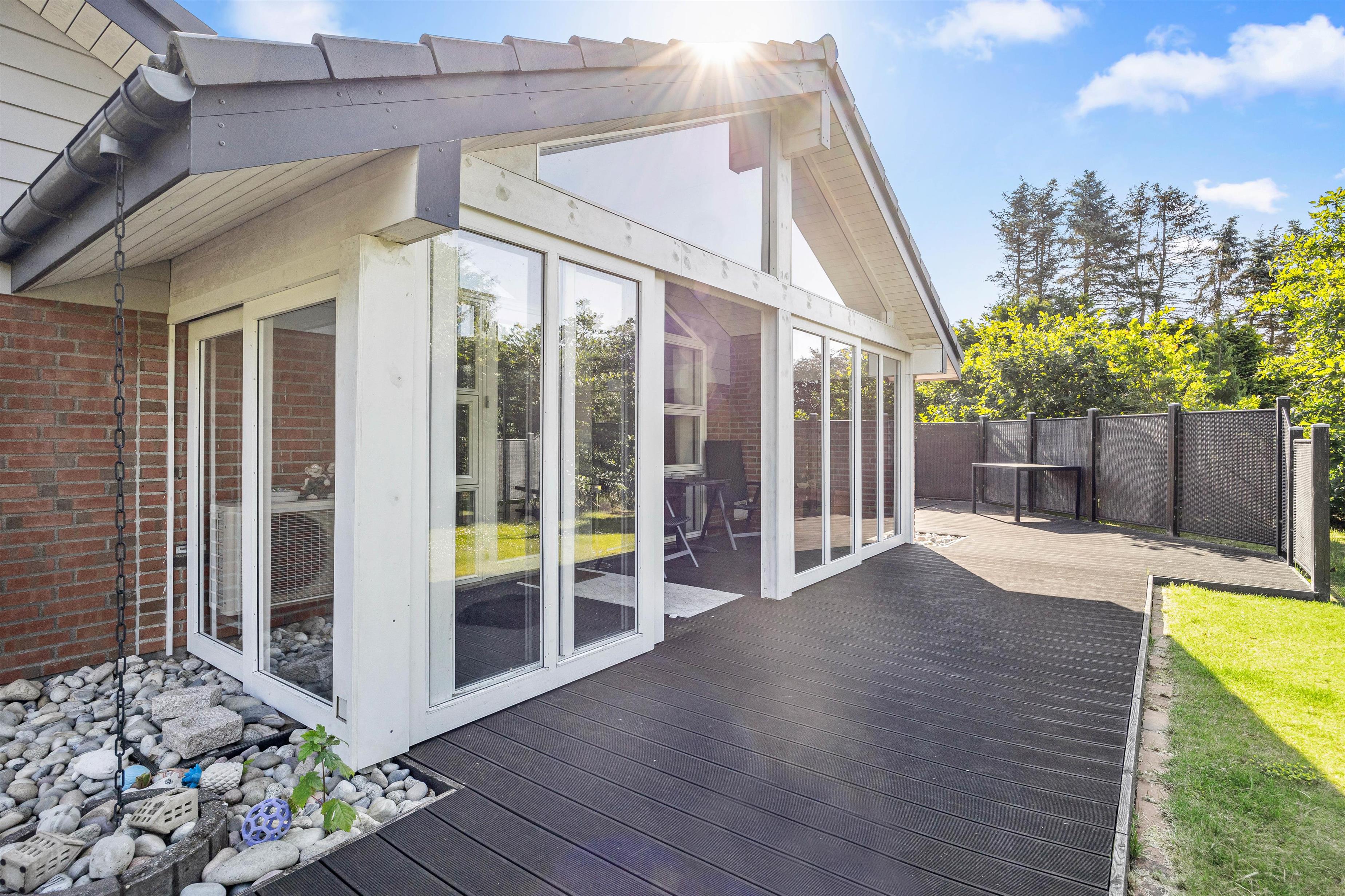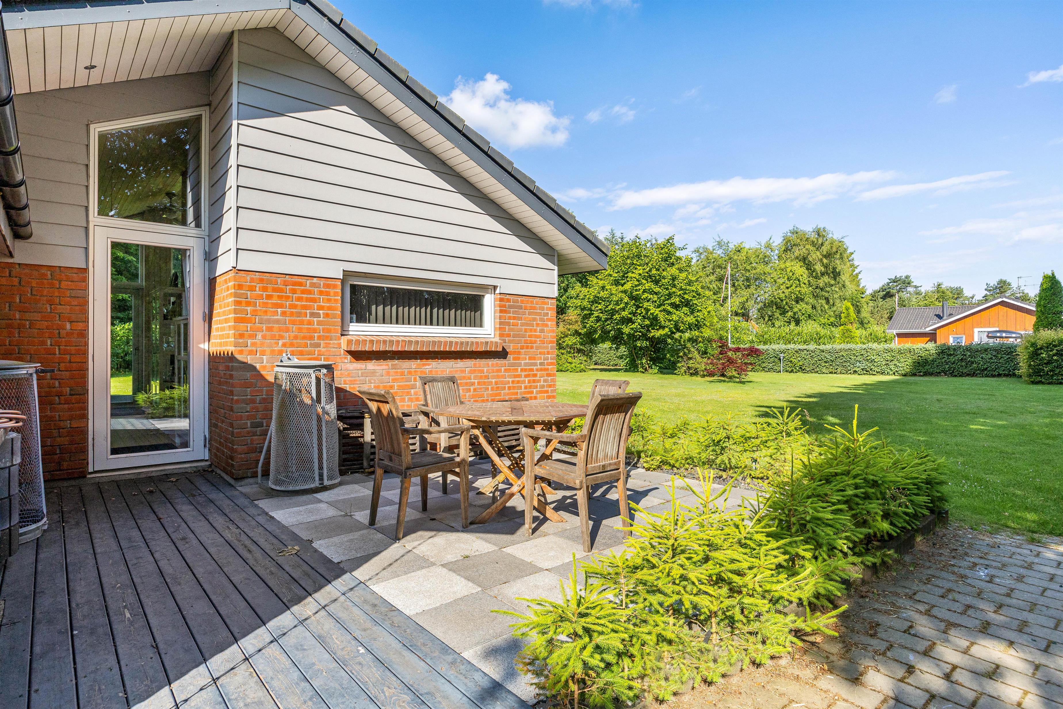 Fra udestuen har I direkte adgang til den store indhegnede plænegrund på 1600m2, som giver masser af plads til leg og afslapning. Børn og kæledyr vil elske at boltre sig på den store græsplæne, hvor der er rigelig plads til leg, boldspil og andre udendørs aktiviteter. Den åbne og afskærmede terrasse er udstyret med havemøbler og en grill, så I kan nyde måltider udendørs.