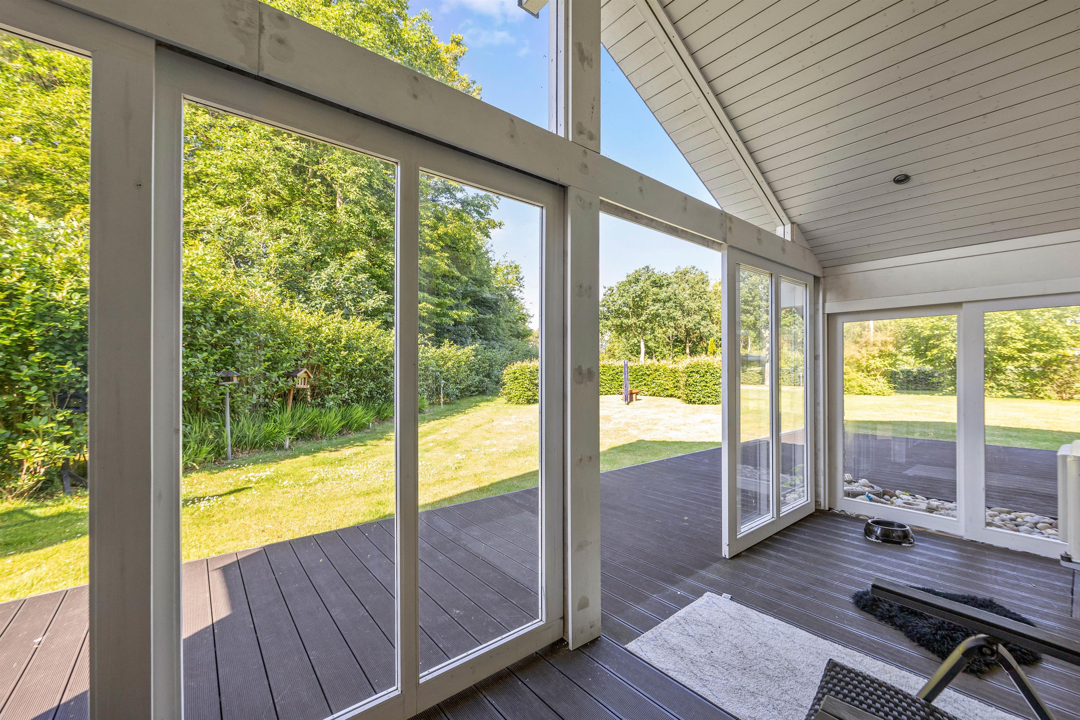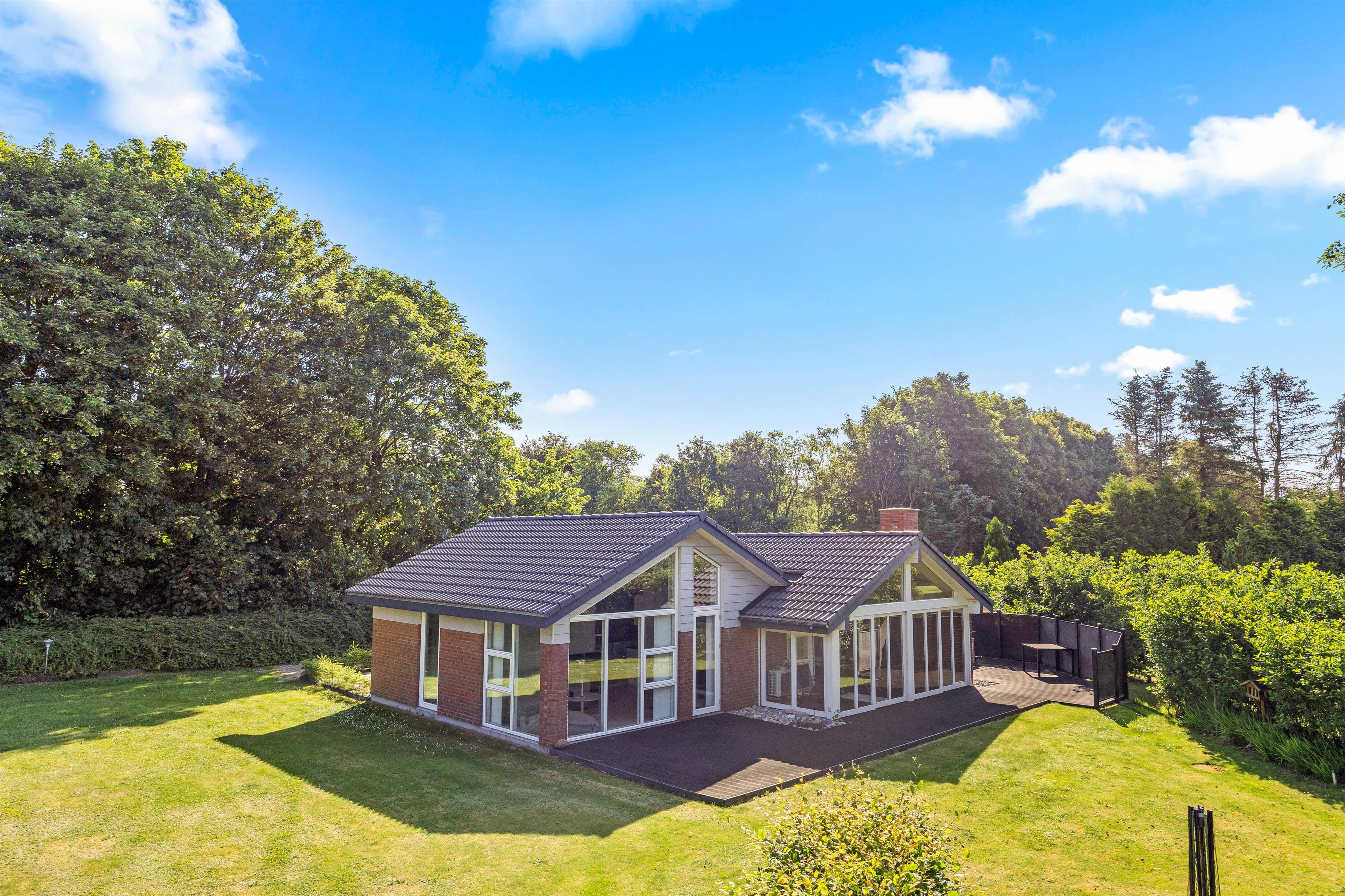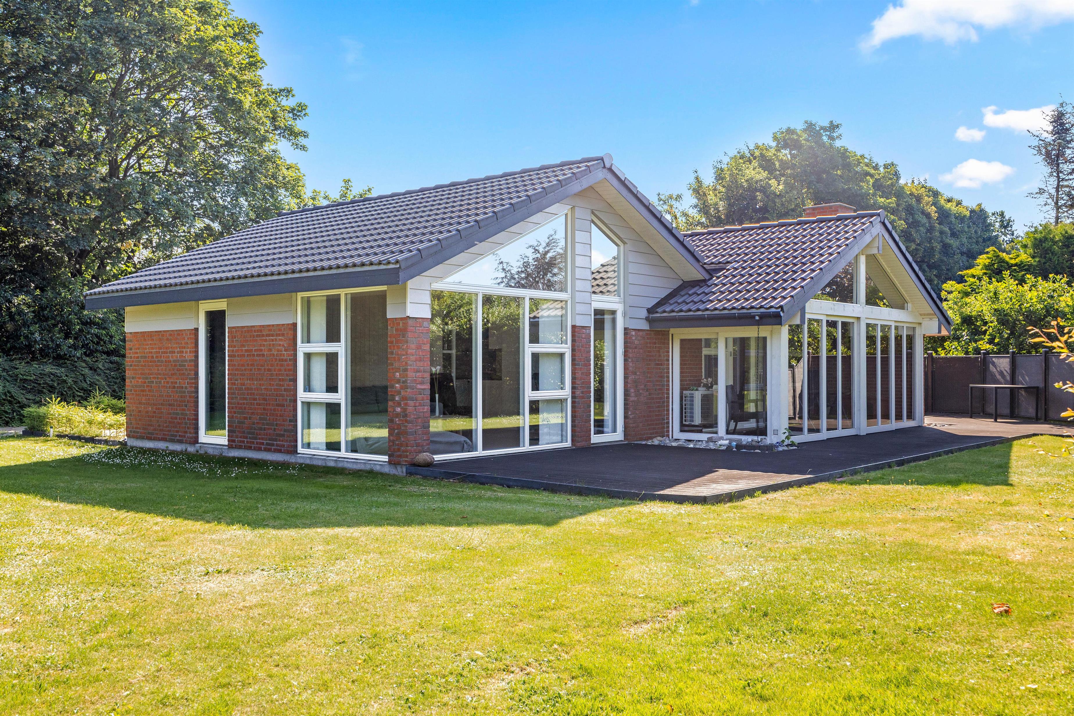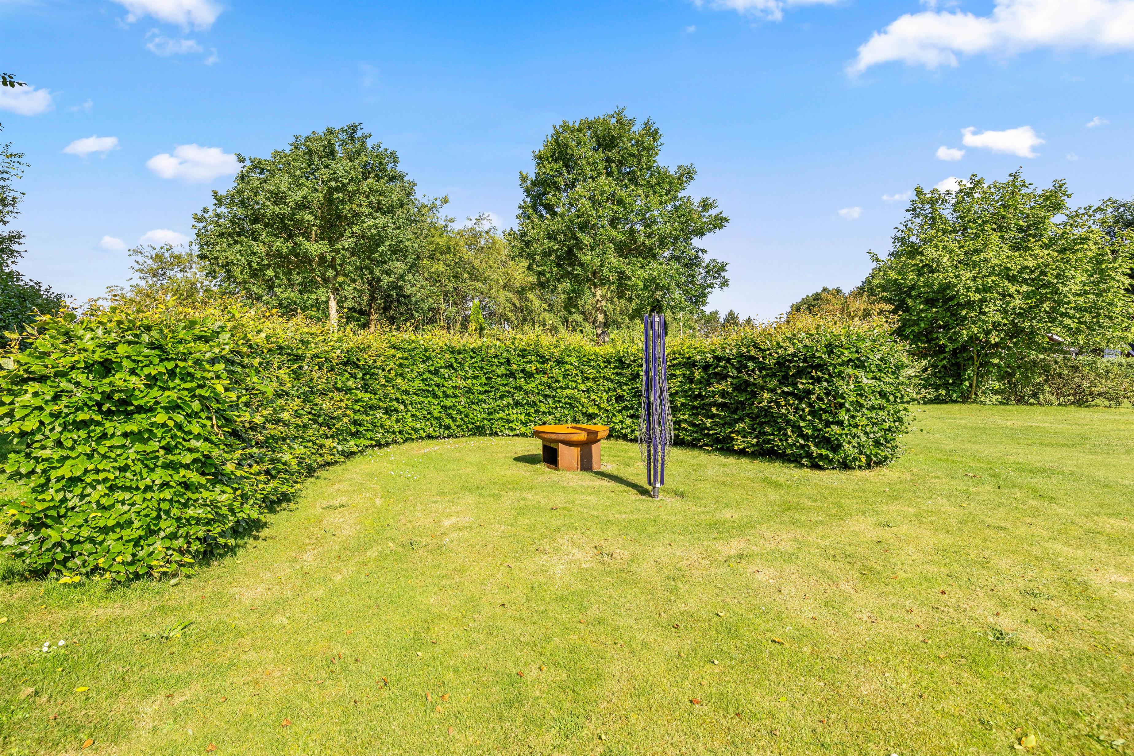 Fra udestuen har I direkte adgang til den store indhegnede plænegrund på 1600m2, som giver masser af plads til leg og afslapning. Børn og kæledyr vil elske at boltre sig på den store græsplæne, hvor der er rigelig plads til leg, boldspil og andre udendørs aktiviteter. Den åbne og afskærmede terrasse er udstyret med havemøbler og en grill, så I kan nyde måltider udendørs.