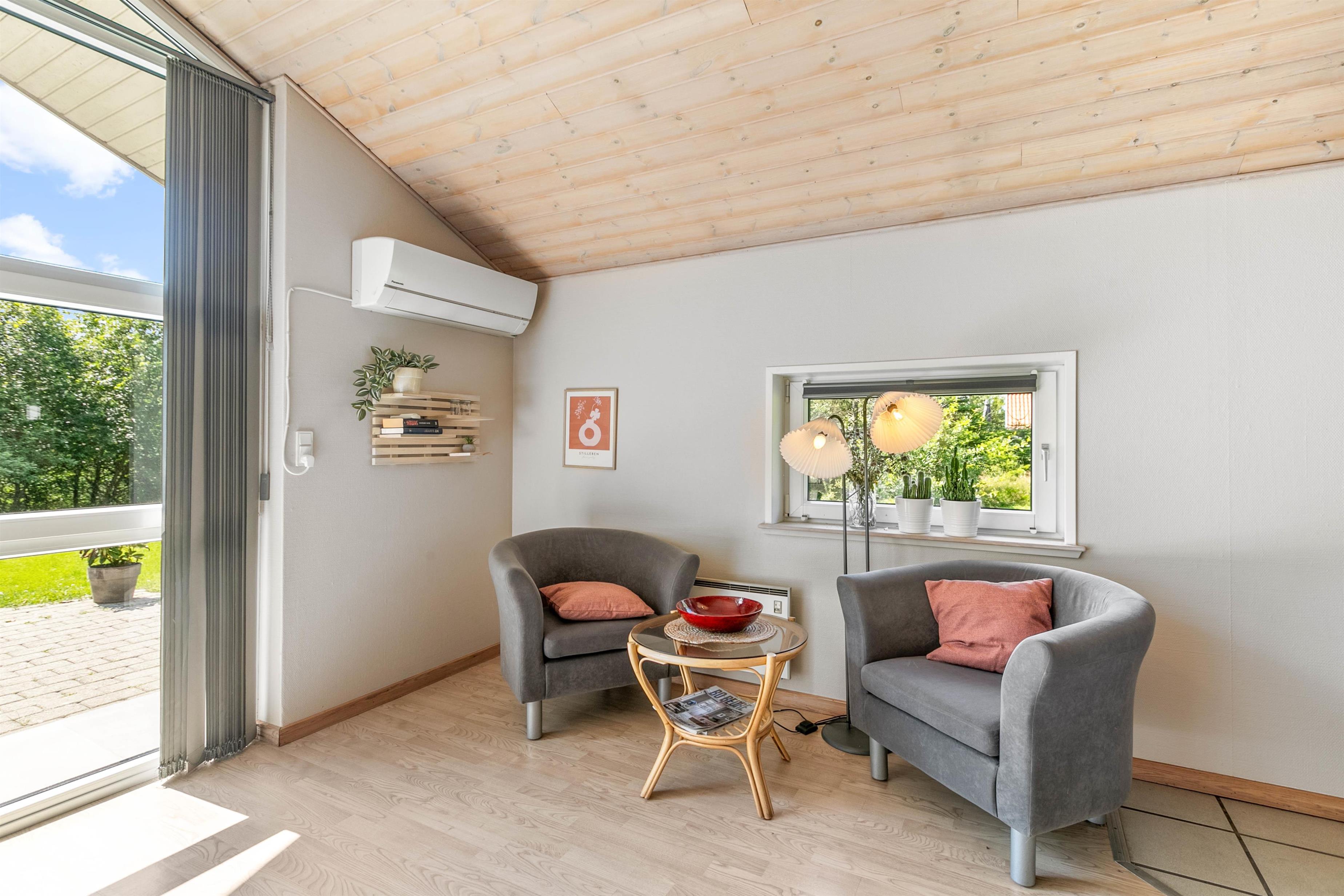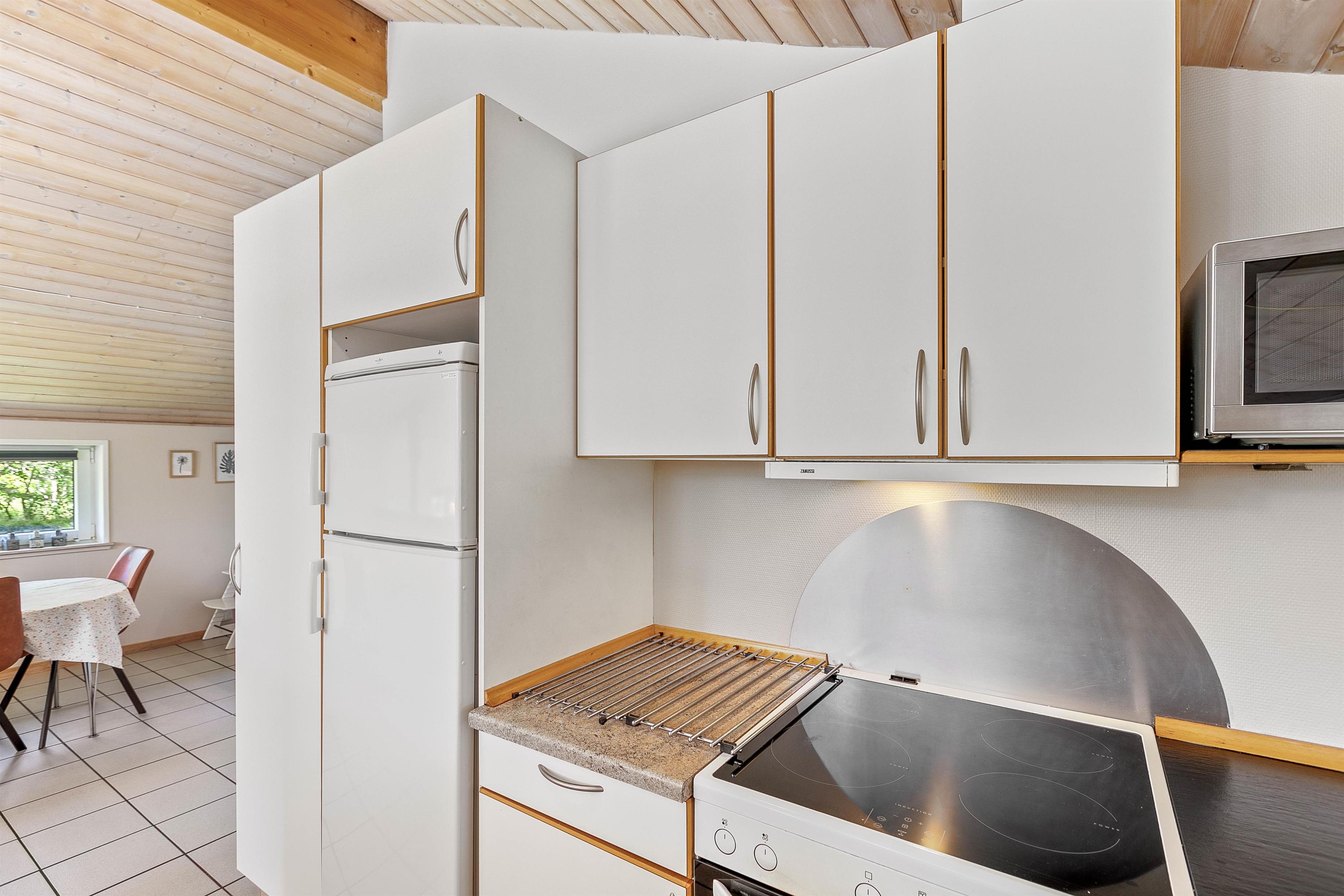 Køkkenet i sommerhuset er funktionelt og veludstyret, et perfekt sted at tilberede måltider. Den åbne planløsning mellem stue og køkken gør det nemt at opretholde hyggen, mens gryderne bobler, og oprydningen begynder at tage form.