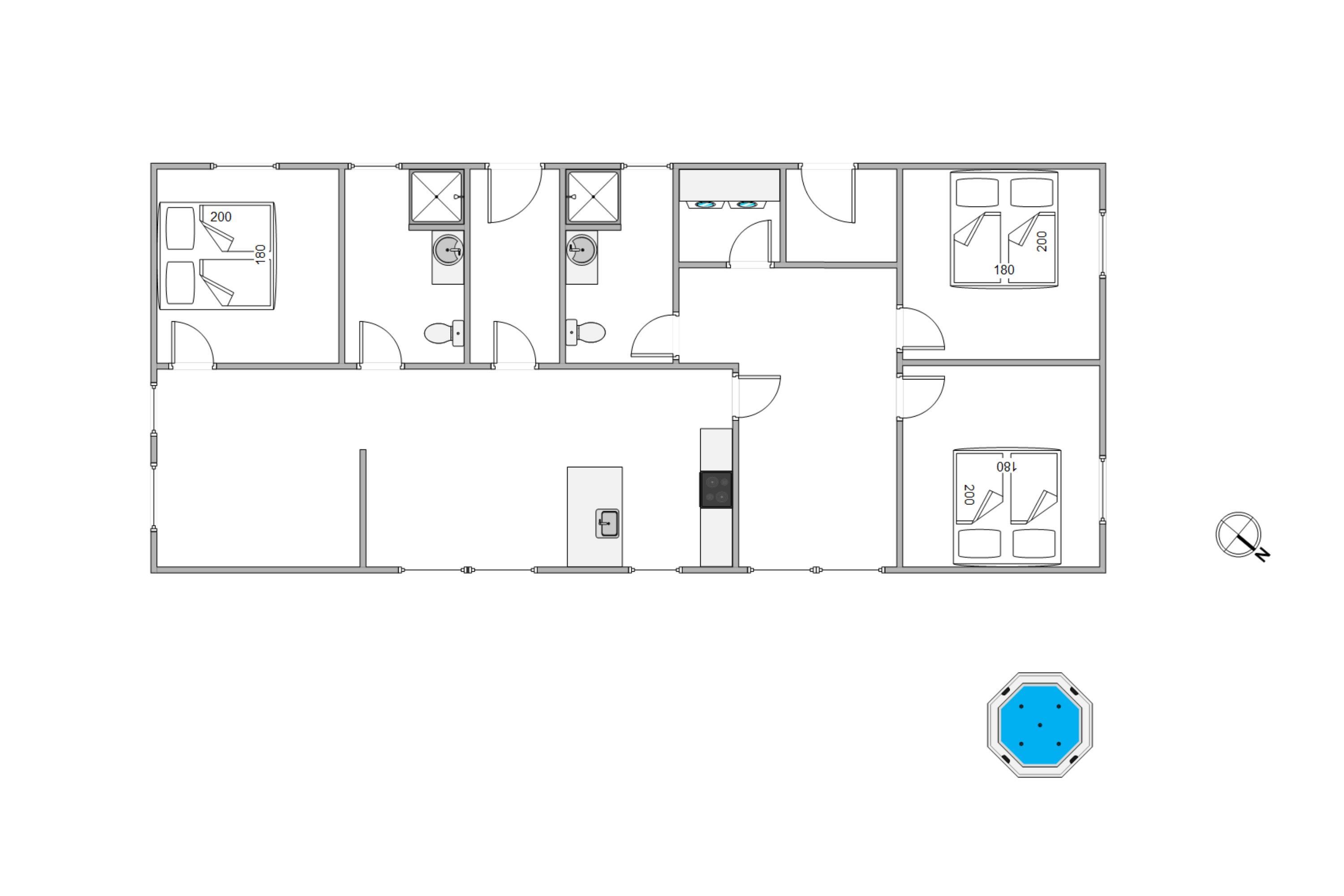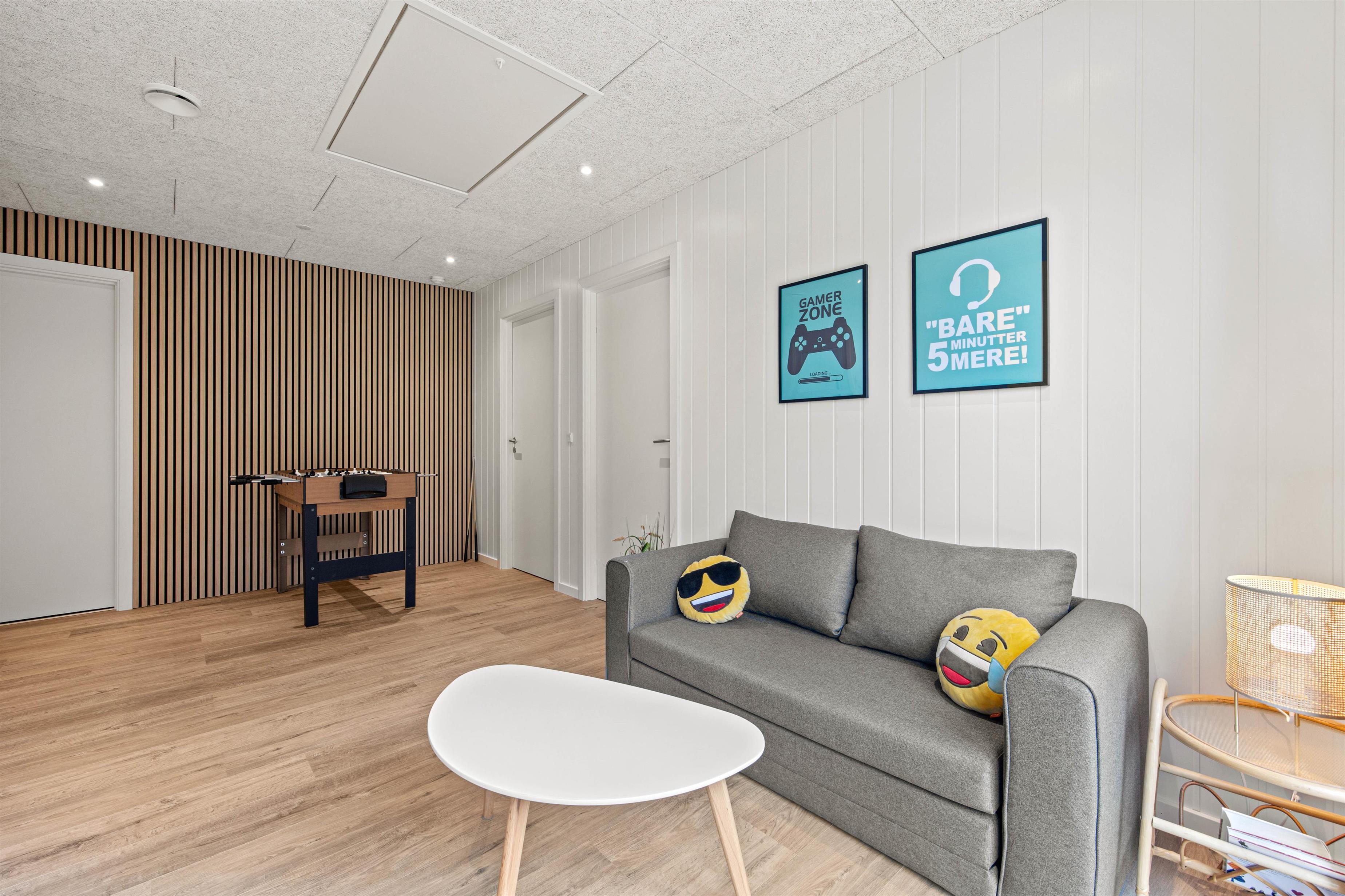 Indretningen i dette feriehus er fantastisk, hvis I rejser med børn eller unge, da alle 117 m2 er rigtig godt udnyttet. I den ene ende af huset finder I det store forældresoveværelse og 1 badeværelse, som vender ud mod stuen, og bagerst i huset er der yderligere 2 gode værelser, endnu et badeværelse og et mindre rum med vaskemaskine og tørretumbler. Aktivitetsrummet byder på en masse muligheder for underholdning med blandet PlayStation, bordtennis, bordfodbold, billard og meget mere.