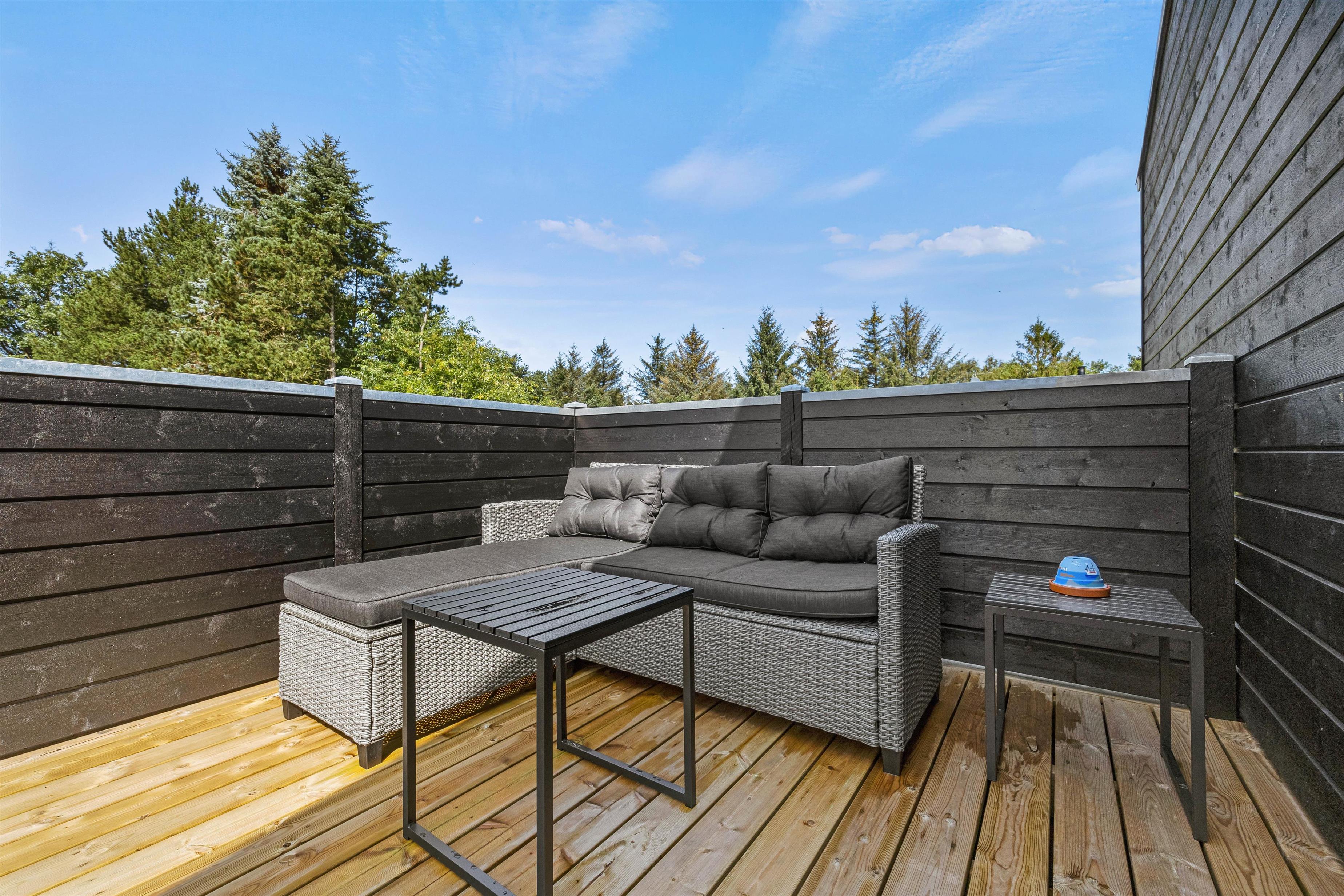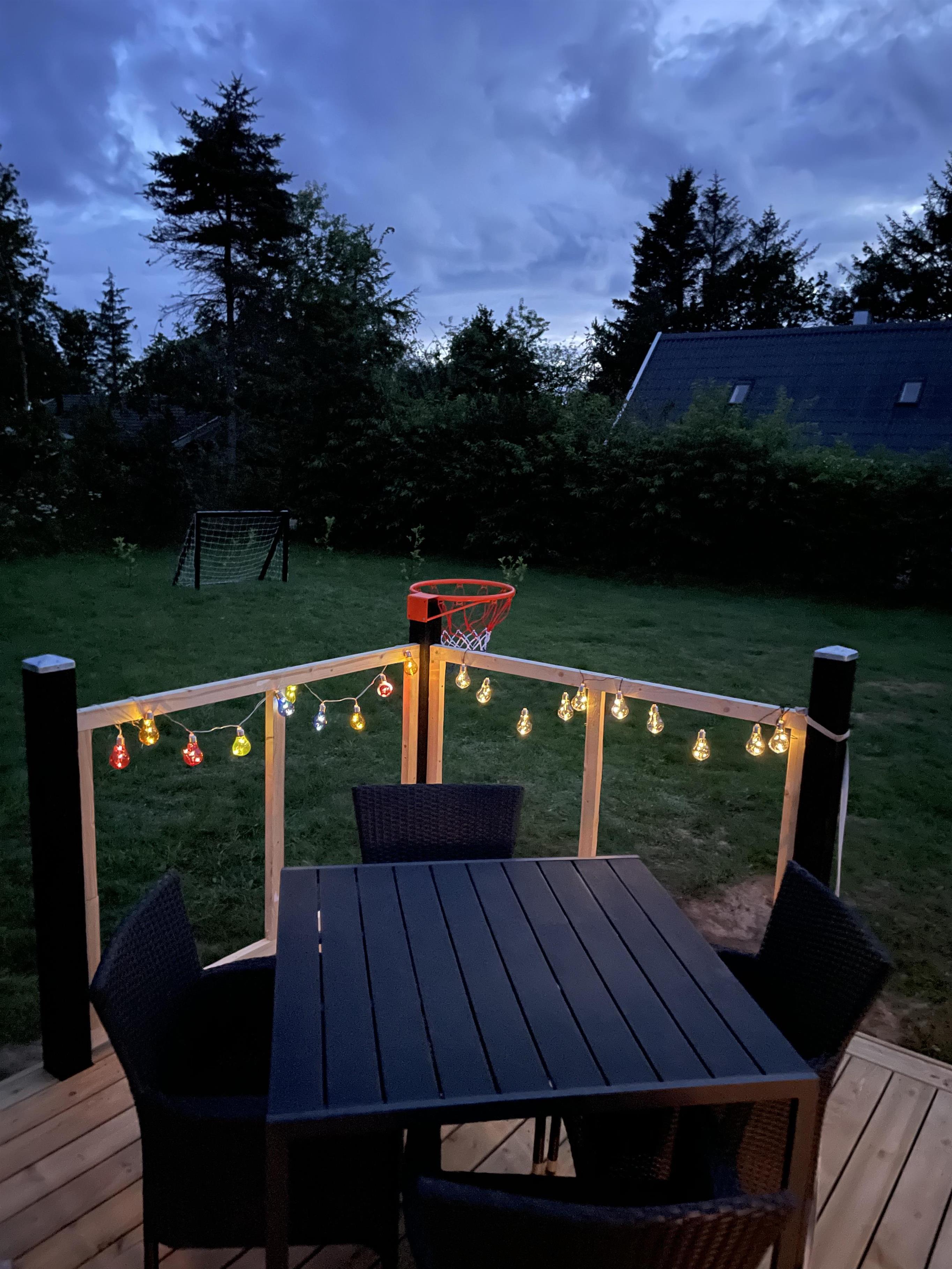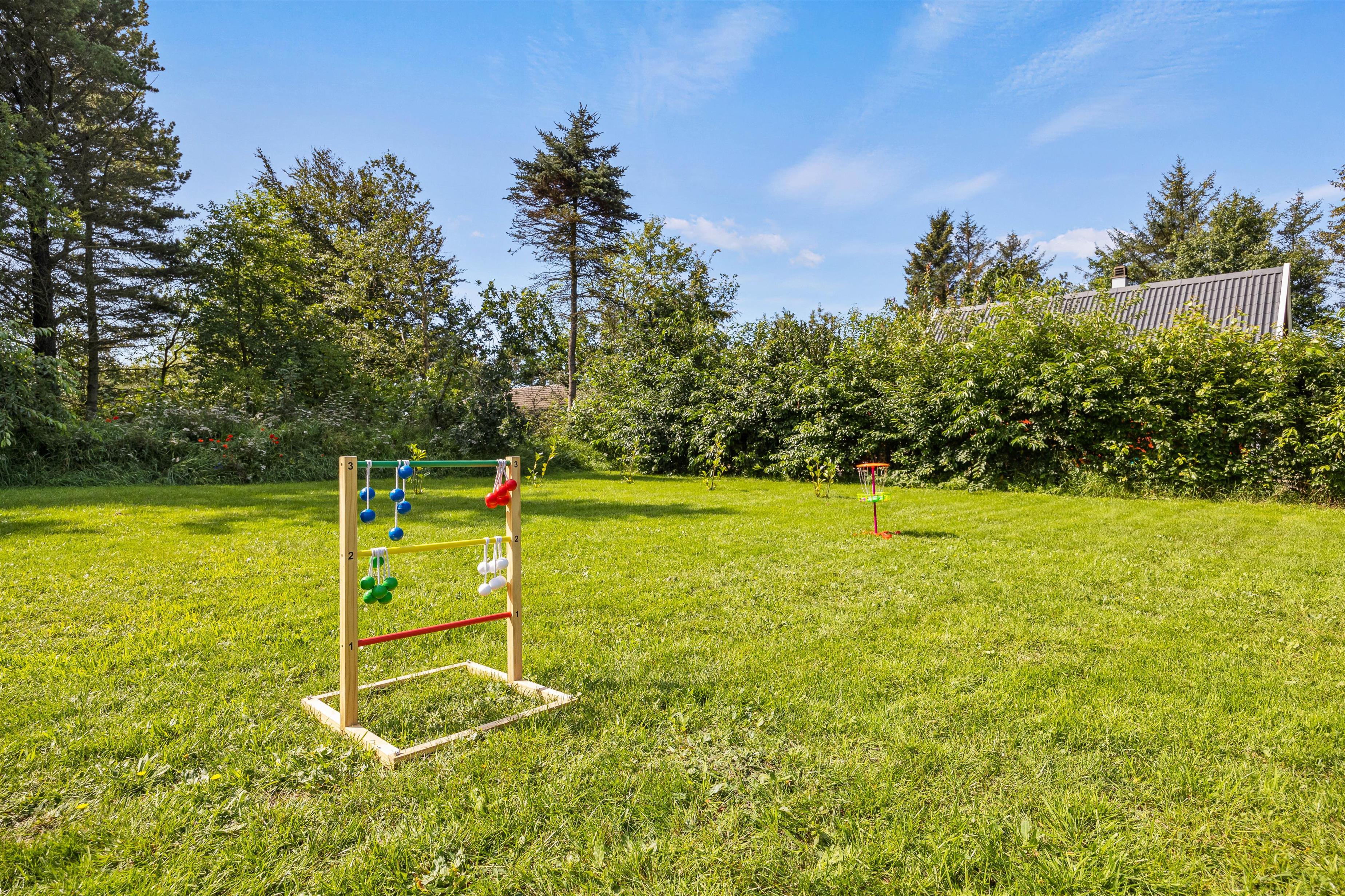 Der er en sandkasse, til børnene og plænen indbyder til hygge og konkurrencer, som bland andet boldspil, stigegolf og kongespil. I haven er der et lille hjørne med bålplads, til alle børns store glæde. Den store terrasse er veludstyret med komfortable havemøbler, liggestole til at slappe af på og en parasol til at skærme jer mod solen. I kan også tilberede jeres aftensmad på gasgrillen og nyde en lækker grillaften sammen.