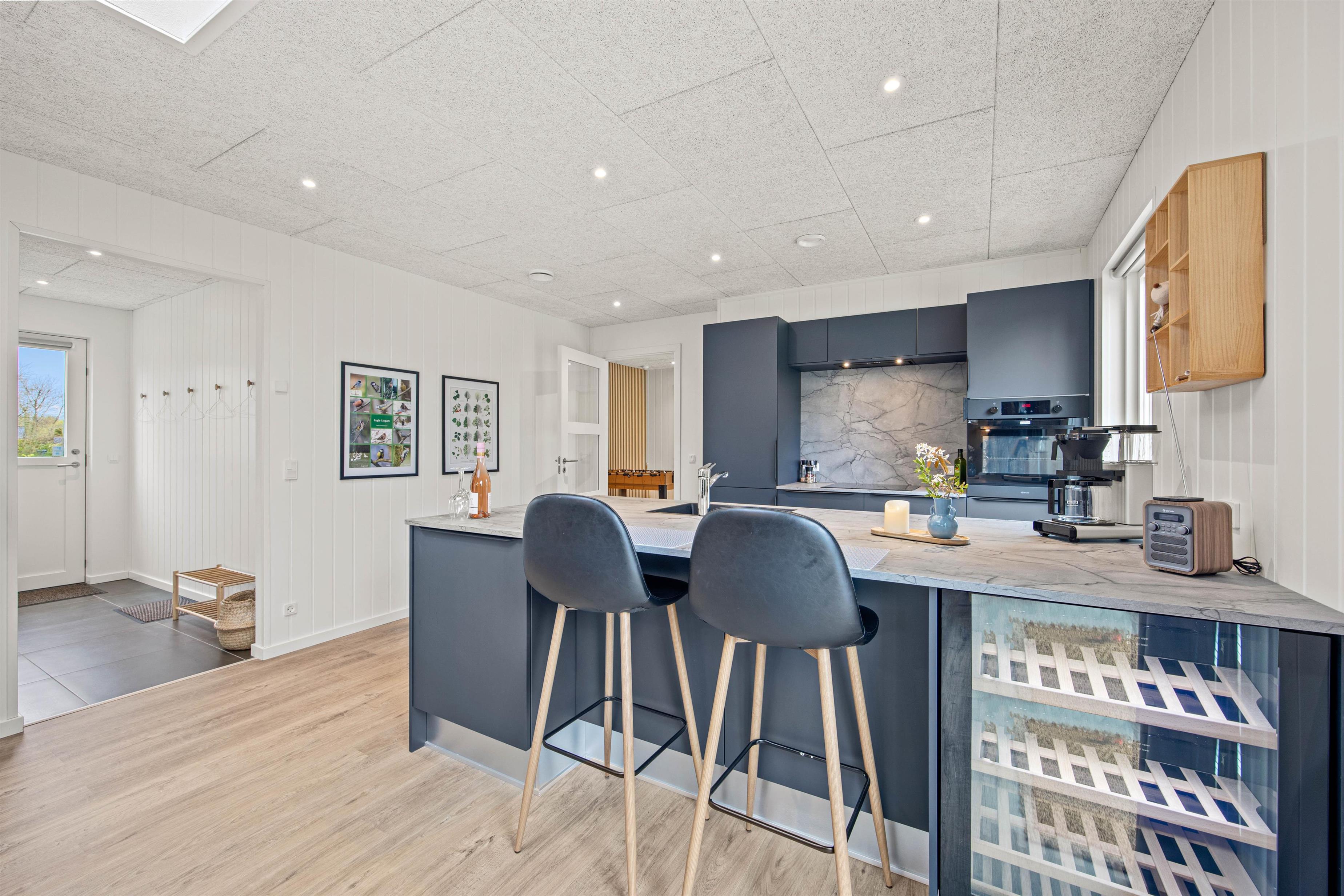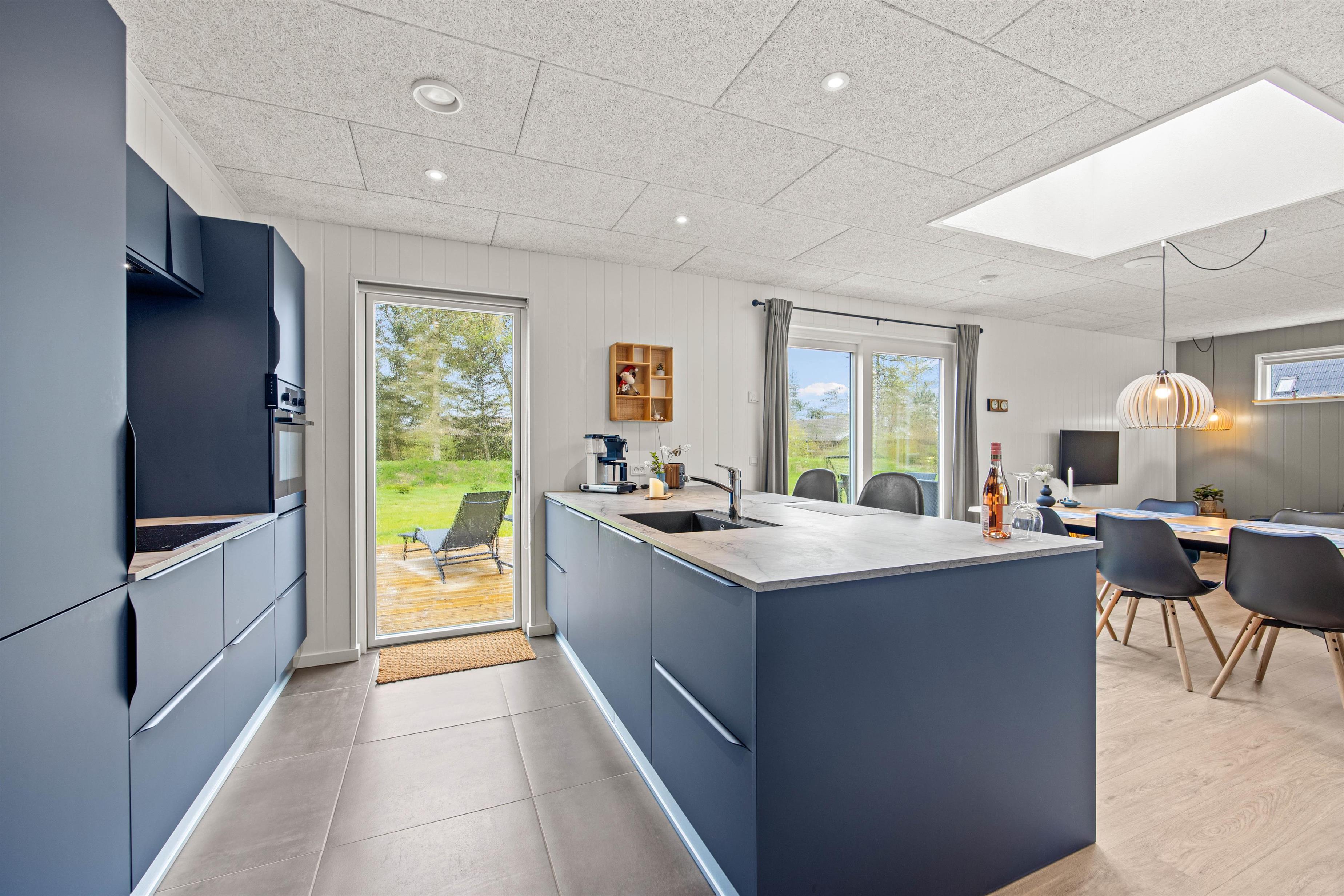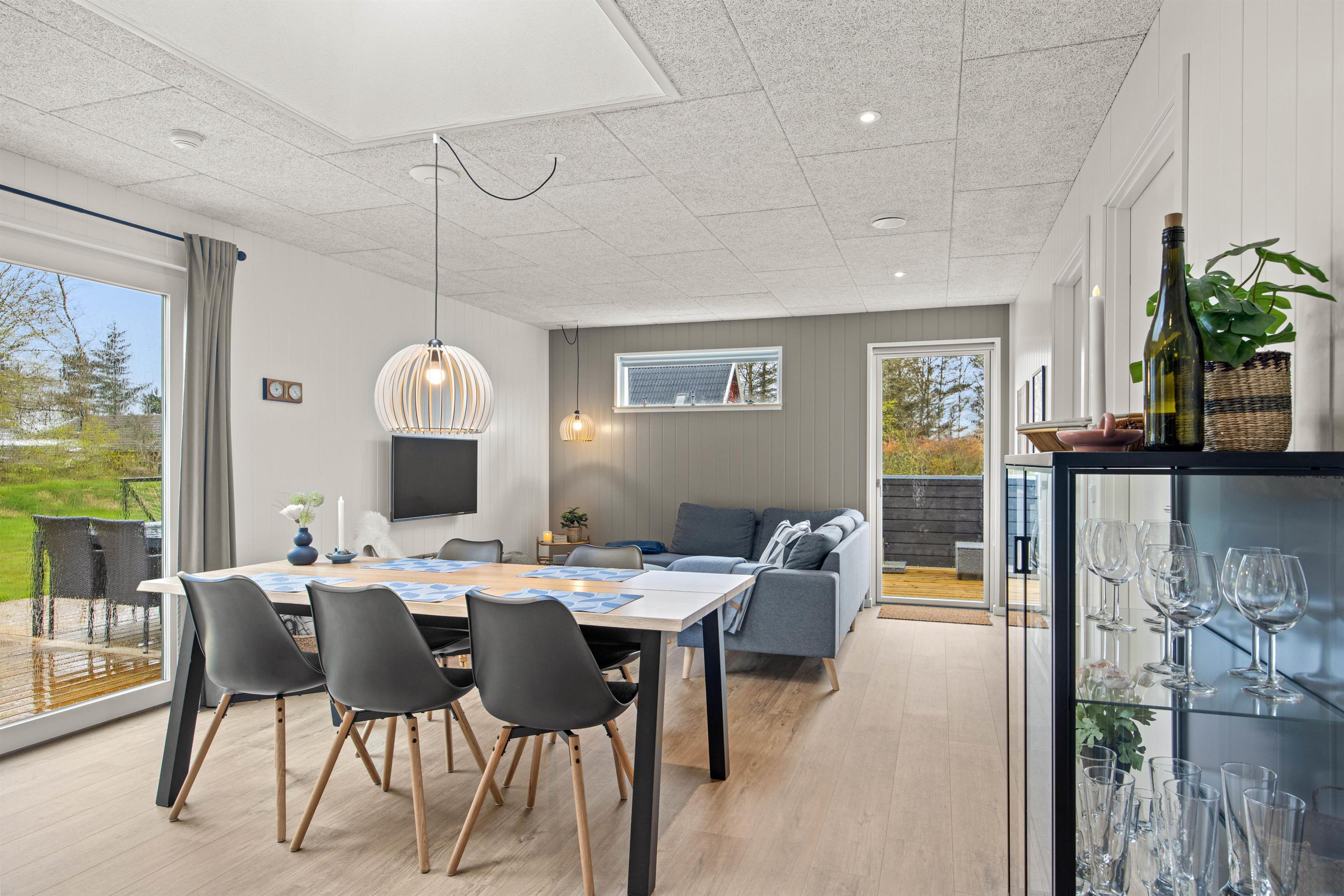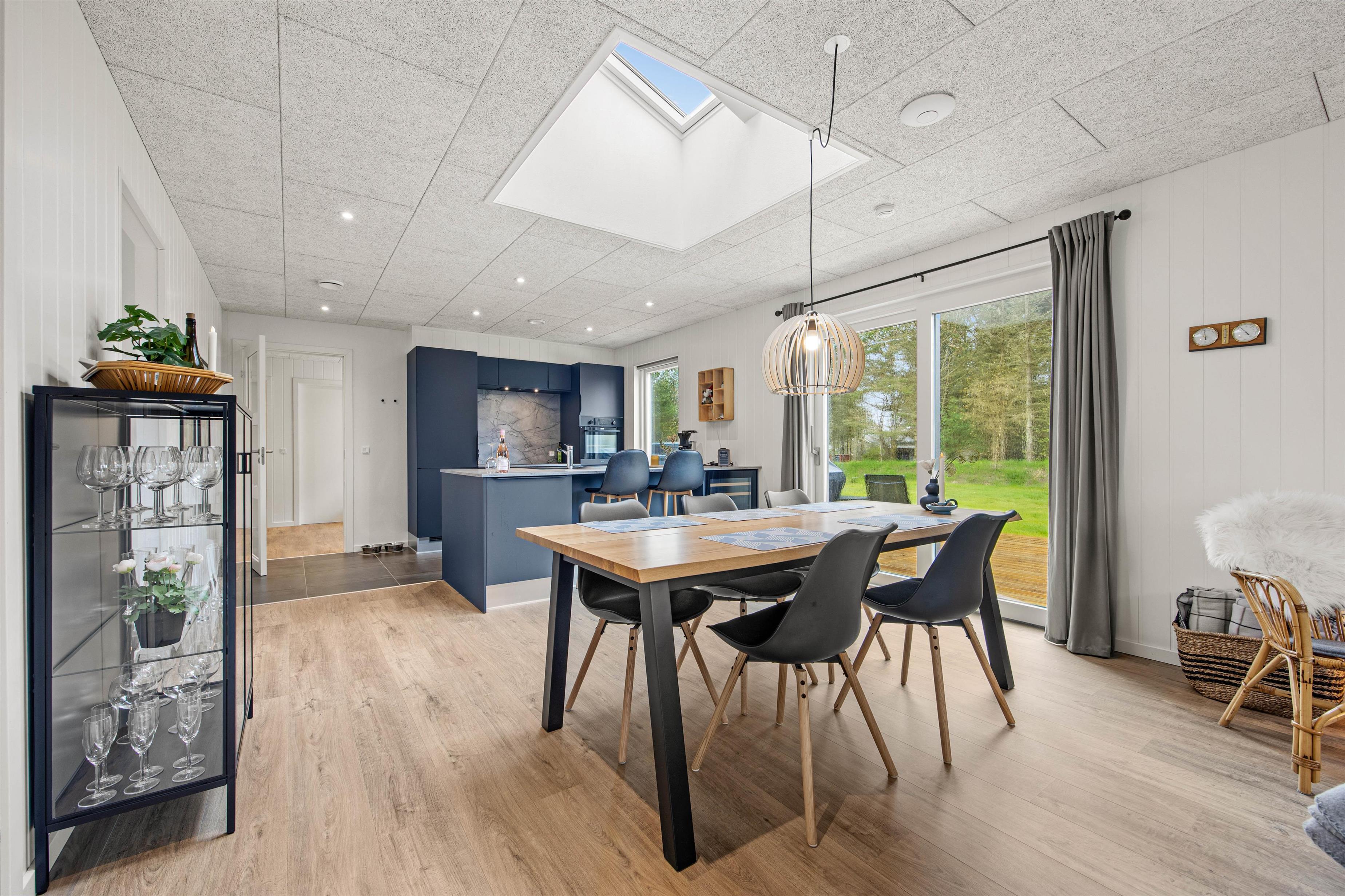 Det flotte køkken ligger centralt i sommerhuset og her kan I helt sikkert lave en masse lækkerier. Bagefter hjælper opvaskemaskinen jer med at tage opvasken, så I har mere tid til nærvær og hygge. Børnene kan være med i køkkenet eller fordrive tiden ved spisebordet med et puslespil eller et spil. Huset opvarmes med en energirigtig luft-til-vand varmepumpe, så der er gulvvarme i hele huset. Om aftenen kan I sætte jer sammen i stuen og streame jeres yndlingsfilm på tv’ets Chromecast.