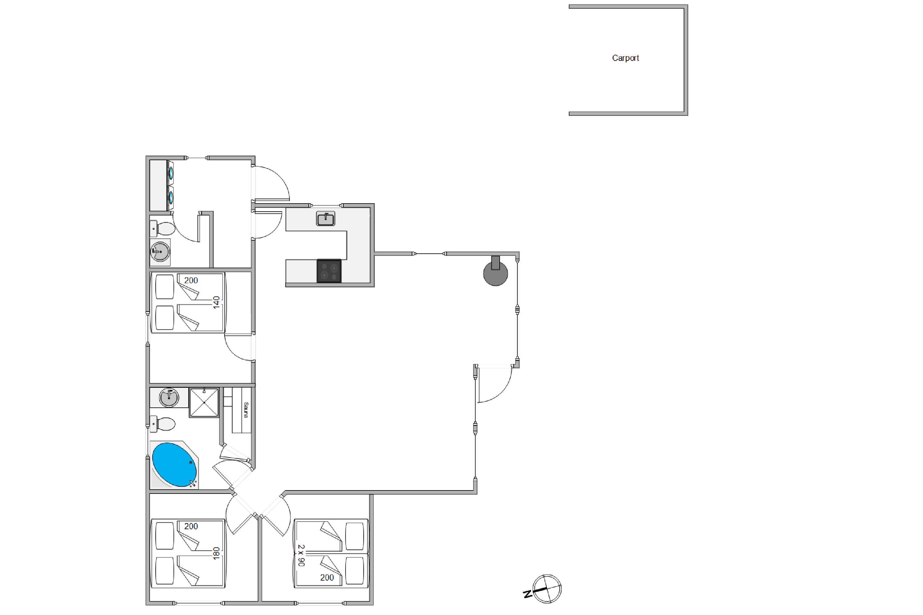 Med tre soveværelser, heraf to er med dobbeltsenge og et med to enkelt senge, er der rigeligt med plads til alle. Badeværelset er udstyret med gulvvarme, en forfriskende sauna og praktisk vaskemaskine og tørretumbler, der sikrer, at I altid er klar til nye oplevelser.