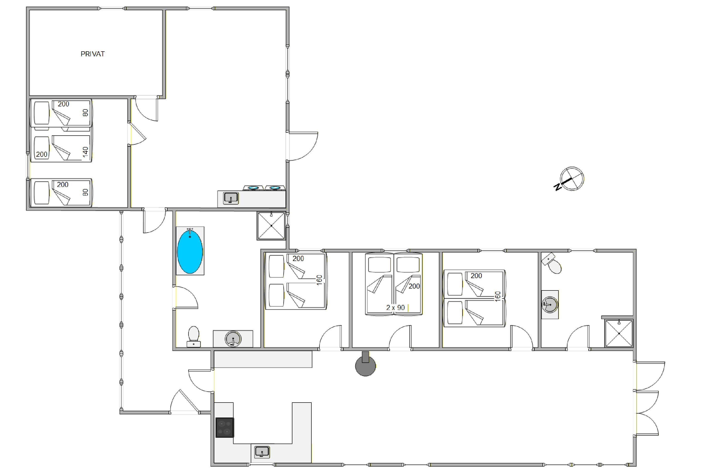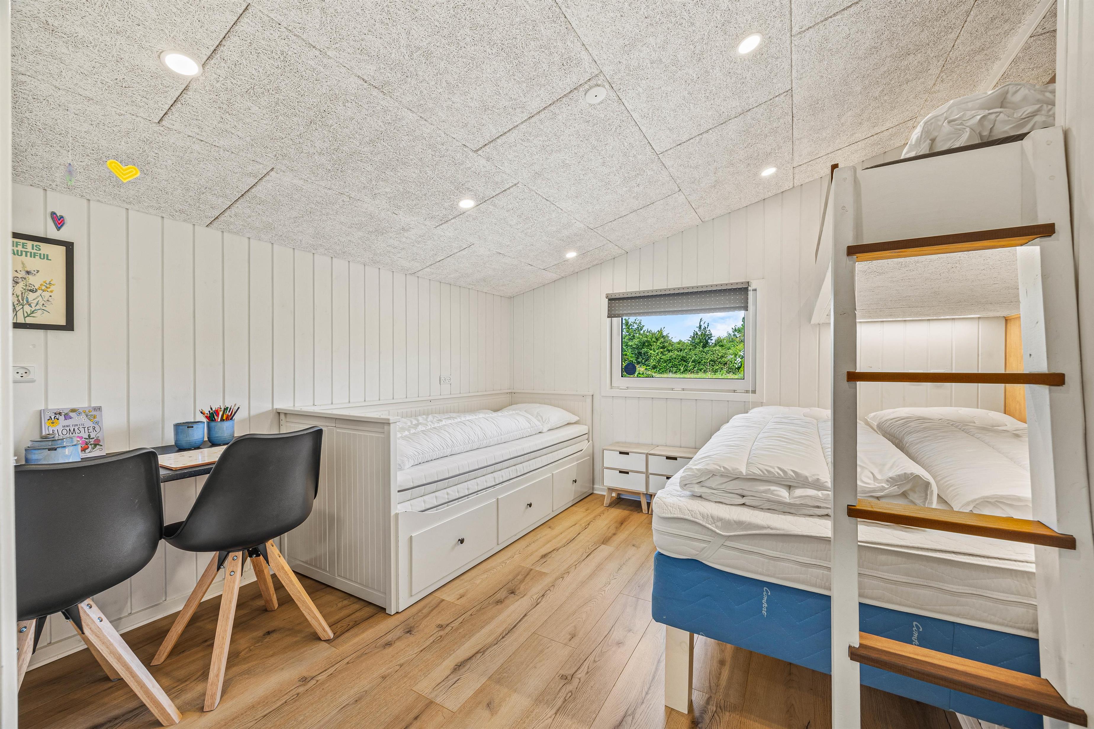 Sommerhuset har en kapacitet til 10 personer, hvilket gør det til et ideelt valg for større familier eller grupper af venner. Med 4 soverum, der rummer 3 dobbeltsenge og 4 enkeltsenge, er der masser af soveplads til alle. Perfekt for dem, der ønsker både fællesskab og privatliv under ferien. Der er 2 badeværelser, hvoraf det ene er udstyret med et badekar, og gulvvarme i begge badeværelser sikrer ekstra komfort under jeres ophold.