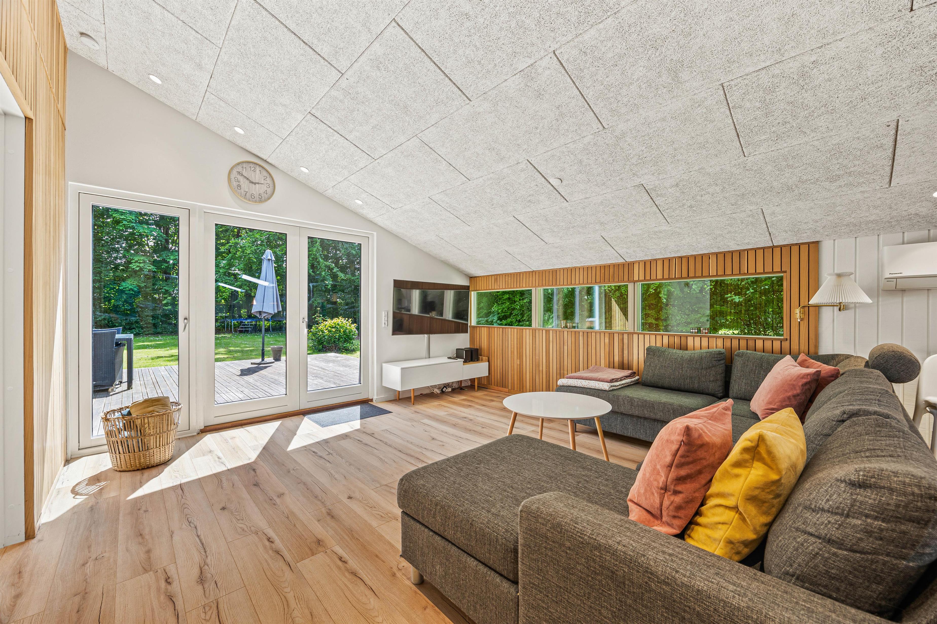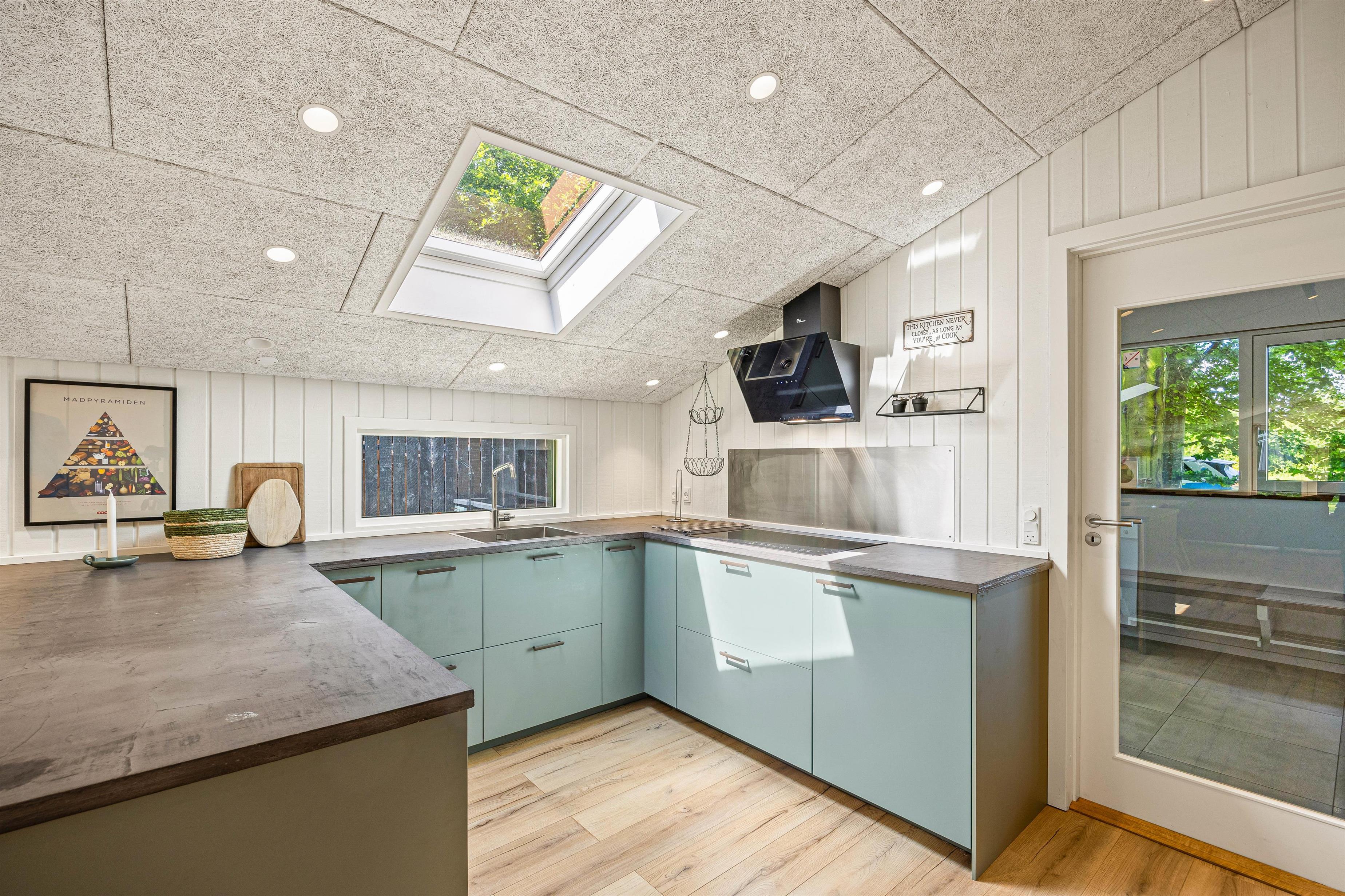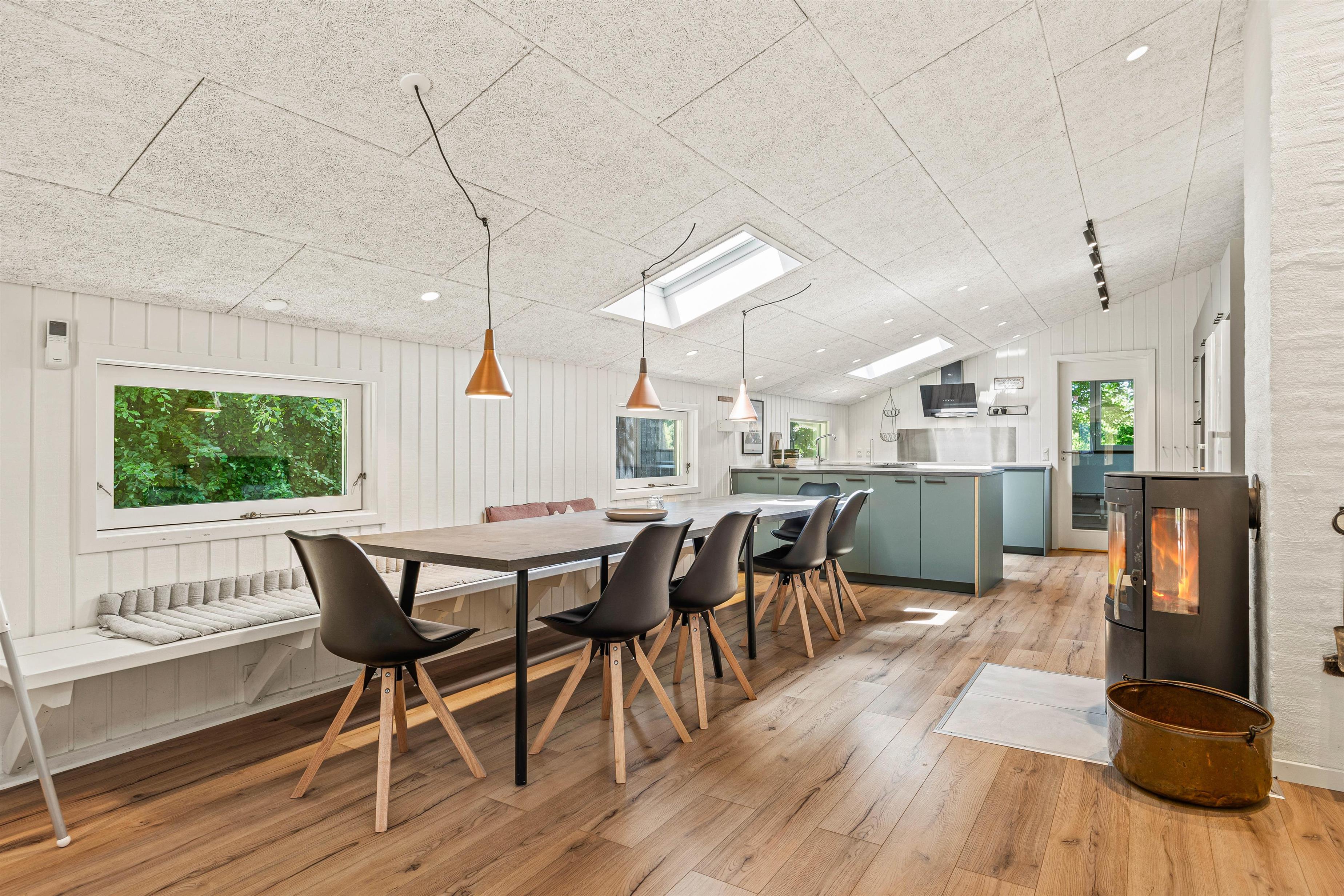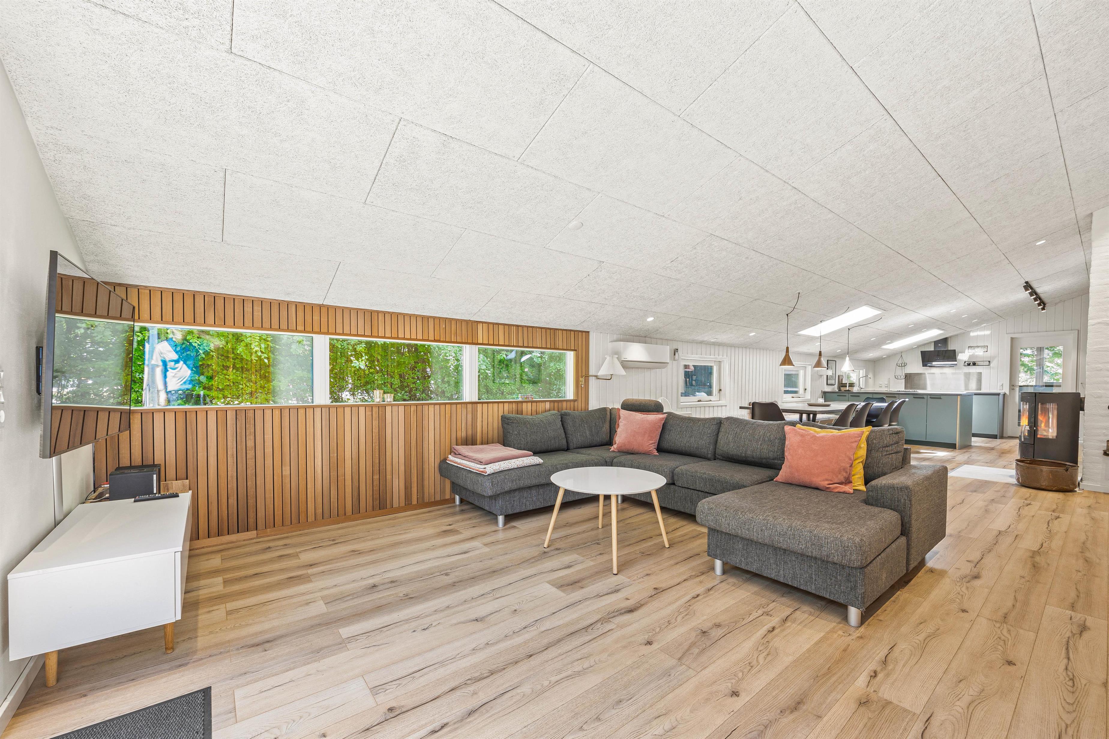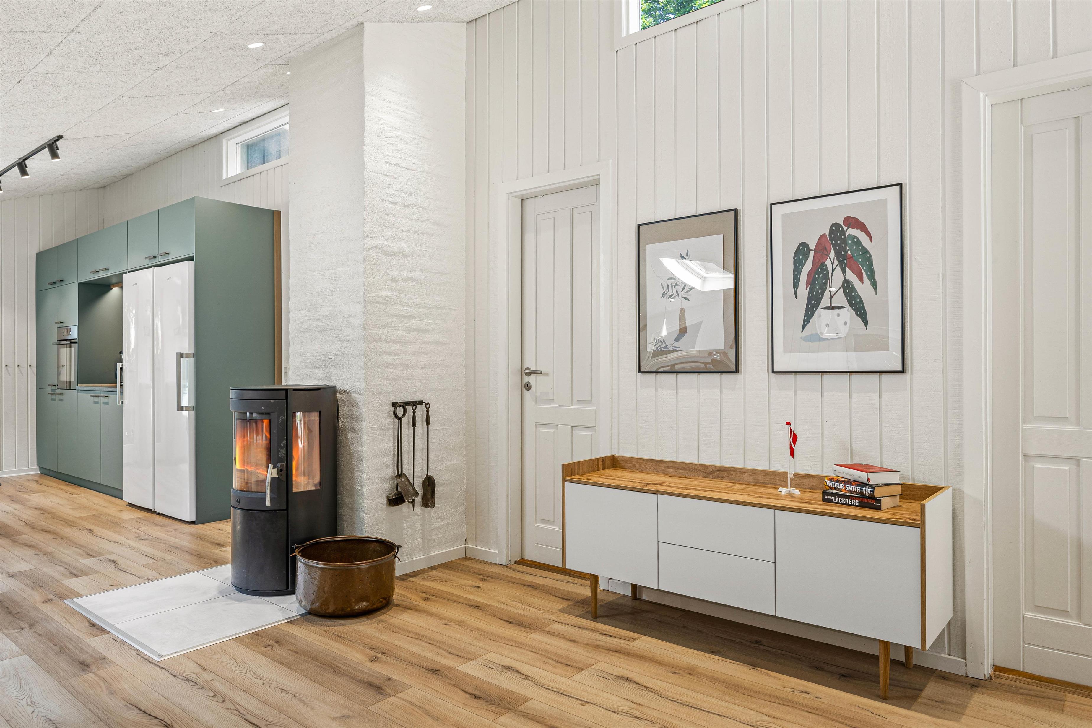 Sommerhuset har et veludstyret køkken, hvor en opvaskemaskine gør det nemt at håndtere opvasken efter måltider. Her kan I samles om madlavningen og nyde fælles måltider. Den rummelige stue er det perfekte sted at samles om aftenen. Her kan I nyde de kolde vinteraftener foran den hyggelige brændeovn. Med en energibesparende luft-til-luft varmepumpe sikres der en behagelig temperatur og indeklima året rundt. Uanset om I vil spille spil sammen eller slappe af med en film, er stuen stedet, hvor I kan trække jer tilbage og hygge.