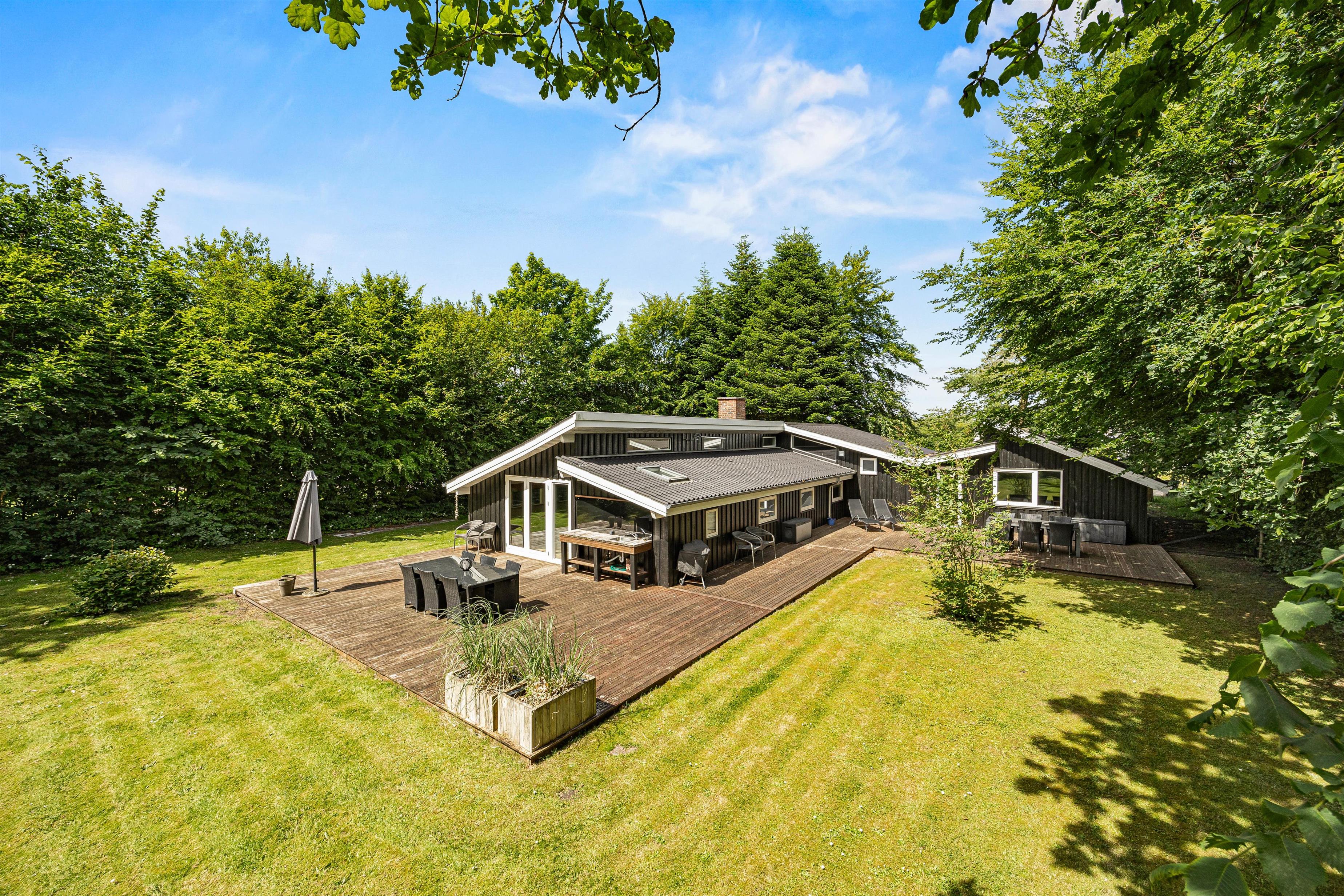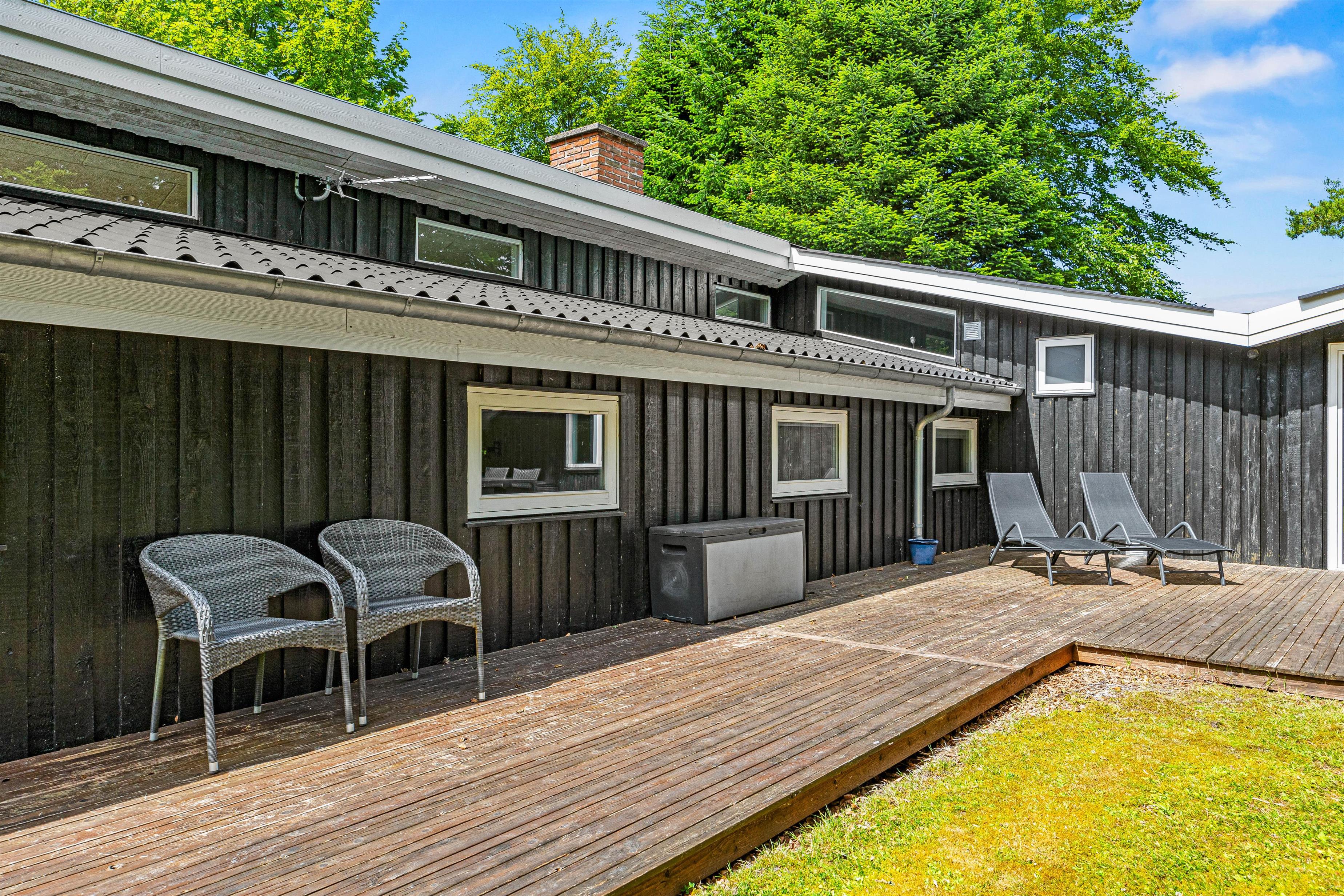 Sommerhuset på Enebærvangen 19 har en stor grund på 1634m2, der inkluderer en åben terrasse, havemøbler, grill og til de små er der en sandkasse. Den store plænegrund er perfekt til leg og afslapning, og den indhegnede grund gør det sikkert for børn og kæledyr. Desuden er der en trampolin, der kan glæde både børn og voksne. Hund er tilladt, og du kan have op til to husdyr med på ferie, så ingen behøver at blive hjemme.