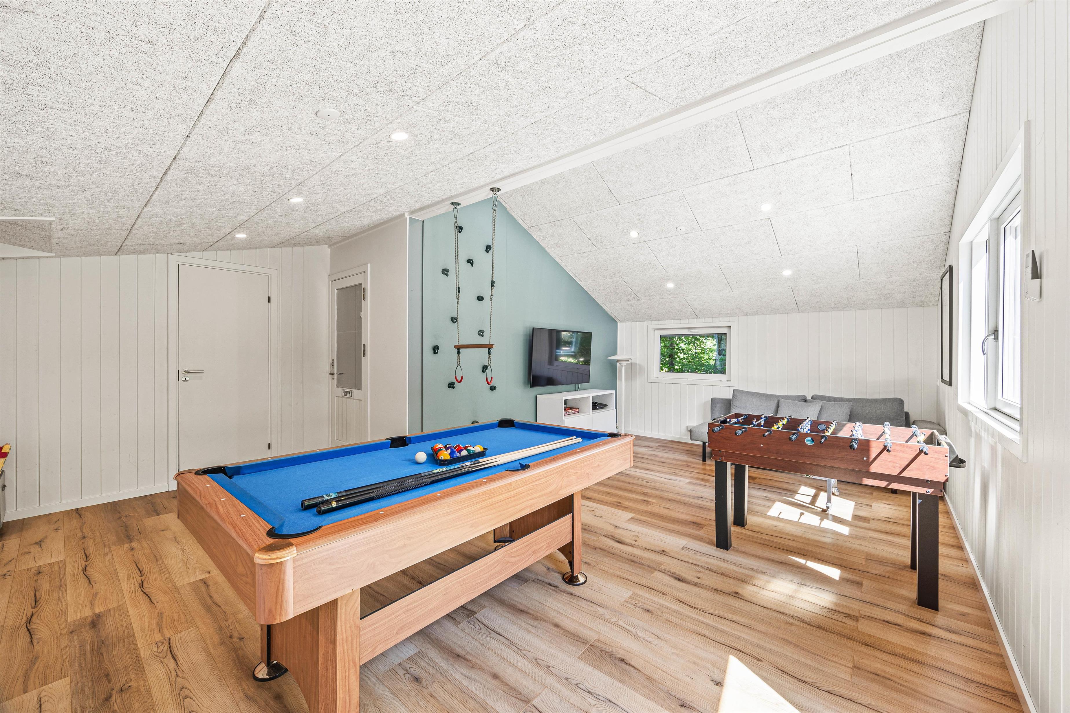 Som et ægte aktivitetshus tilbyder sommerhuset en række indendørs faciliteter, der sikrer underholdning hele året rundt. Huset rummer både poolbord og bordfodbold, som inviterer til mange timers sjov og konkurrence. For familier med små børn er der endda en indendørs gynge, der giver mulighed for leg indendørs, uanset vejret.