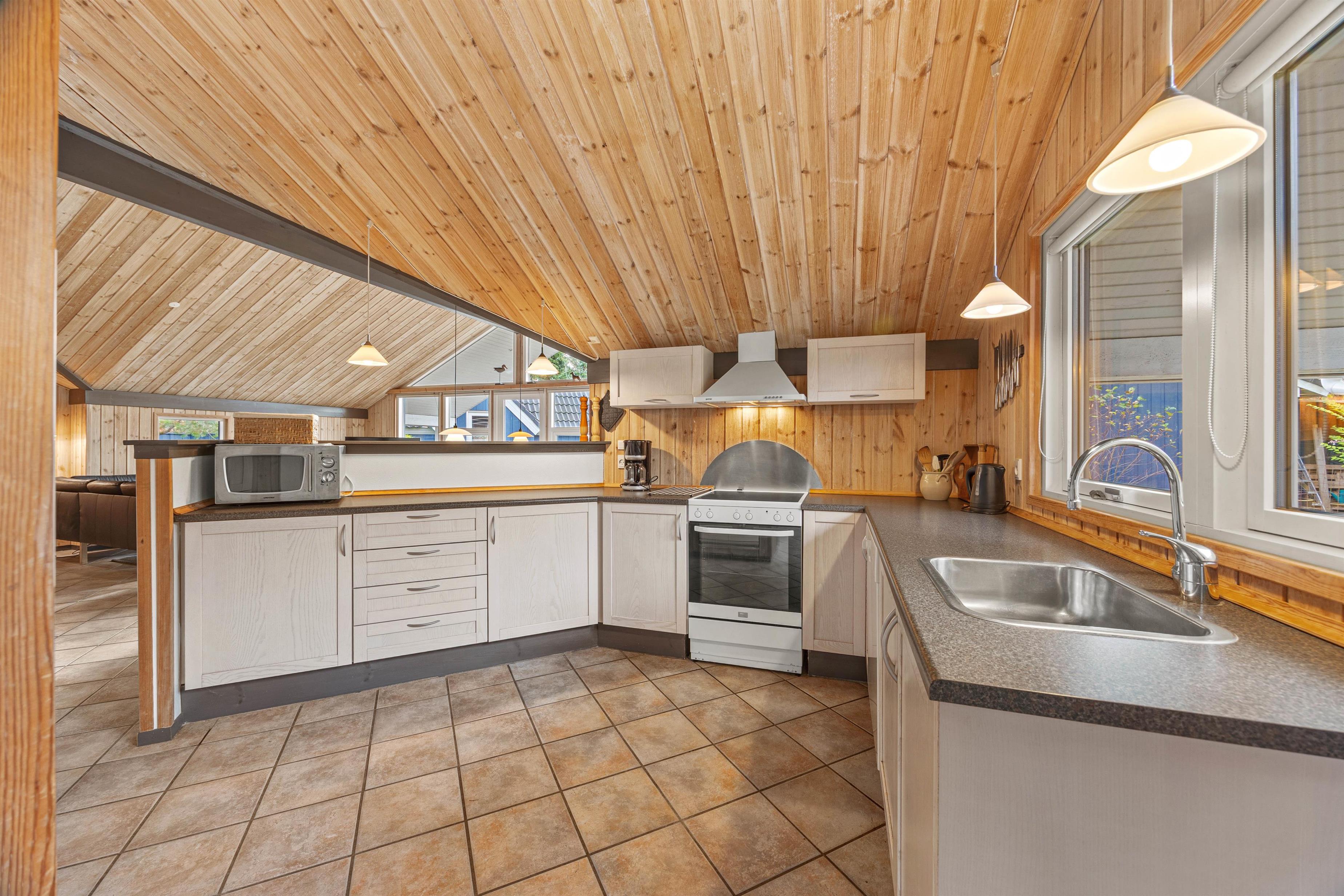I sommerhuset på Nordskrænten 13 kan I samles til mange hyggelige feriestunder i det store opholdsrum. Her kan I være sammen om madlavningen, samles til spilaftener, eller læne jer tilbage i sofaen til en god film. Alt imens har I lyden af brændeovnen i baggrunden, der sørger for gode temperaturer i sommerhuset og giver lidt ekstra til den hyggelige feriestemning.