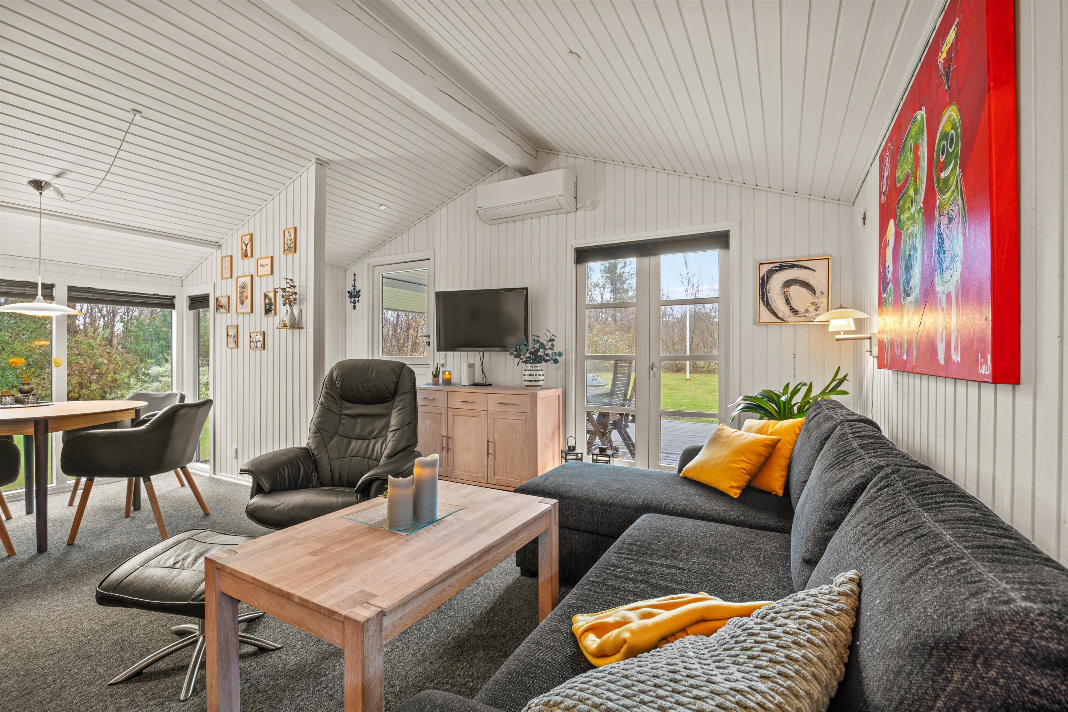 Stuen ligger i åben forbindelse med køkkenet, perfekt til hyggelige aftener med god mad og fælles madlavning. Det moderne køkken er udstyret med alt, hvad I behøver: opvaskemaskine, mikroovn, køleskab, frysekapacitet på 71 liter og induktionskogeplade.