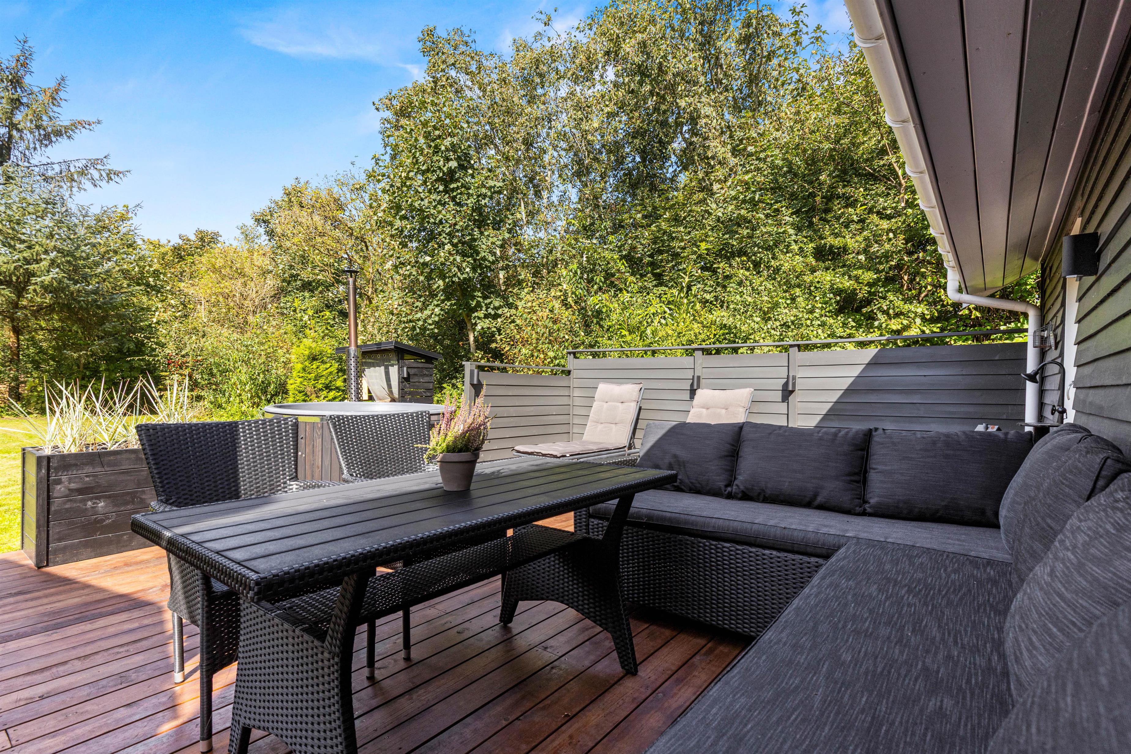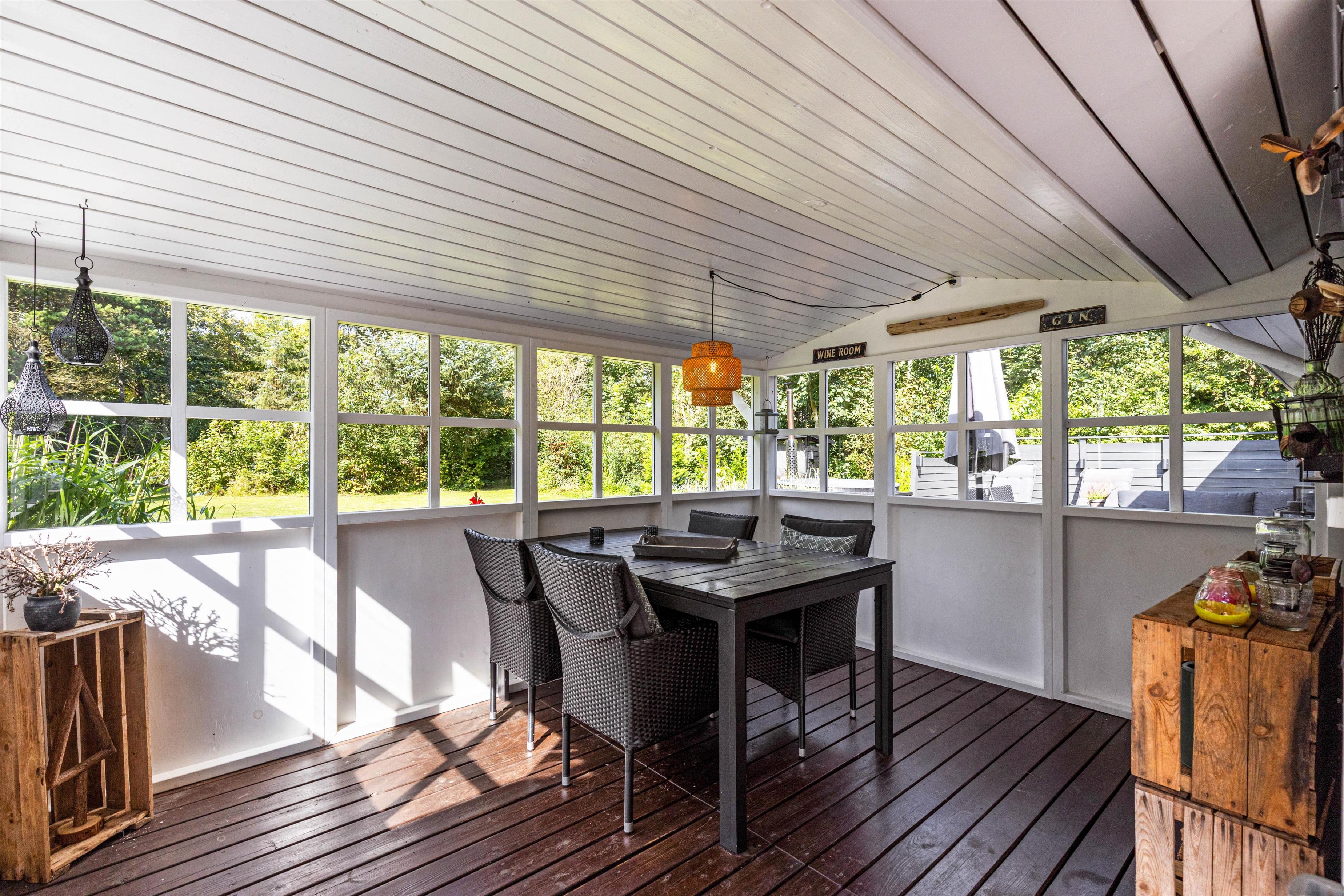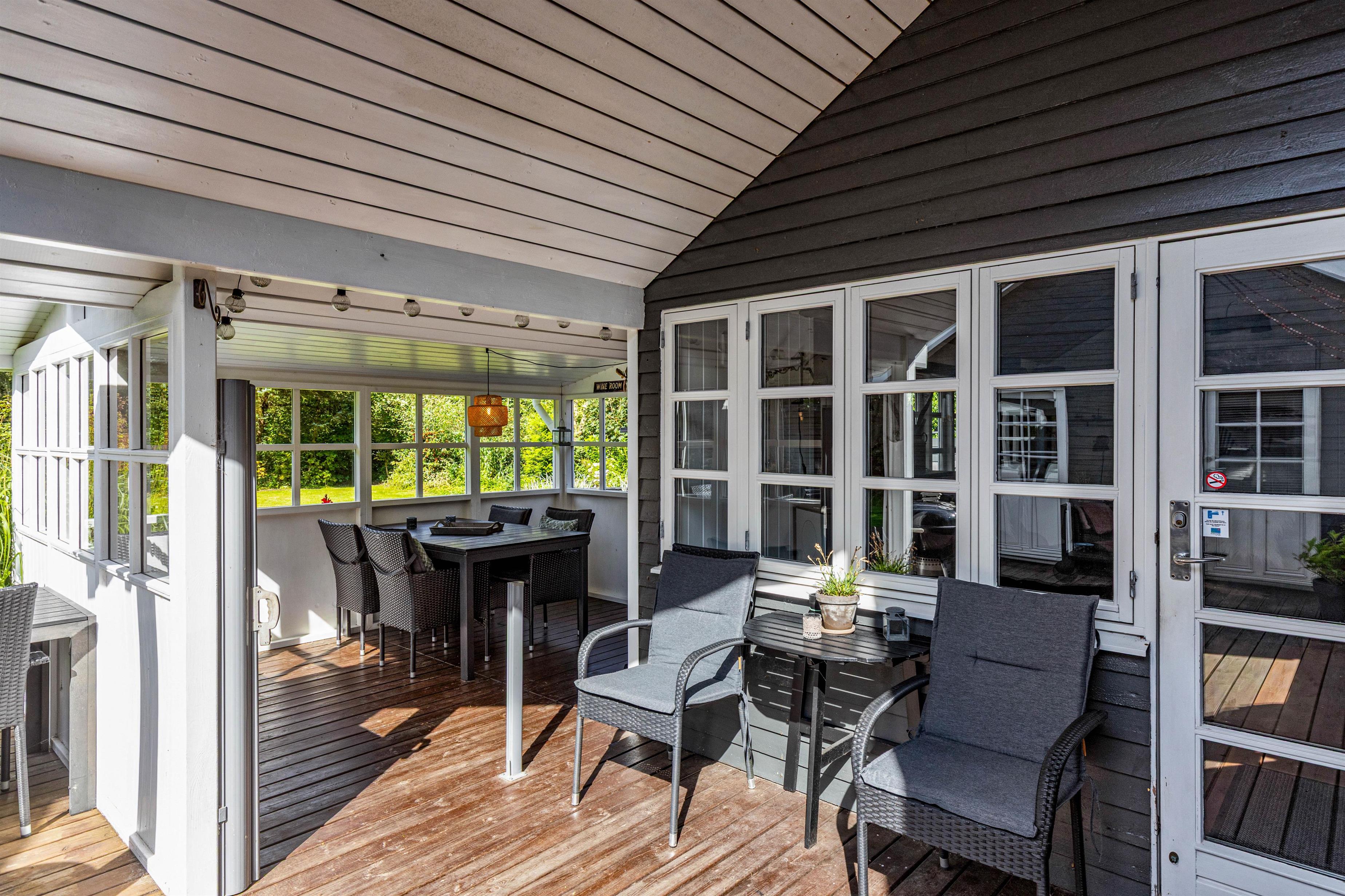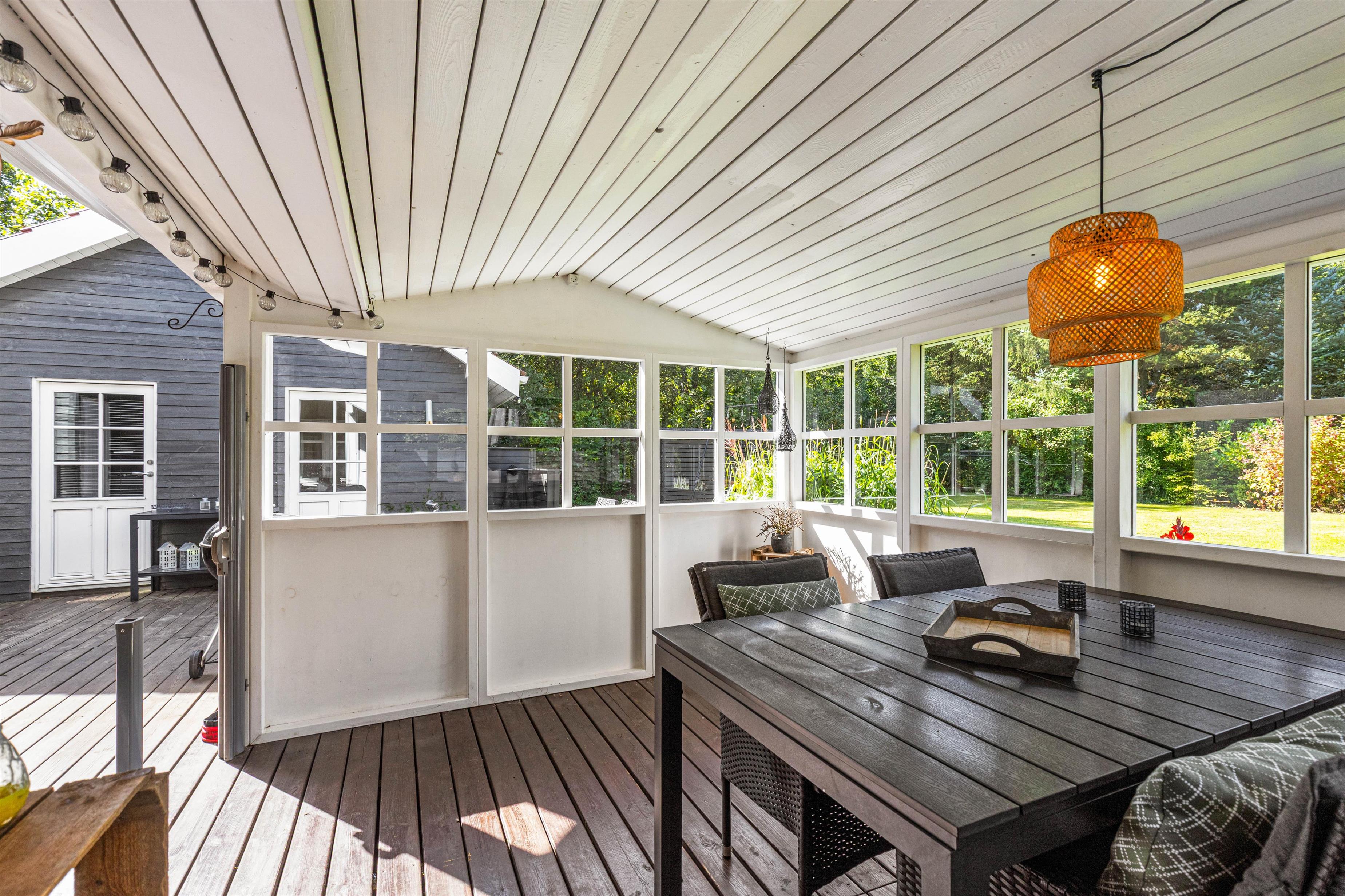 På Fyrrelunden 12 er udelivet i fokus. Glæd jer over et stort overdækket terrasseareal med vinduer, som næsten fungerer som en udestue og dejlige, læfyldte hjørner, hvor I kan slappe af i de gode havemøbler og blive opslugt af en god bog, mens kullene bliver varme og klar til tilberedelsen af lidt lækker grillmad.