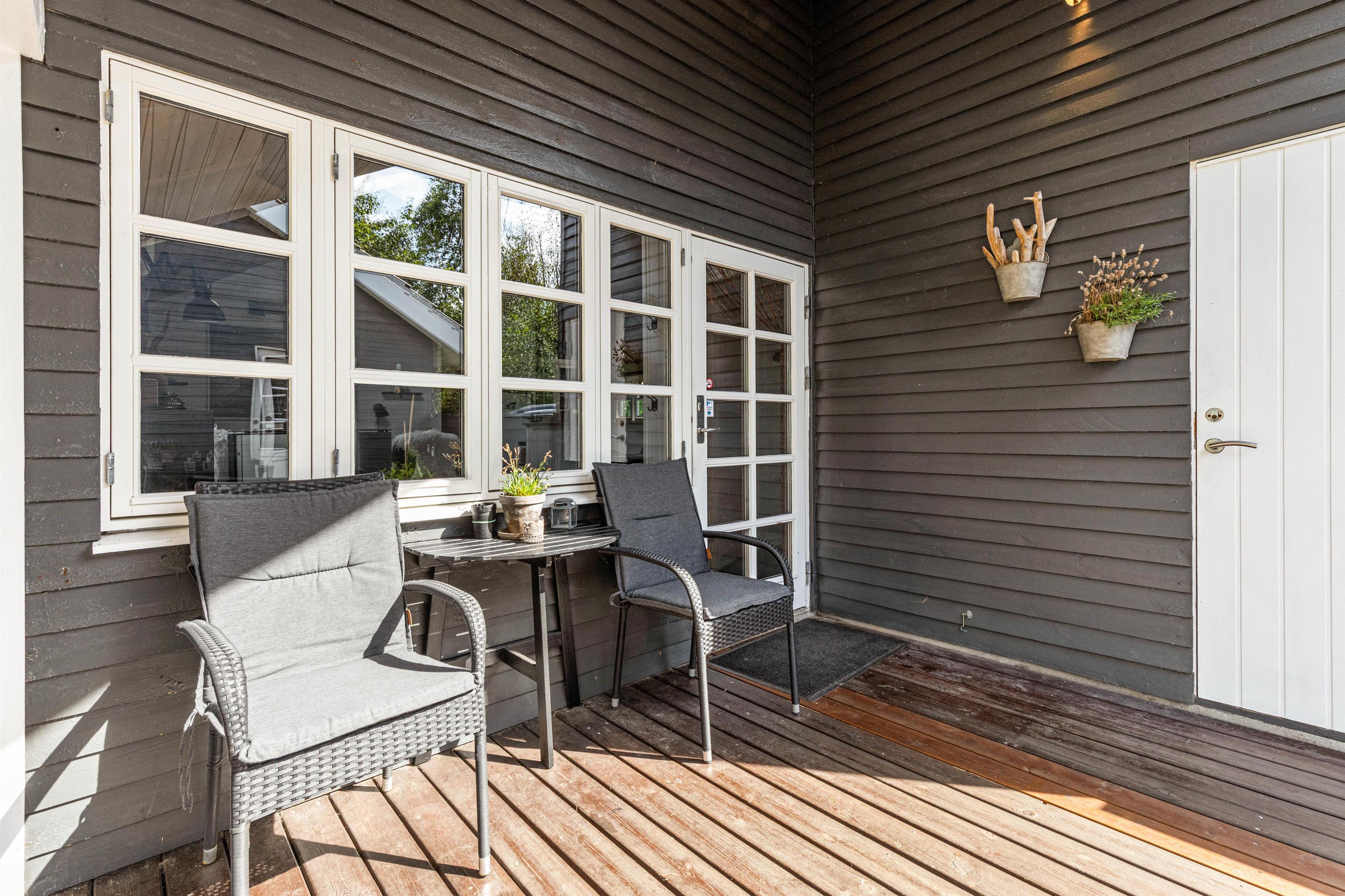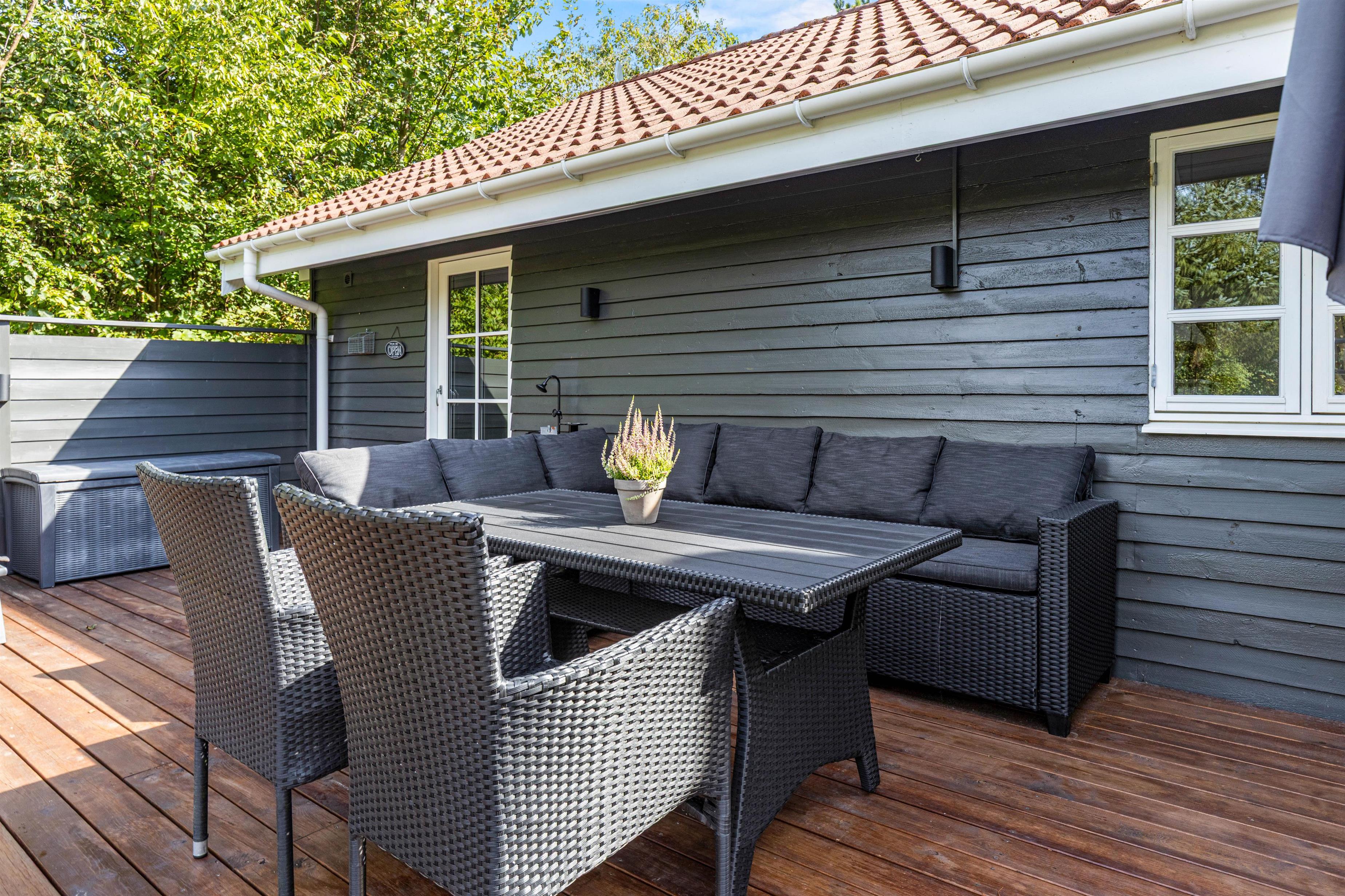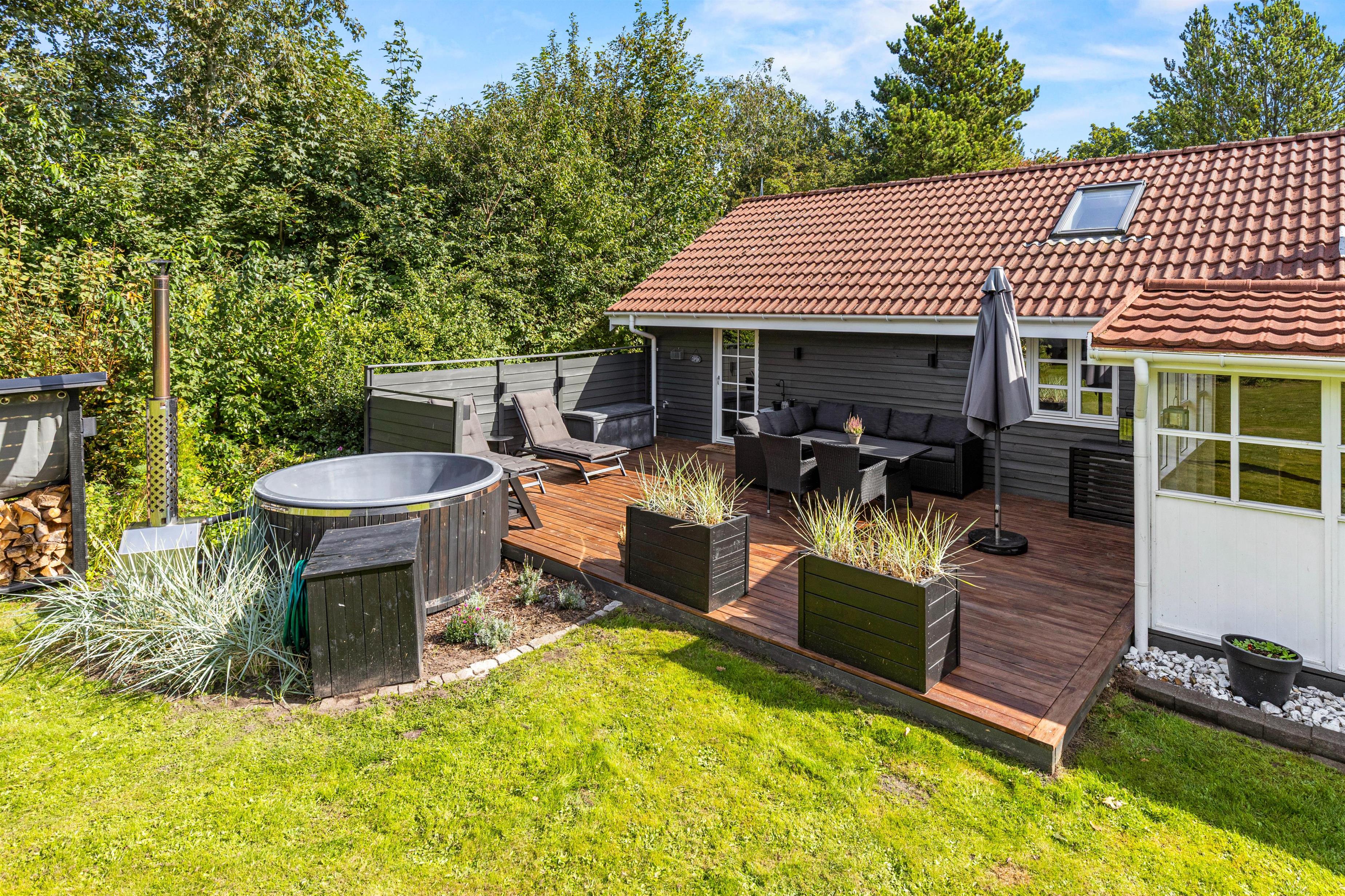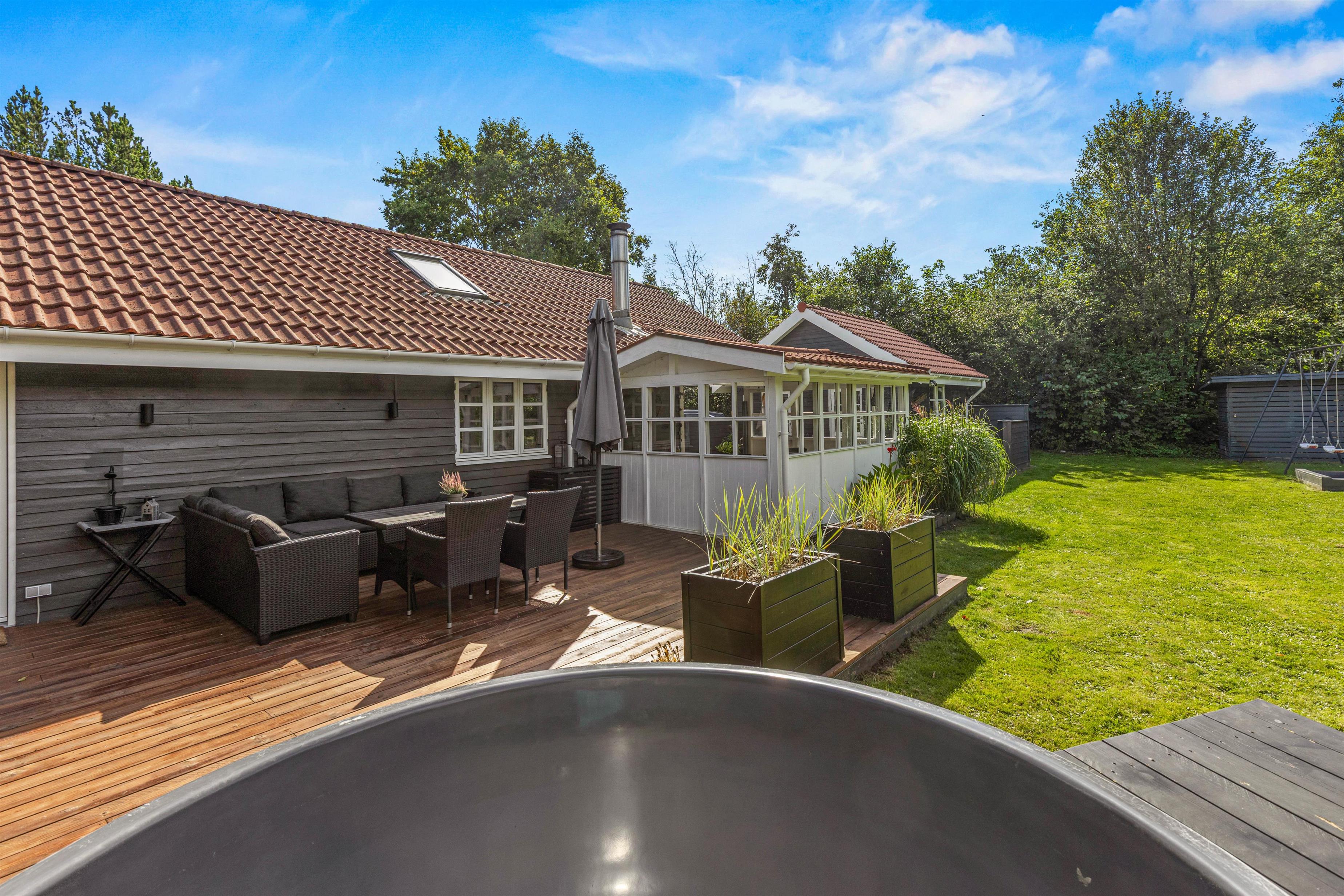 På Fyrrelunden 12 er udelivet i fokus. Glæd jer over et stort overdækket terrasseareal med vinduer, som næsten fungerer som en udestue og dejlige, læfyldte hjørner, hvor I kan slappe af i de gode havemøbler og blive opslugt af en god bog, mens kullene bliver varme og klar til tilberedelsen af lidt lækker grillmad.