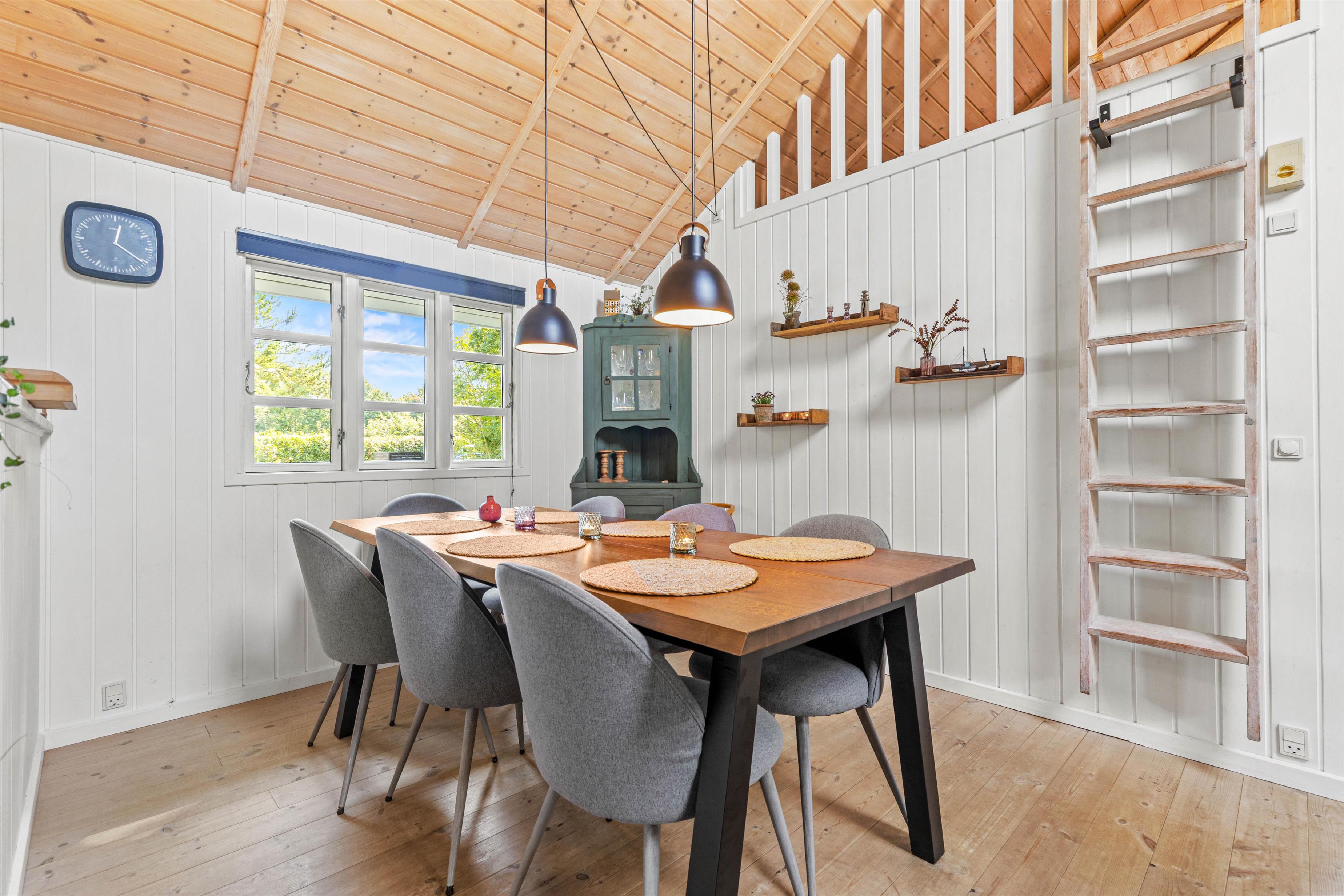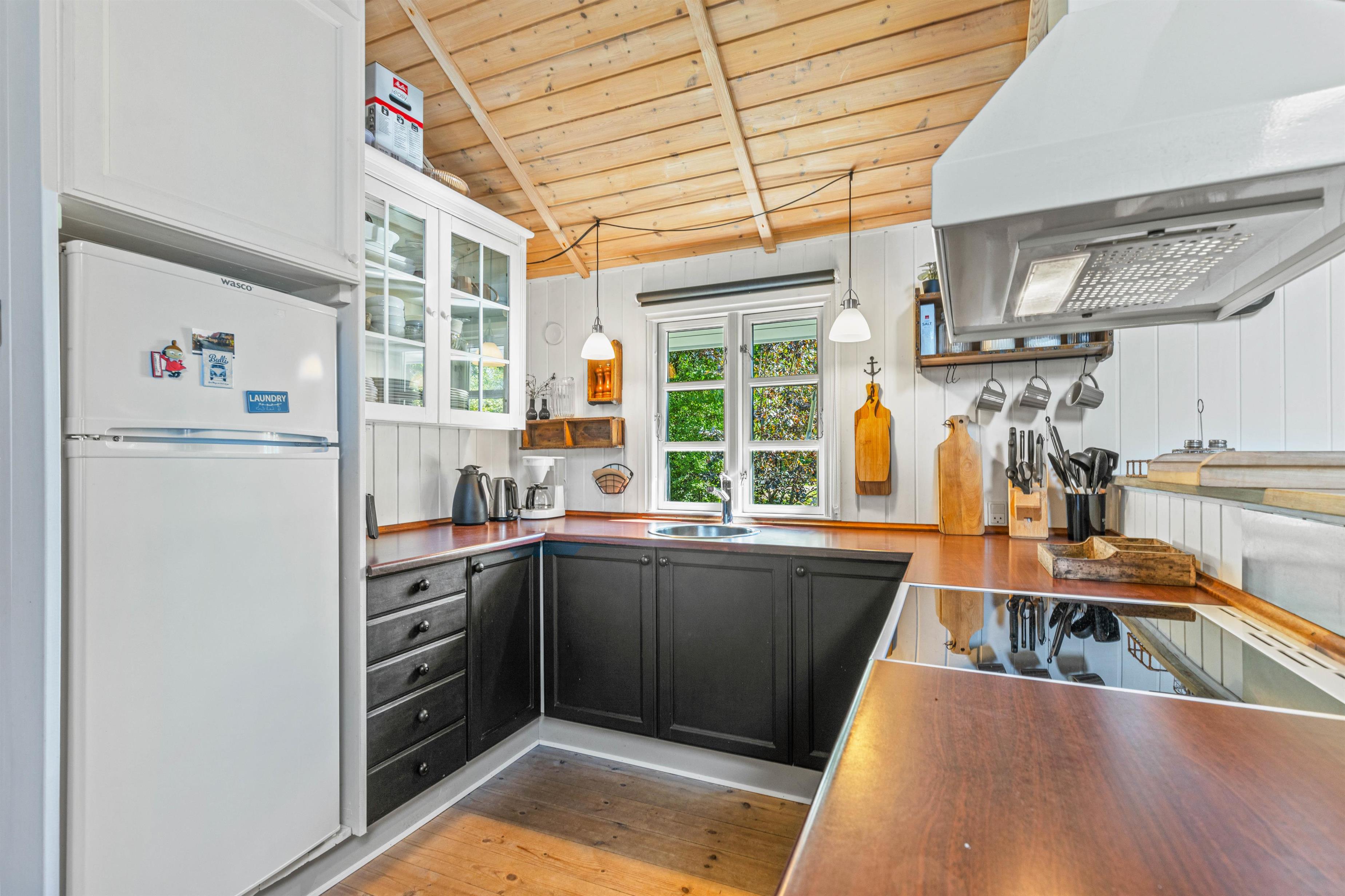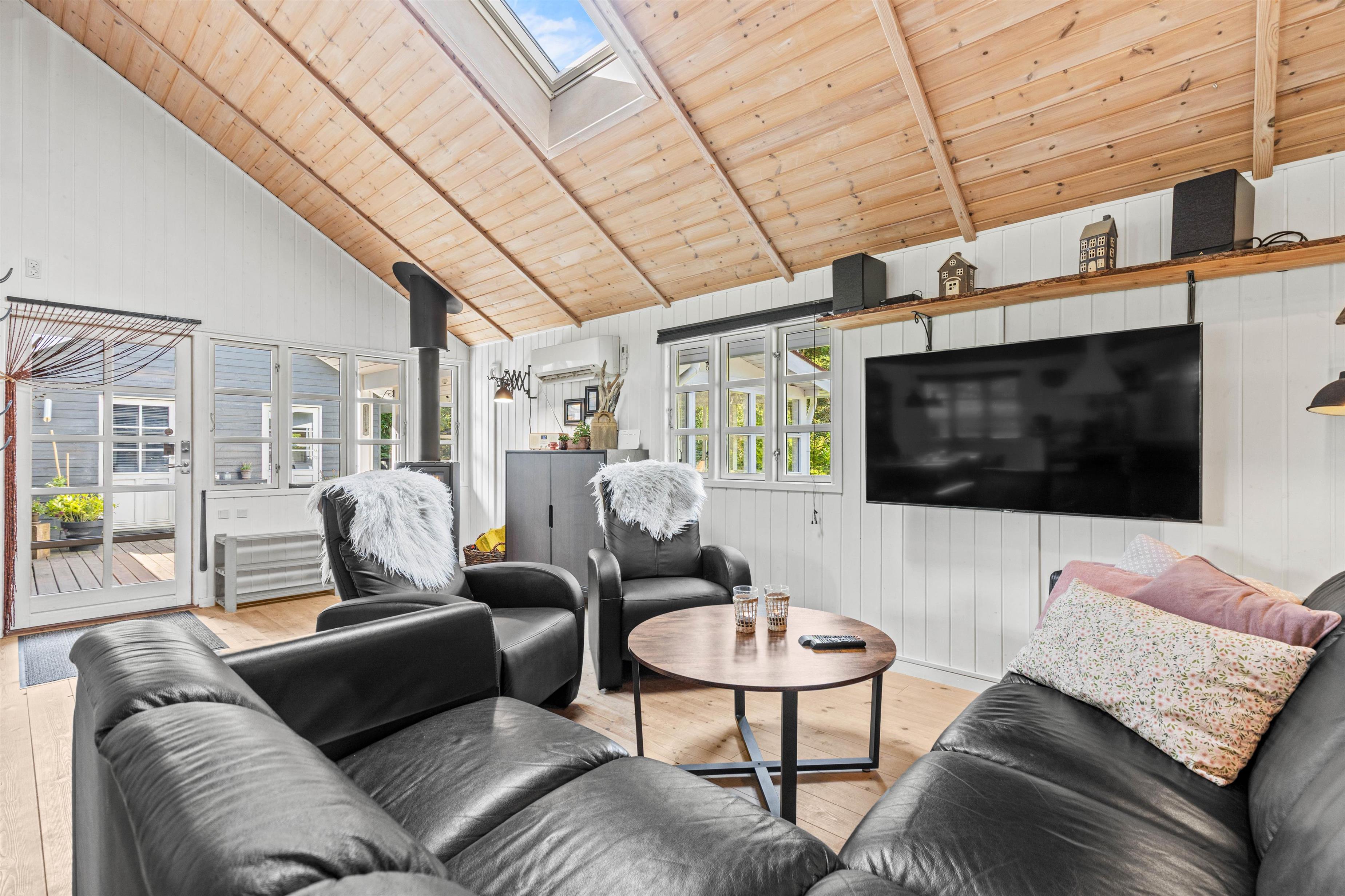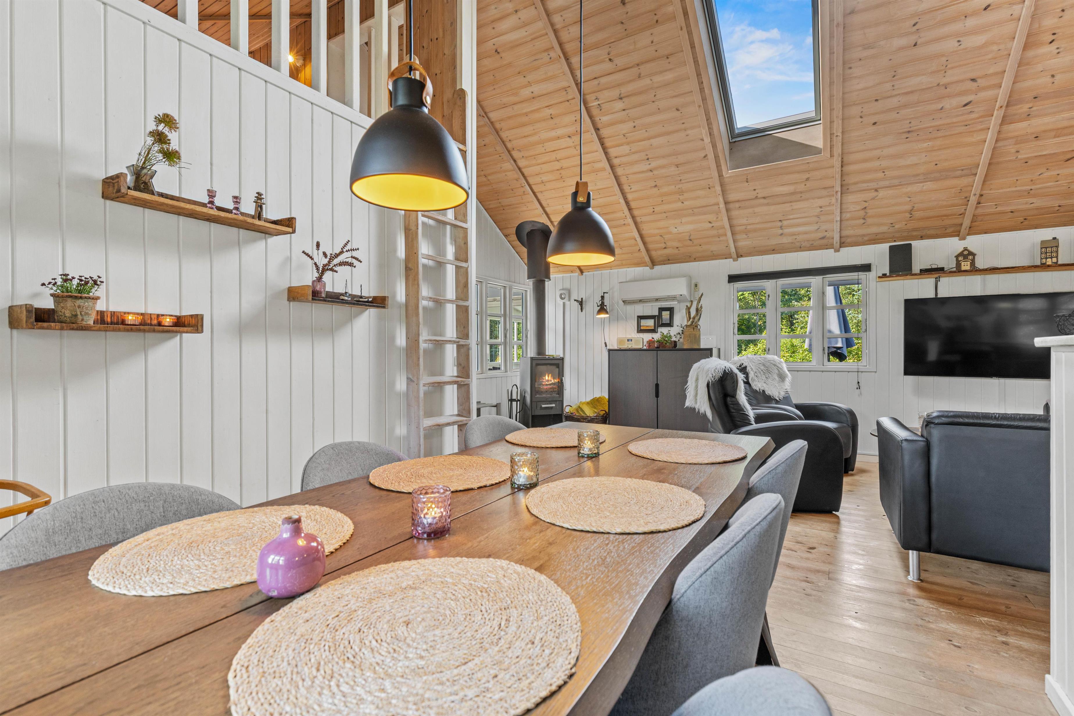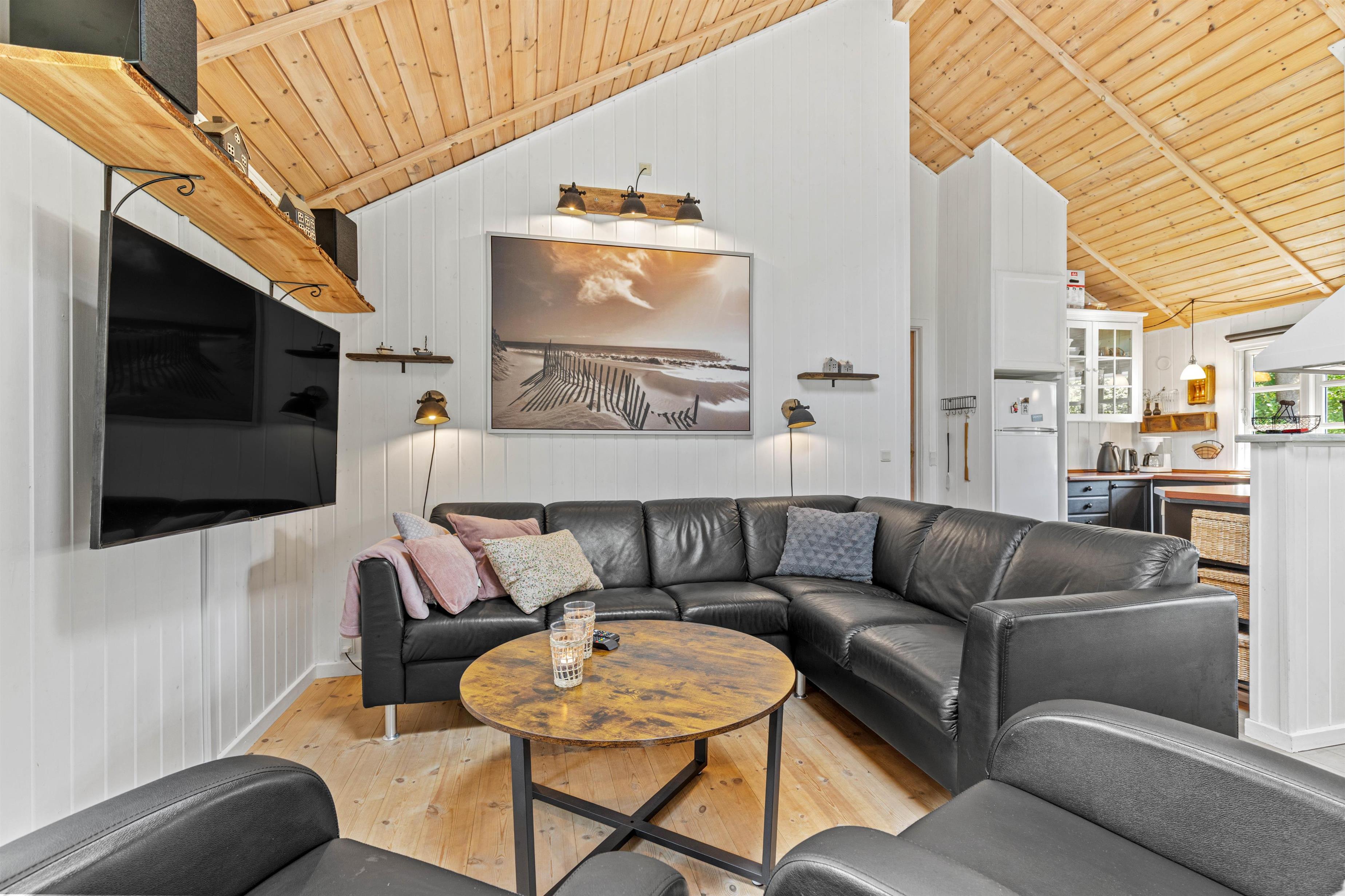 De store vinduer giver et dejligt lysindfald i køkkenalrummet, der består af en stue med lækre lædermøbler, et spisehjørne med et langt spisebord og et stort rummeligt køkken med opvaskemaskine. Her kan I samles op til 6 personer til fælles madlavning, spilleaftener ved spisebordet eller til en god film, imens jeres 2 hunde flader ud i varmen foran brændeovnen.