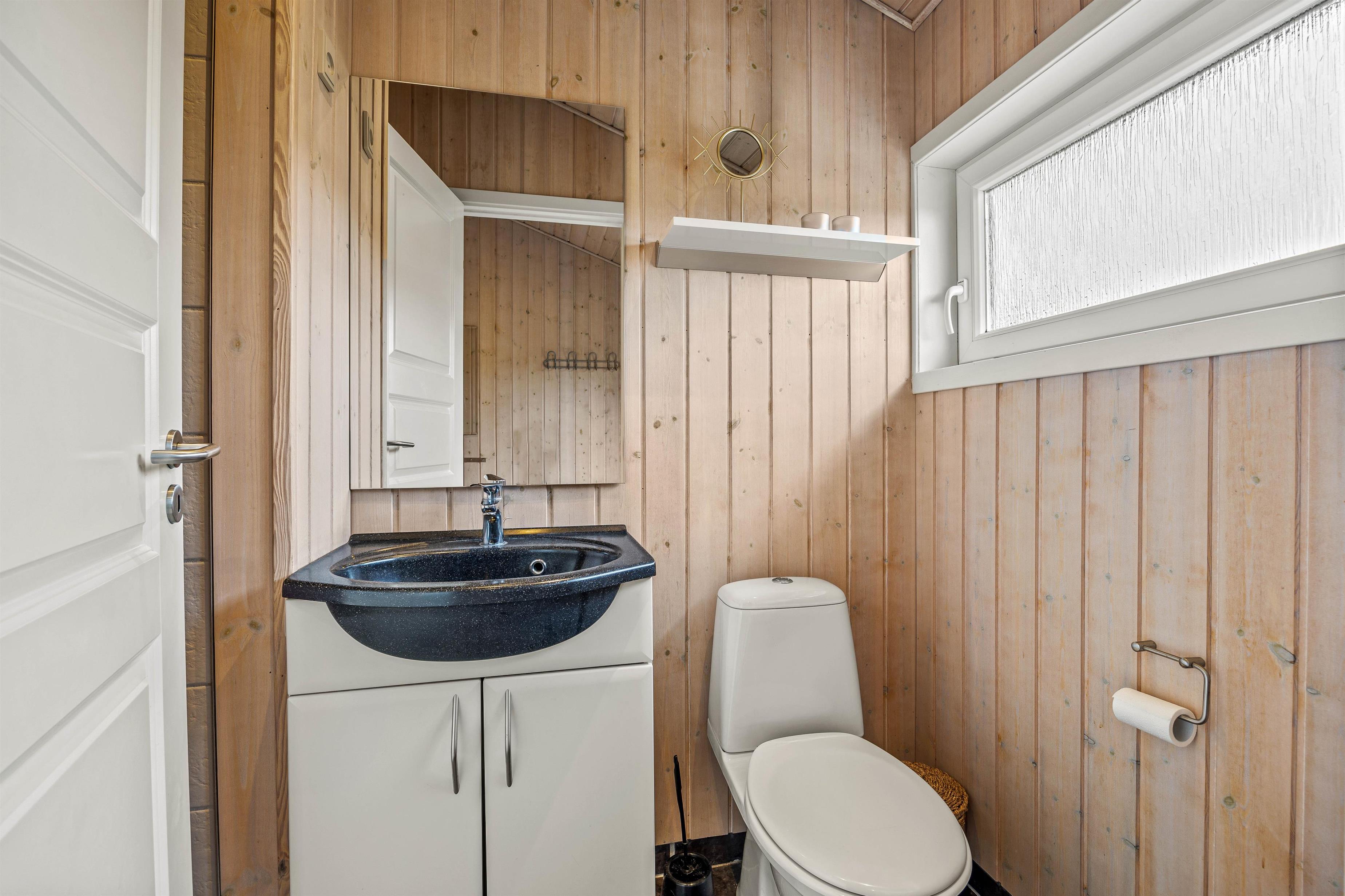 Badeværelset er lyst indrettet med plads til afslapning. Her er der en rummelig tømmespa til 2 personer og en sauna, perfekt til at slappe af efter en dag fyldt med sjove aktiviteter. Der er også et praktisk vasketårn til rådighed, så I kan holde jeres garderobe ren under opholdet.
