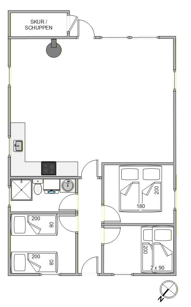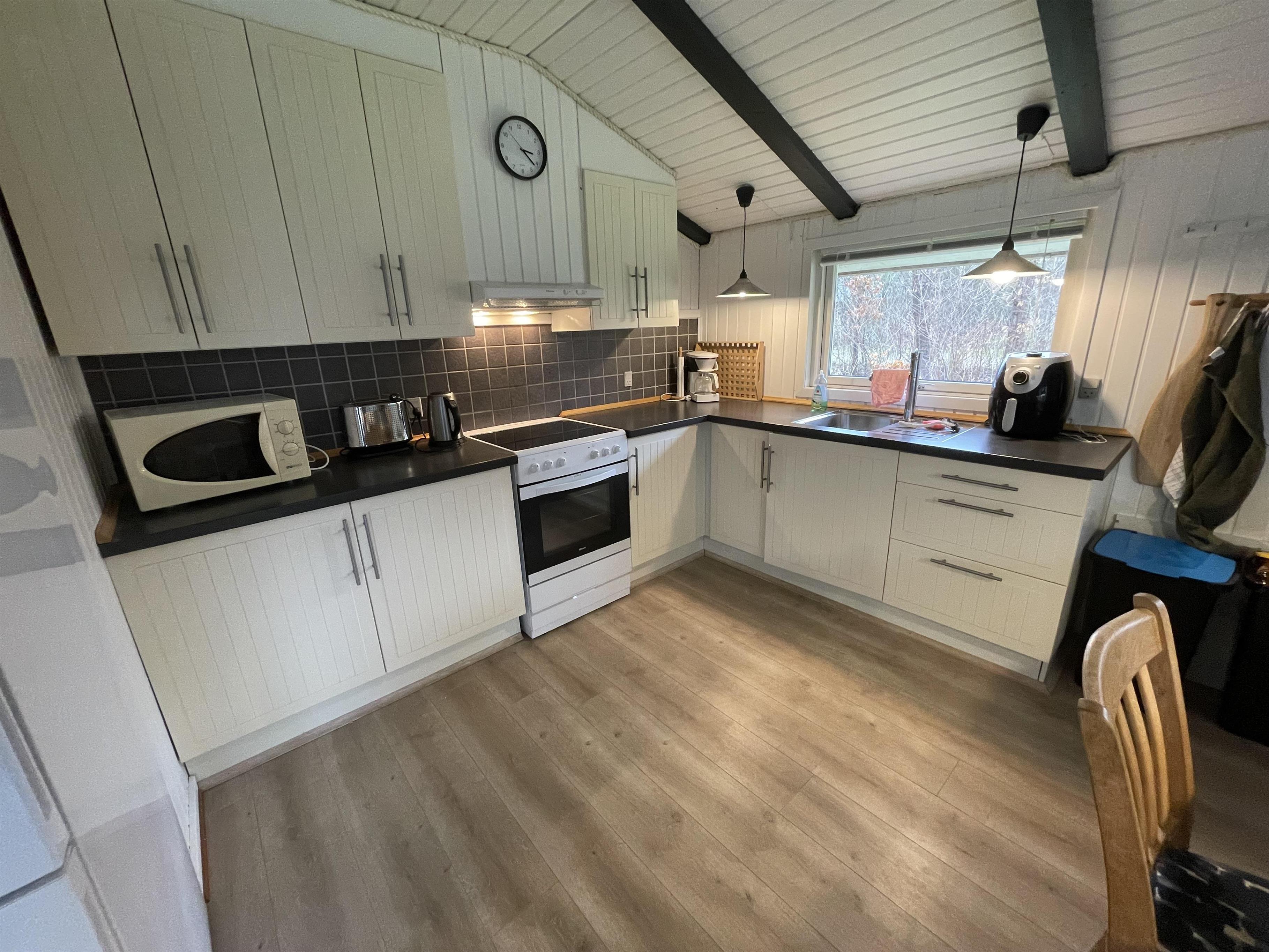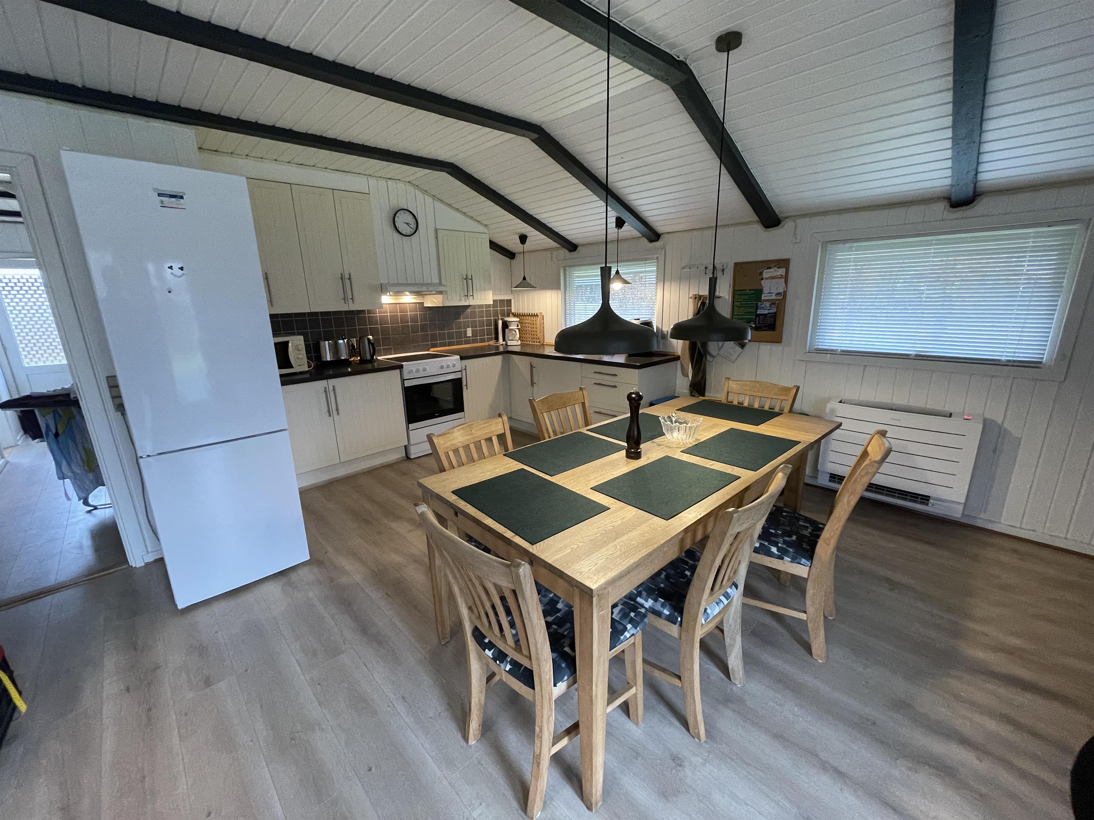Det åbne køkken er praktisk indrettet med gode arbejdsflader, så det er nemt at tilberede feriens måltider. Foruden køleskab med 80 l frysemulighed og elkomfur er der rig mulighed for at lave både hurtige frokoster og hyggelige middage, som kan nydes samlet omkring spisebordet.