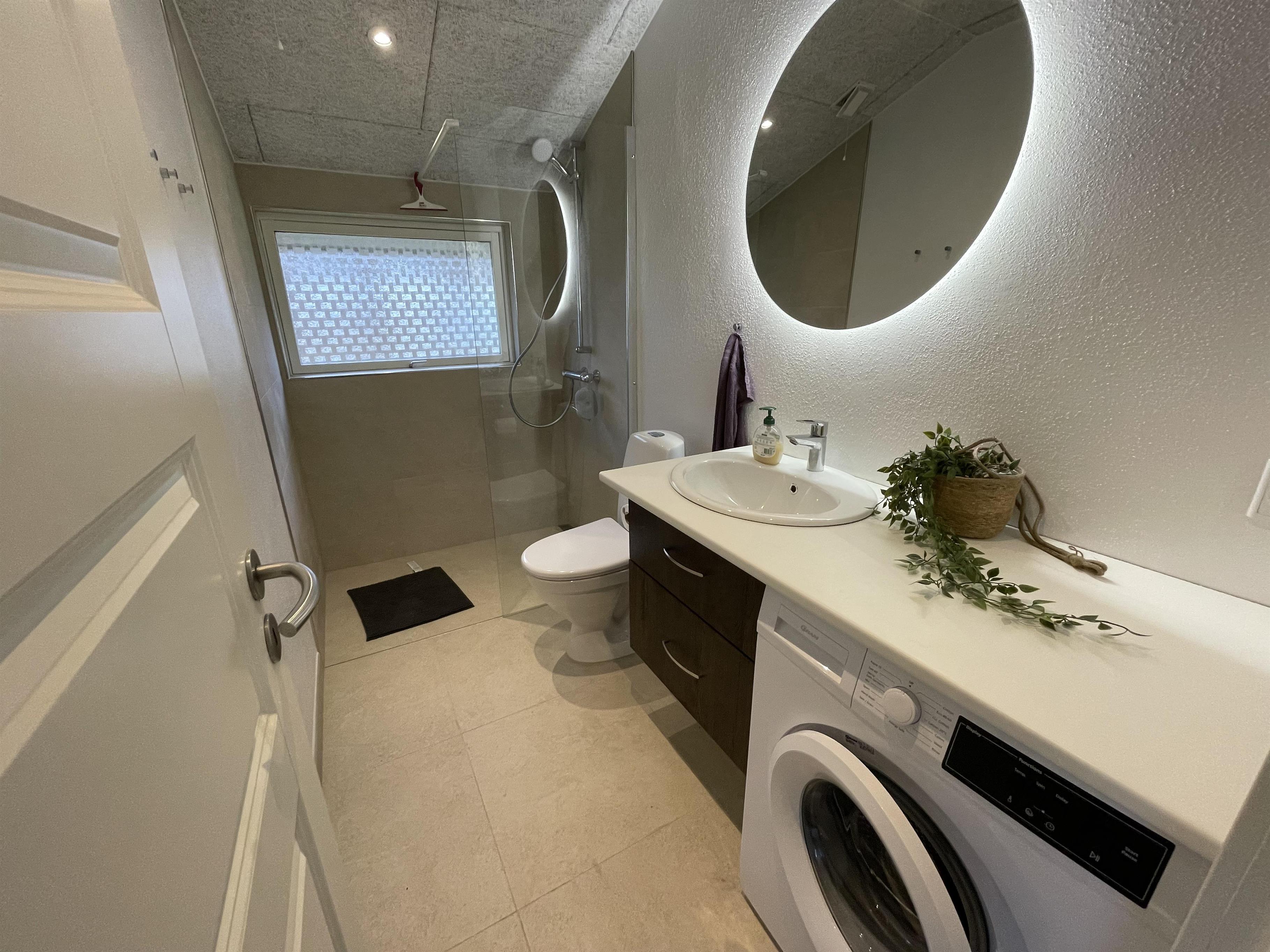 Badeværelset, som blev renoveret i 2026, fremstår lyst og moderne med bruseniche, gulvvarme og vaskemaskine – en ekstra komfort, især for børnefamilier eller ved længere ophold.