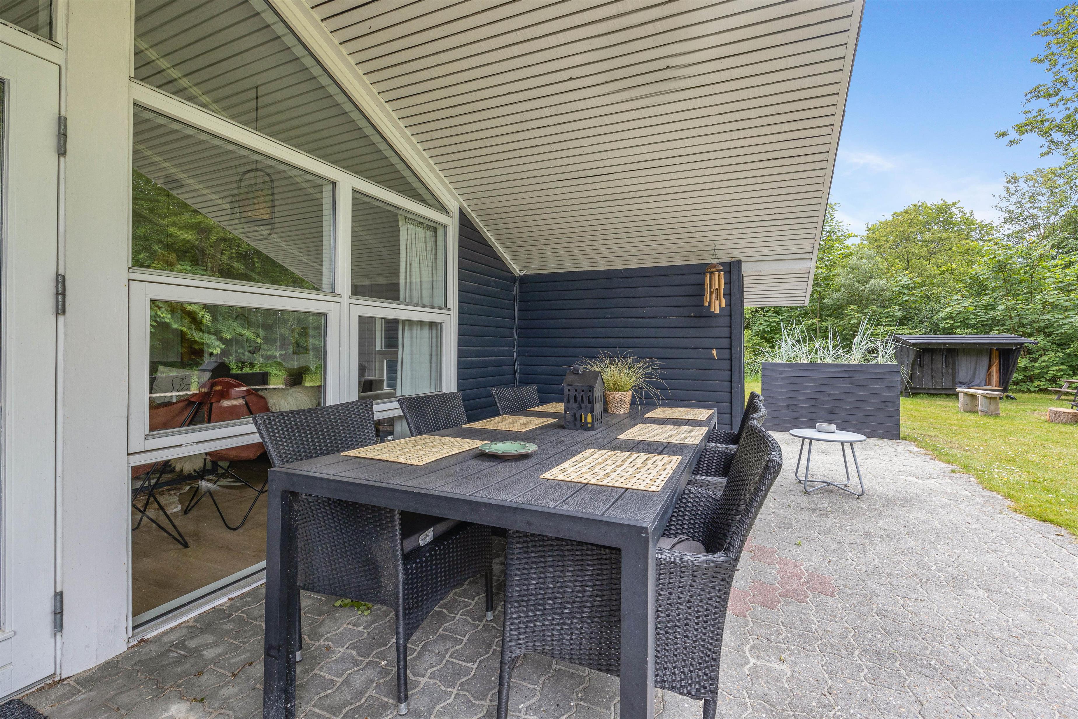 På terrassen venter bekvemme havemøbler og liggestole, som er perfekte til en afslappende stund i solens varme. Når dagen går på hæld, kan I fyre op i grillen og tilberede en dejlig middag, som I kan nyde sammen omkring bålstedet.