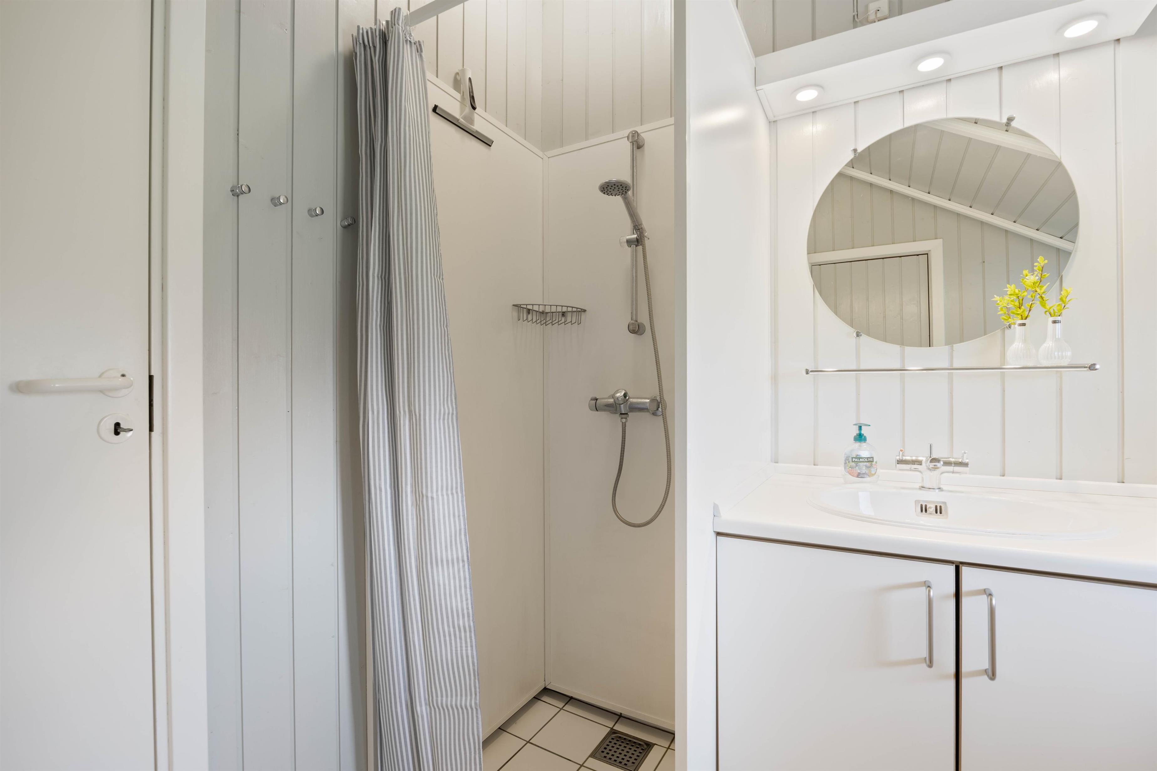 Badeværelset i ferieboligen har både gulvvarme og god plads, så I rigtig kan føle jer godt tilpas. Dertil er der en sauna, hvor I kan blive varmet igennem efter en lang gåtur i området eller efter en stille og rolig feriedag.