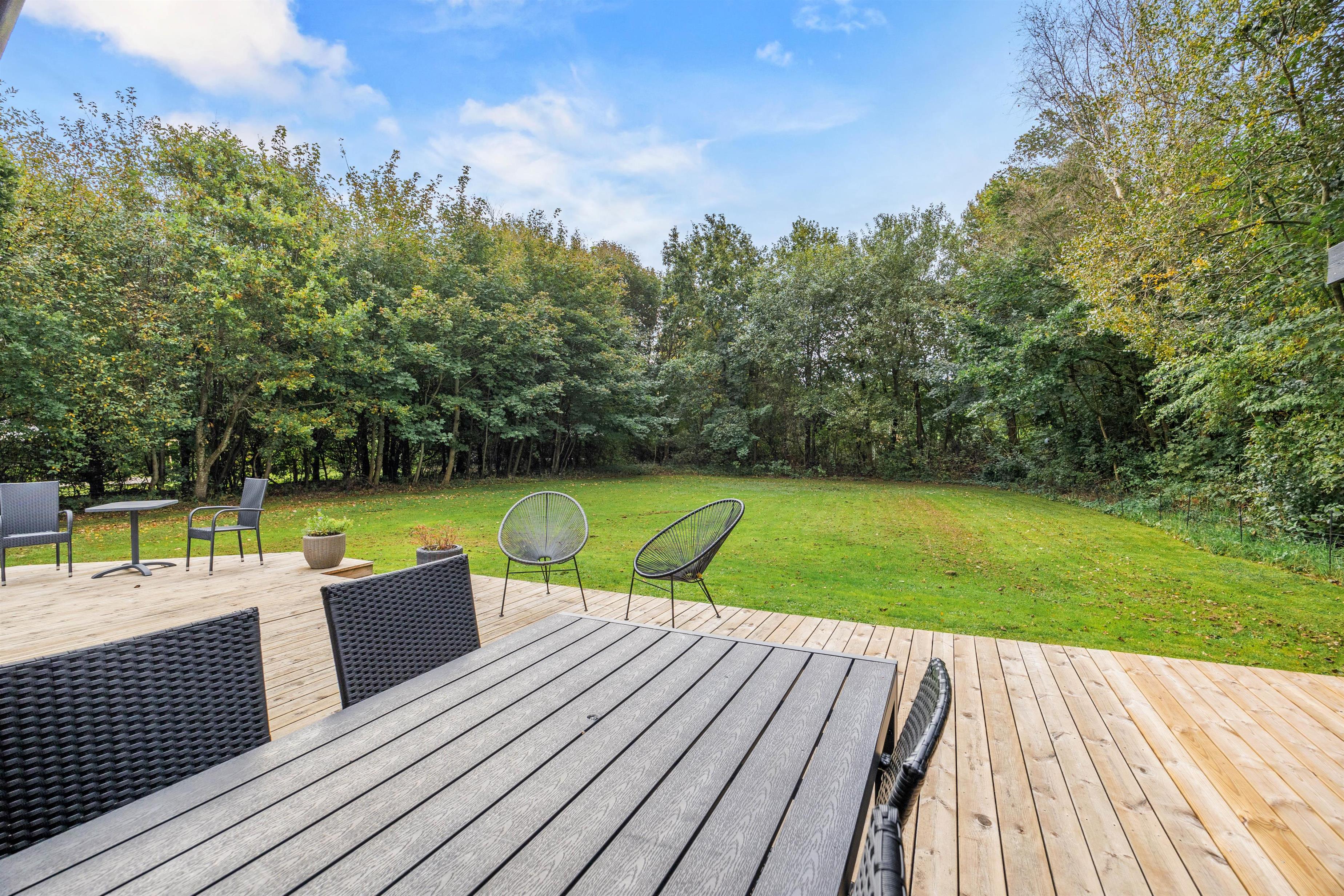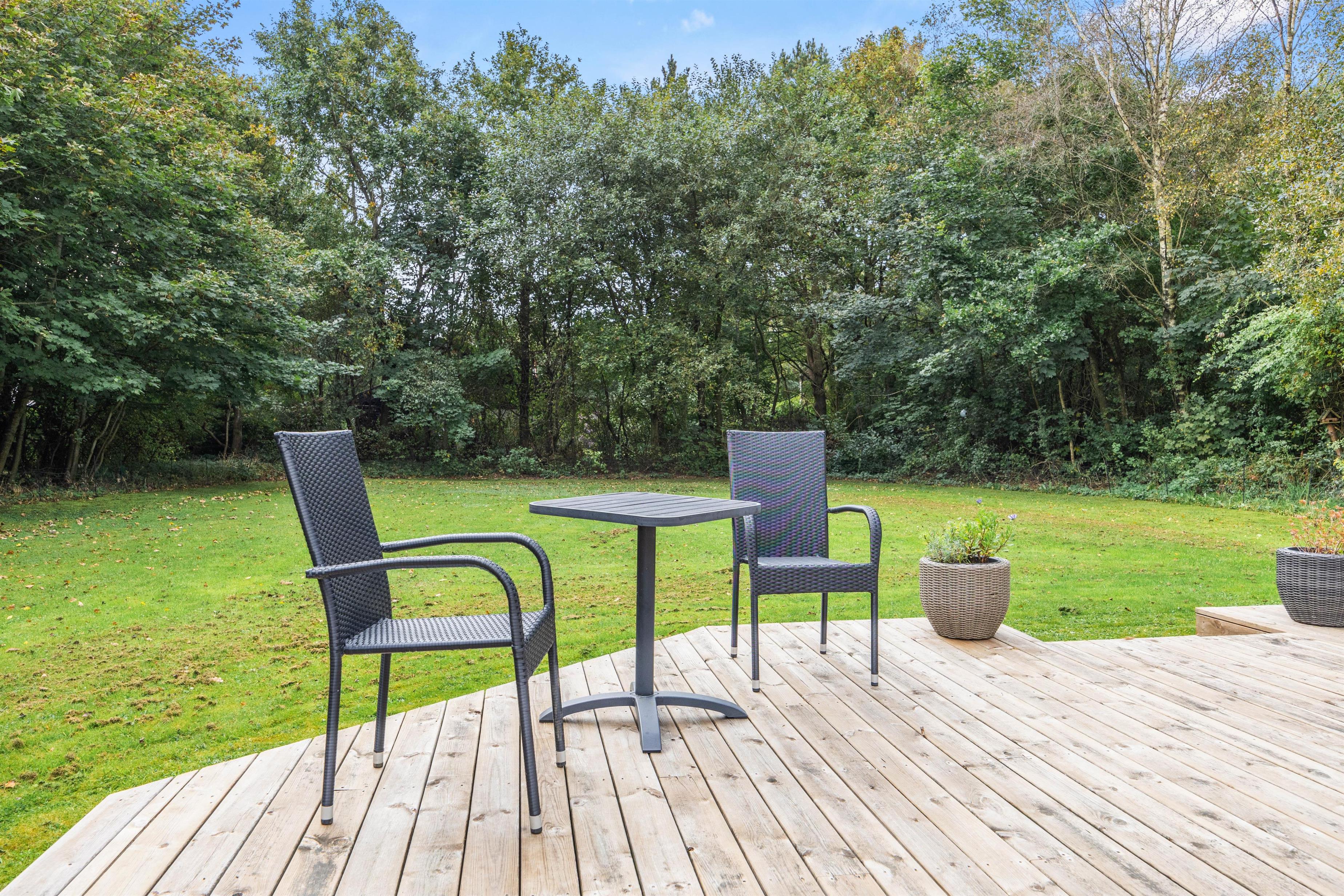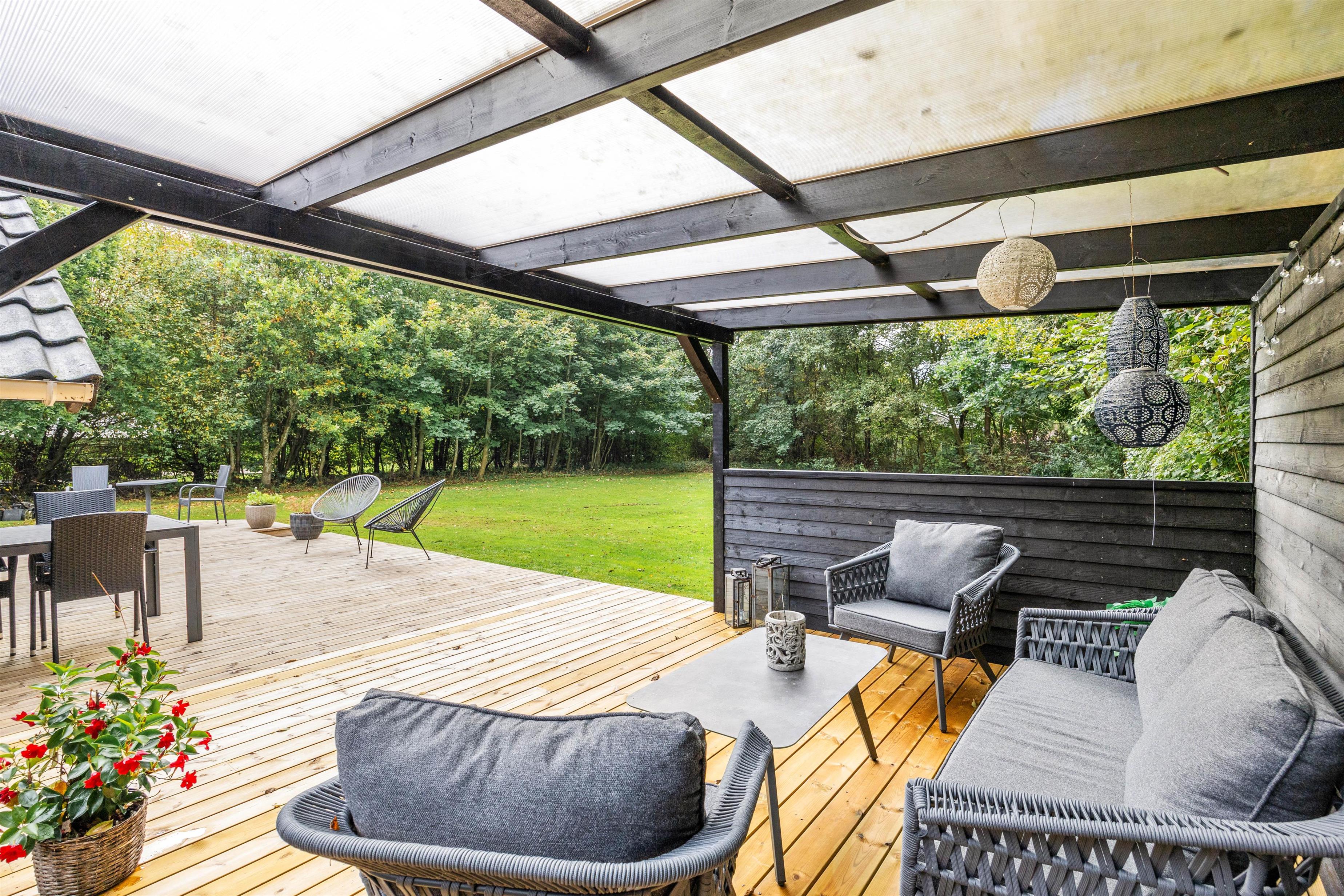 Fra stuen kan I gå direkte ud på husets terrasse, der er delvis overdækket. Her kan hunden rende fri på den store, indhegnede plænegrund. På de solrige dage kan I slappe af på sommerhuset solsenge og i havemøblerne. Foretrækker I skyggen, kan I benytte jer af parasollen eller det hyggelige, overdækkede lounge område. Den store plæne indbyder til leg og spil, så her kan børnene rigtig få brændt noget krudt af. Når feriedagen lakker mod enden, kan I tænde op i grillen og tilberede lækre feriemåltider, som kan nydes på terrassen under åben himmel.