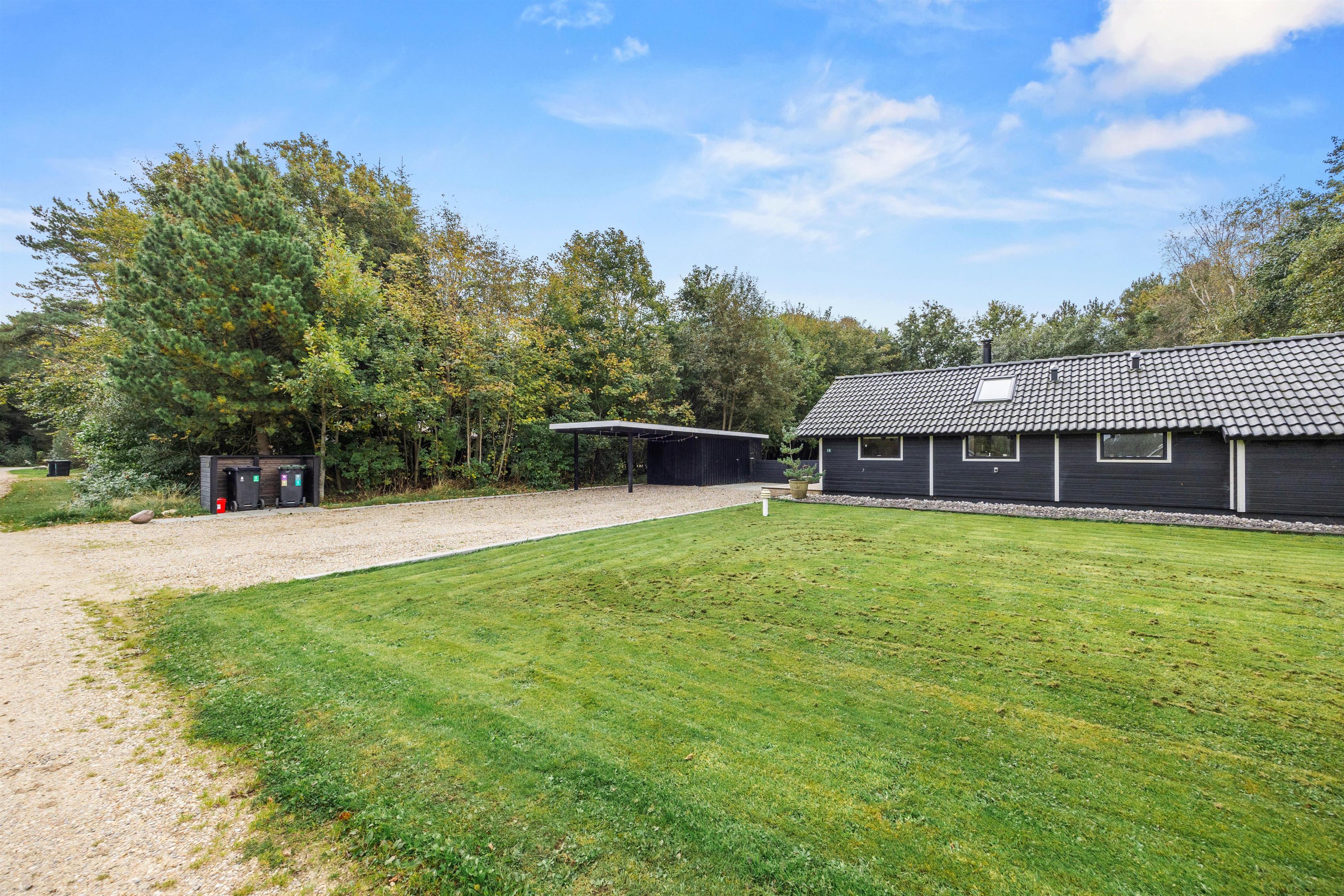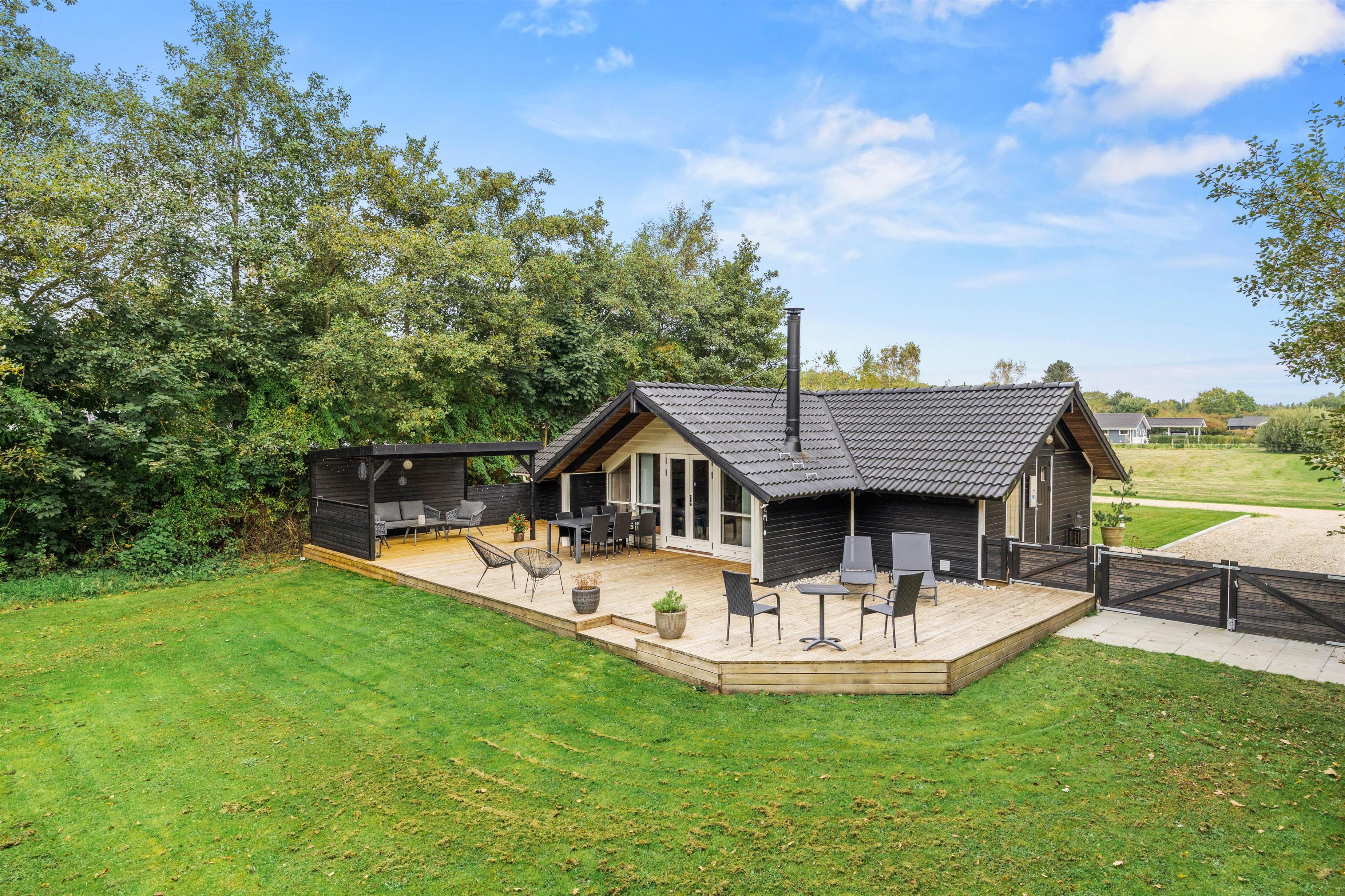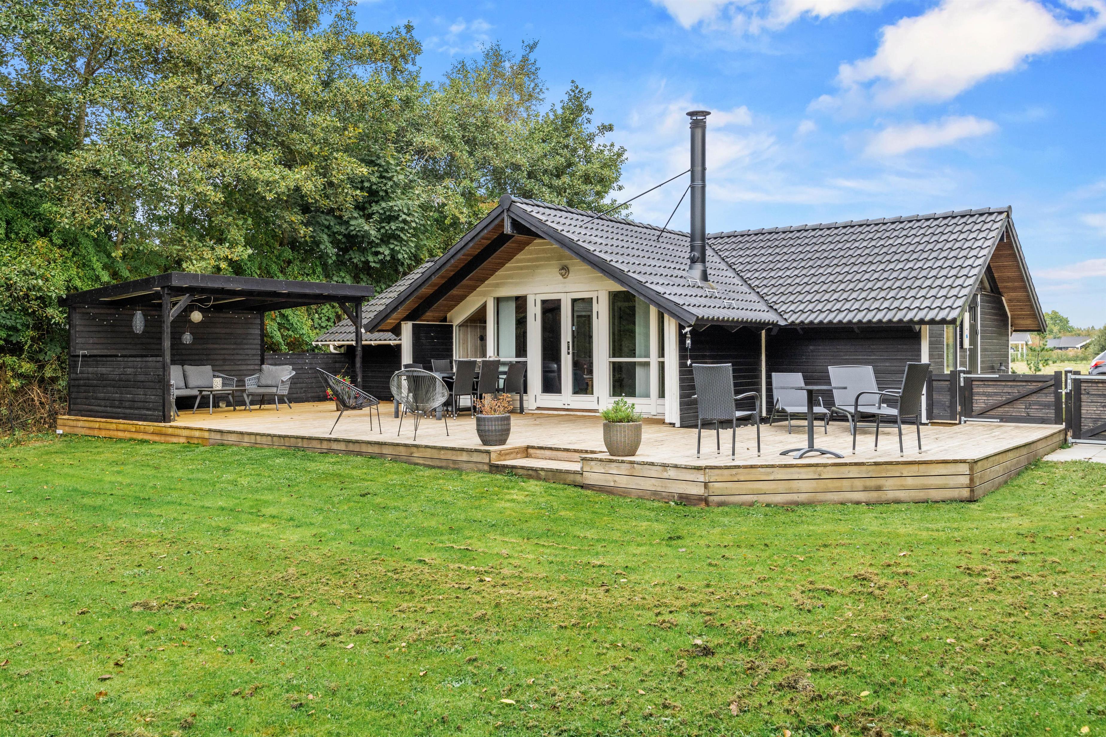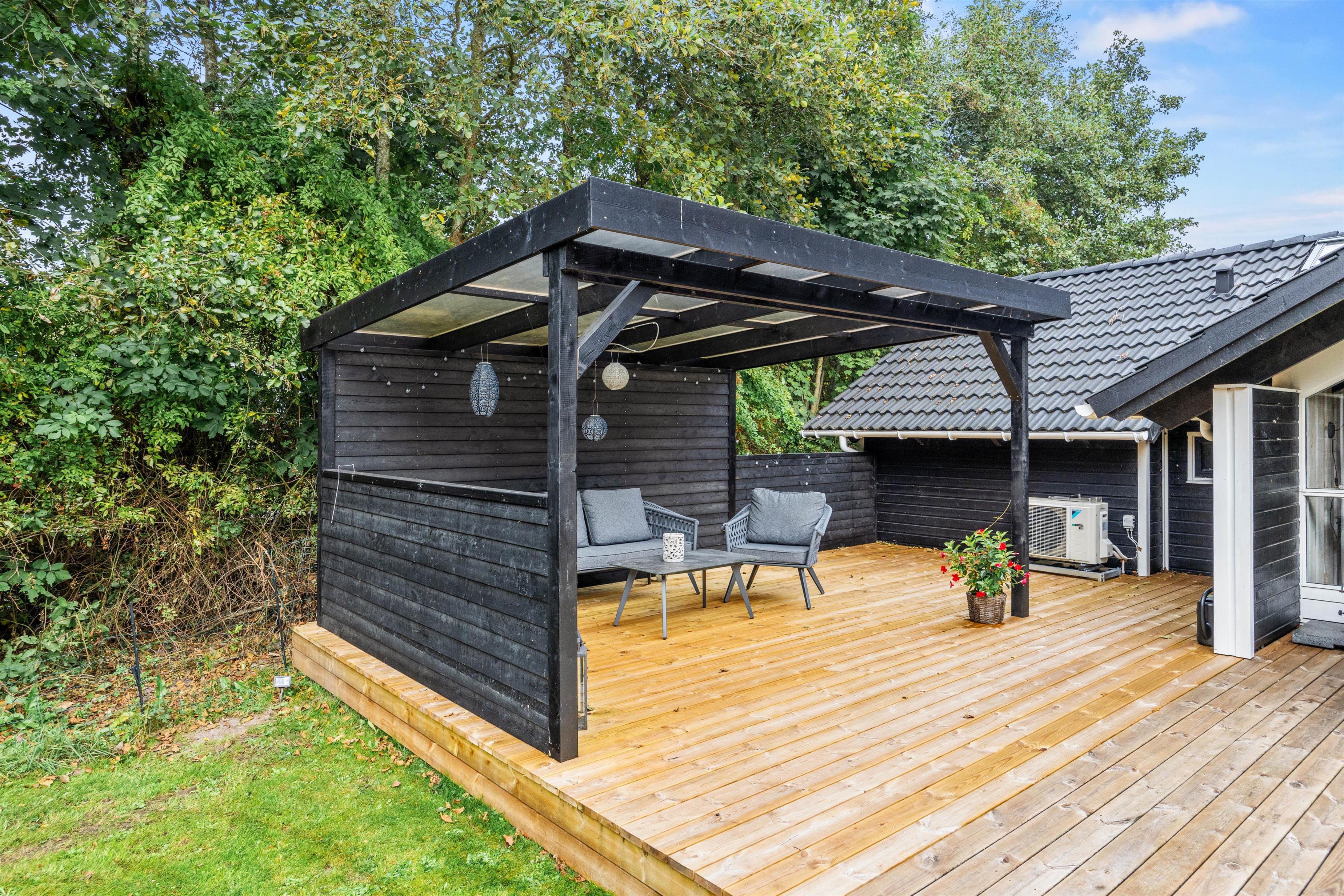 Fra stuen kan I gå direkte ud på husets terrasse, der er delvis overdækket. Her kan hunden rende fri på den store, indhegnede plænegrund. På de solrige dage kan I slappe af på sommerhuset solsenge og i havemøblerne. Foretrækker I skyggen, kan I benytte jer af parasollen eller det hyggelige, overdækkede lounge område. Den store plæne indbyder til leg og spil, så her kan børnene rigtig få brændt noget krudt af. Når feriedagen lakker mod enden, kan I tænde op i grillen og tilberede lækre feriemåltider, som kan nydes på terrassen under åben himmel.
