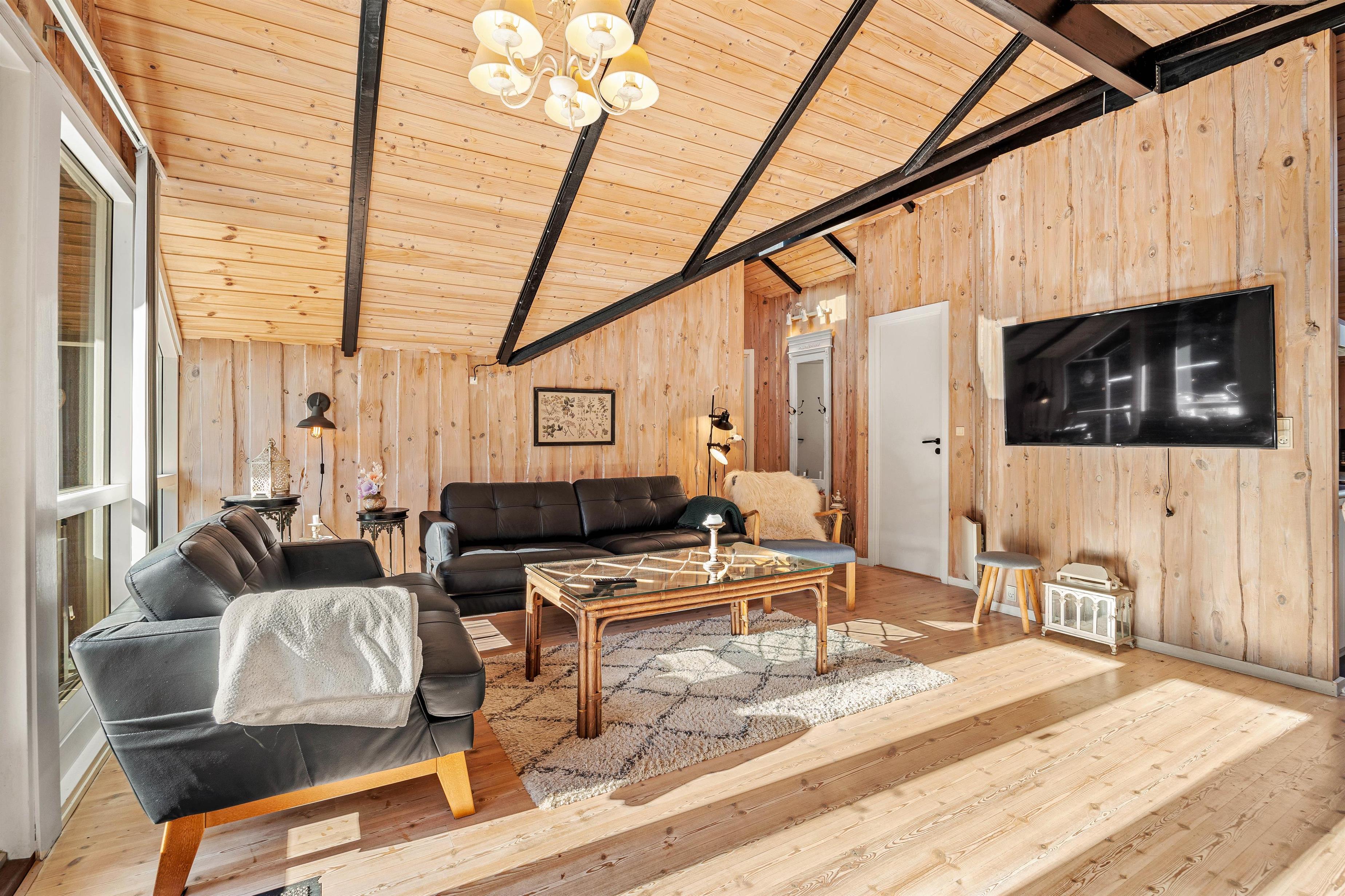Ved ankomst til sommerhuset kan I nemt parkere bilen i carporten, stille cyklerne i redskabsrummet og træde ind i entreen. Herfra får I adgang til vaskerummet, som er udstyret med både vaskemaskine og tørretumbler, så I kan holde tøjet rent under hele jeres ophold. Fra entreen kan I også gå videre ind i feriehusets hjerte, opholdsrummet, hvor stue og spisestue smelter sammen og skaber en hyggelig atmosfære med adgang til køkkenet. Her kan I nyde hinandens selskab, mens nogle tilbereder lækre måltider, og andre spiller brætspil eller hygger sig i den store sofa foran den varme brændeovn.