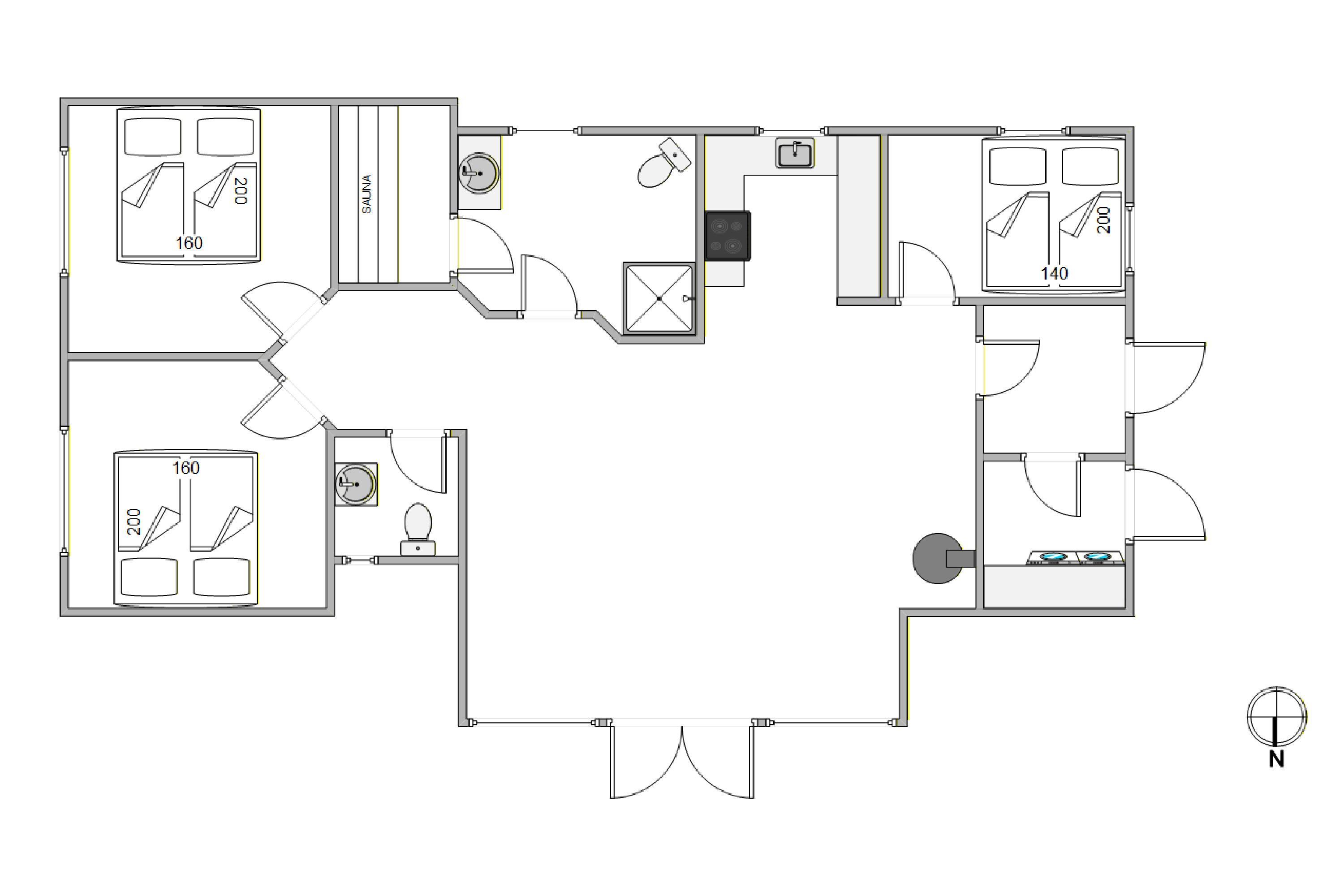 I den ene ende af huset finder I 3 værelser, der alle er indrettet med dobbeltsenge, hvoraf 2 af dem er 160 bred og den sidste er 140. Efter en skøn feriedag med masser af aktivitet, kan I hoppe en tur i sommerhuset sauna, hvor I kan slappe af mens I glemmer tid og sted. Ferieboligen har både et badeværelse og et gæstetoilet – på den måde kan I undgå kødannelse.