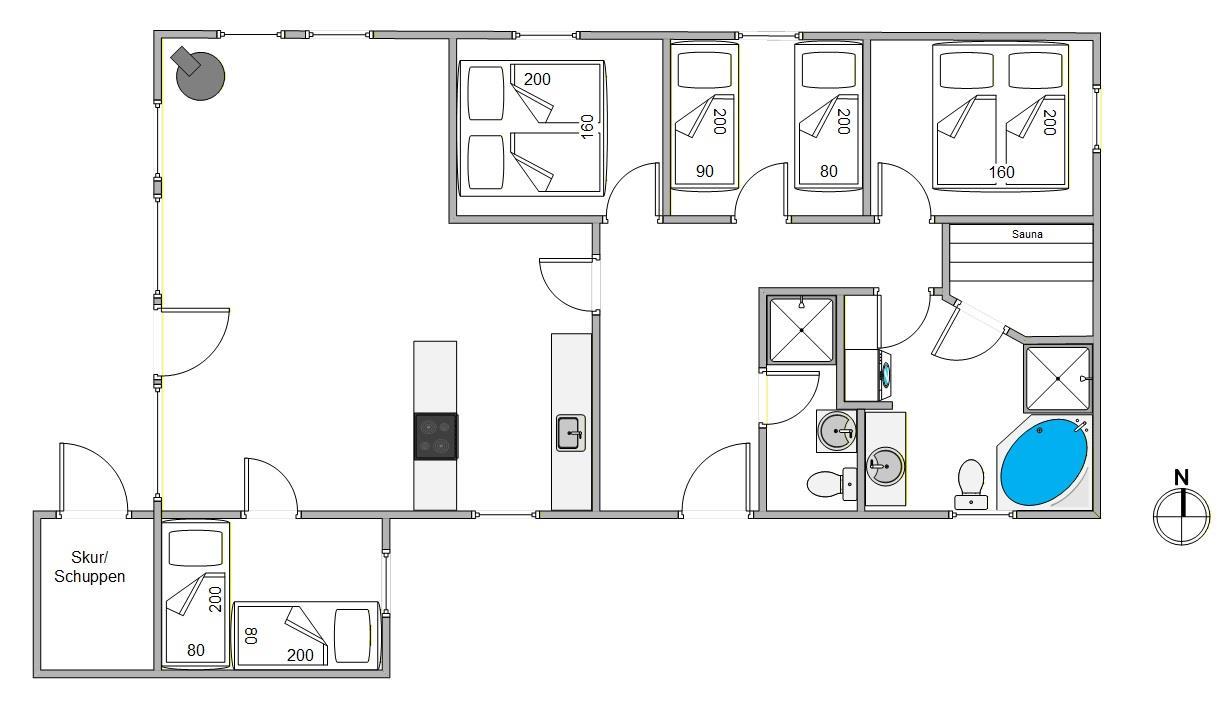 Sommerhusets 8 sovepladser er fordelt på 4 gode værelser, hvoraf der er 2 med dobbeltseng. De sidste 2 værelser er udstyret med 2 enkeltsenge hver.