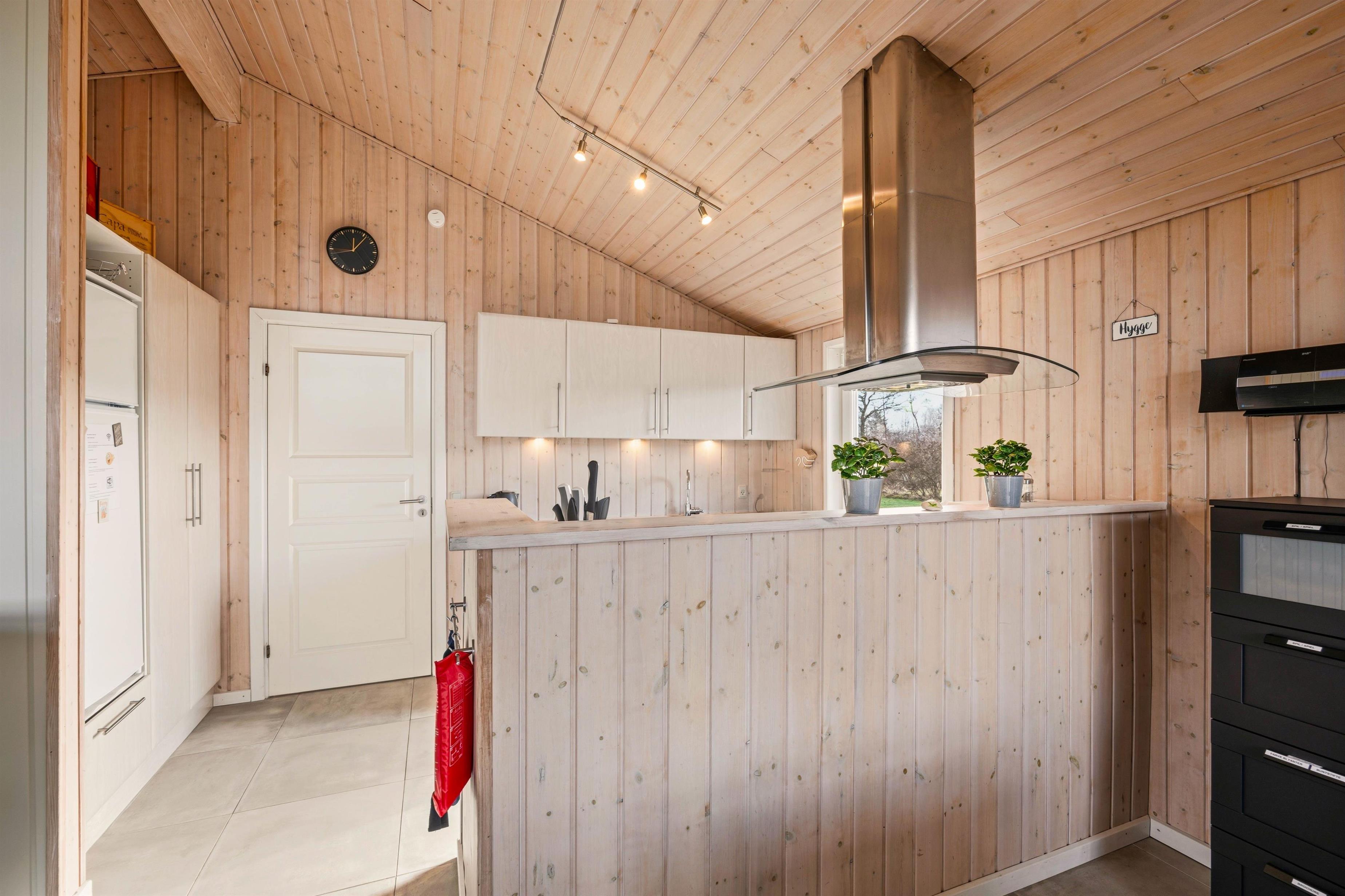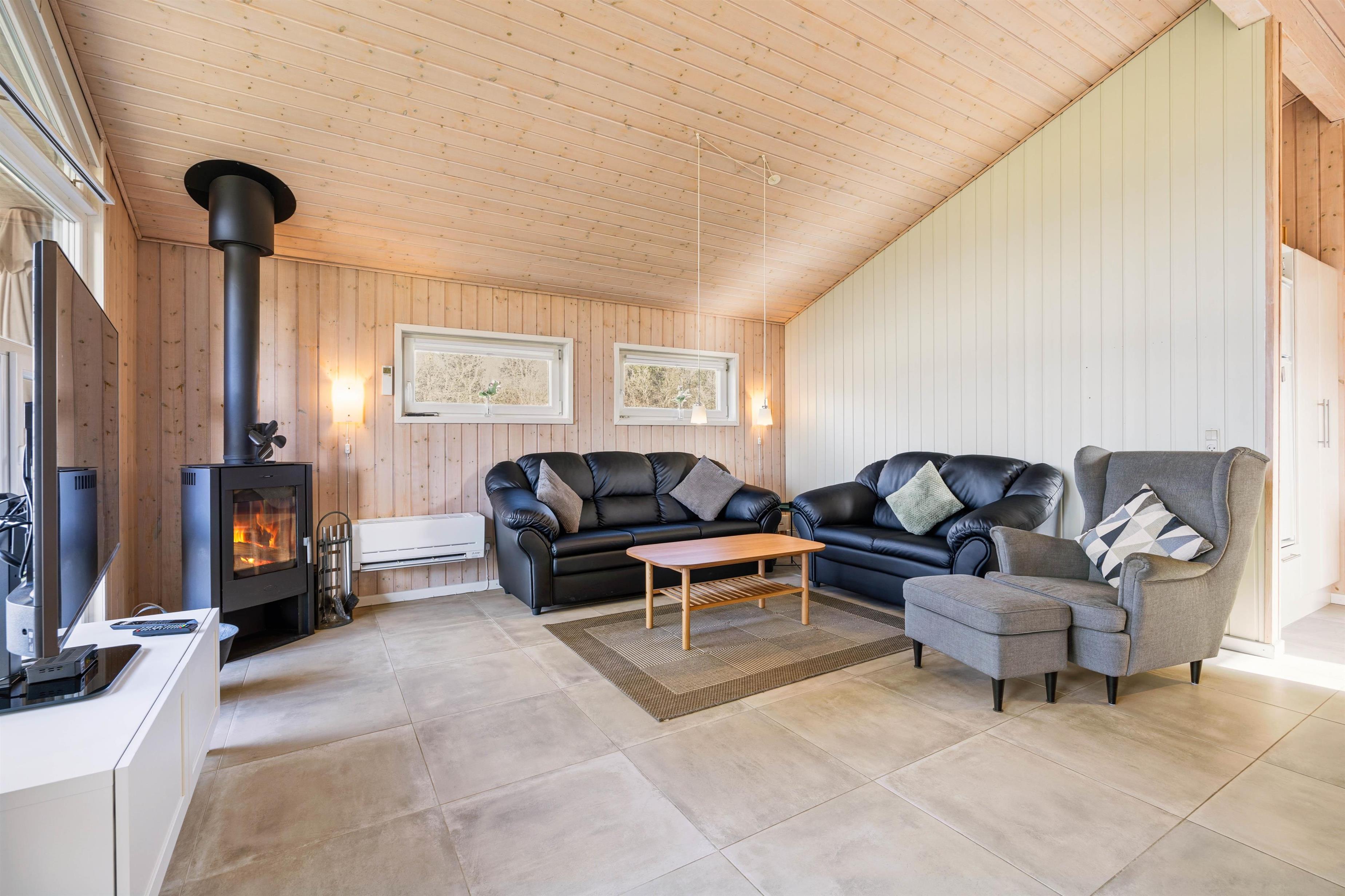 Hjerterummet i det lyse og venlige feriehus er opholdsstuen med gulvvarme, som ligger i åben forbindelse til spiseplads og køkken. I stuen kan du slappe af i en behagelig lænestol eller i sofaen, læse en god bog og lytte til den knitrende ild fra brændeovnen. Der er danske tv-kanaler i sommerhuset og som et ekstra plus er der både Wii og Playstation – Et stort hit blandt børn og barnlige sjæle.