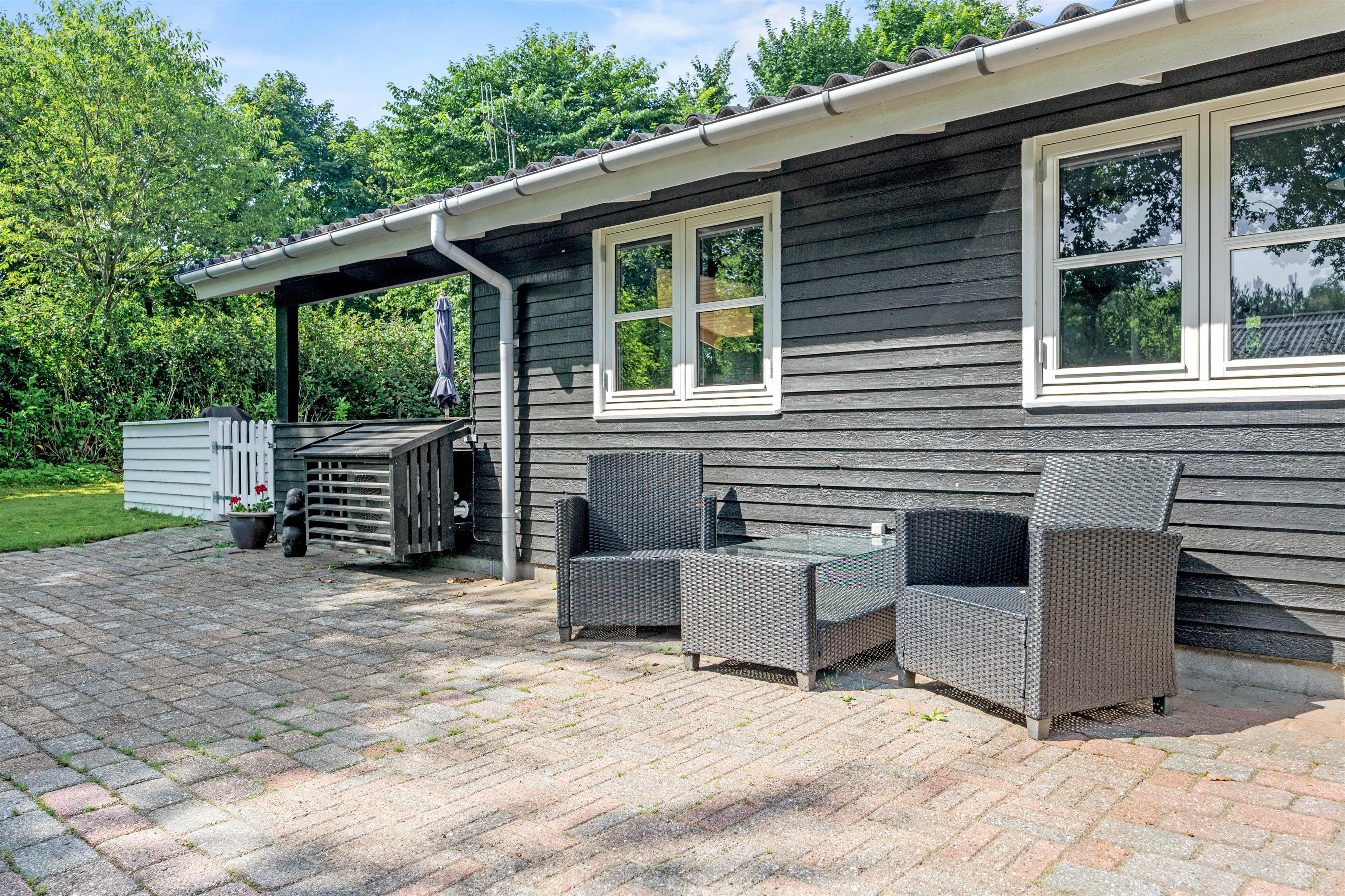 Fra terrassen kan I træde ud på den store plæne, som er perfekt til spil og leg. Hele ejendommen er indhegnet, så både store og små kan færdes frit og sikkert. Børnene vil kunne bruge mange timer på havens gynge eller have det sjovt i sandkassen. Fra terrassen er der adgang til et mindre depotrum.