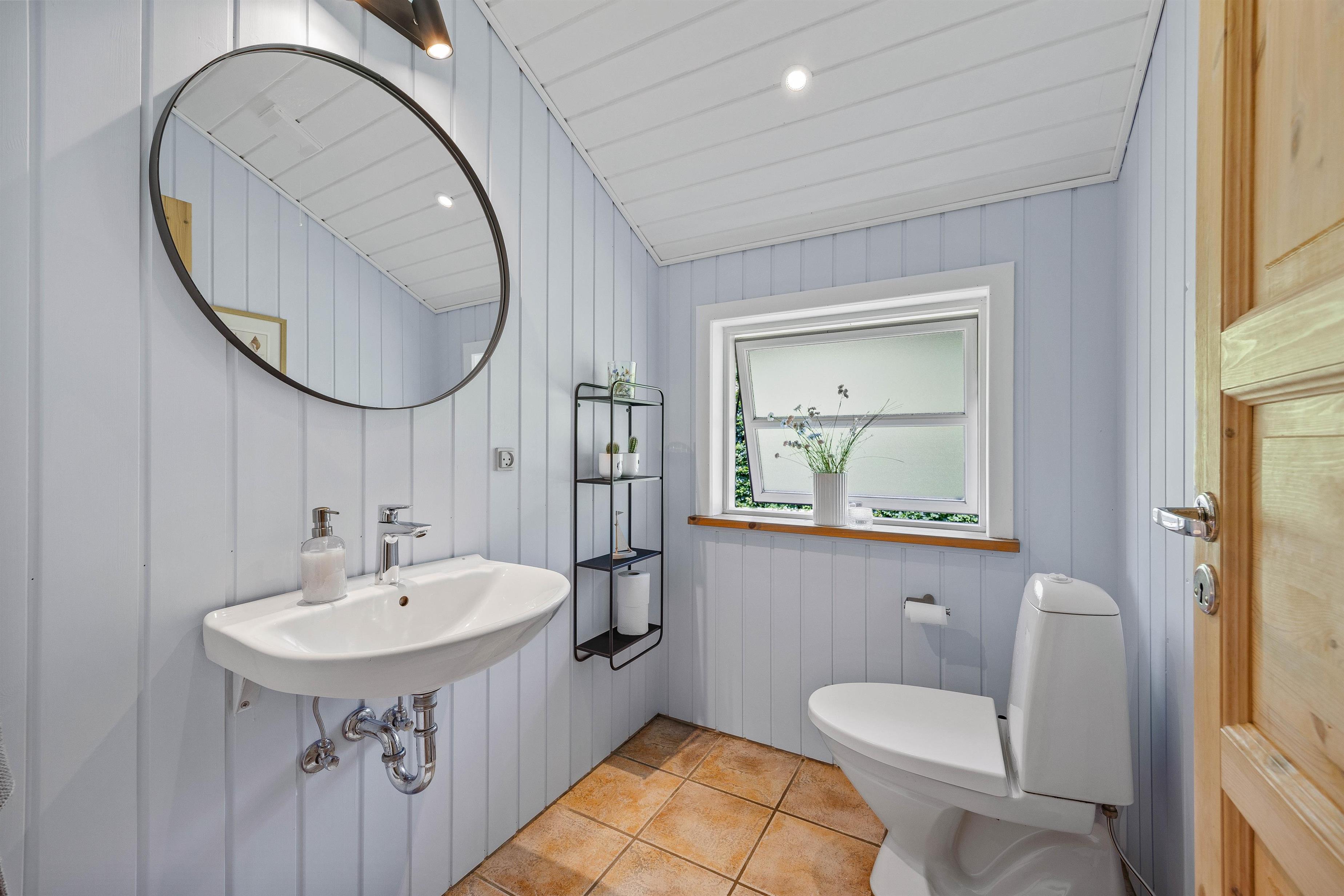I sommerhuset er der ét badeværelse, som byder på både tømmespa og sauna, hvor I kan slappe af og nyde lidt luksus, efter en lang dag fyldt med intryk og oplevelser. Der er også et separat gæstetoilet for ekstra bekvemmelighed. Badeværelset indeholder en praktisk vaskesøjle med vaskemaskine og tørretumbler, så I kan holde styr på garderoben under hele ferien.