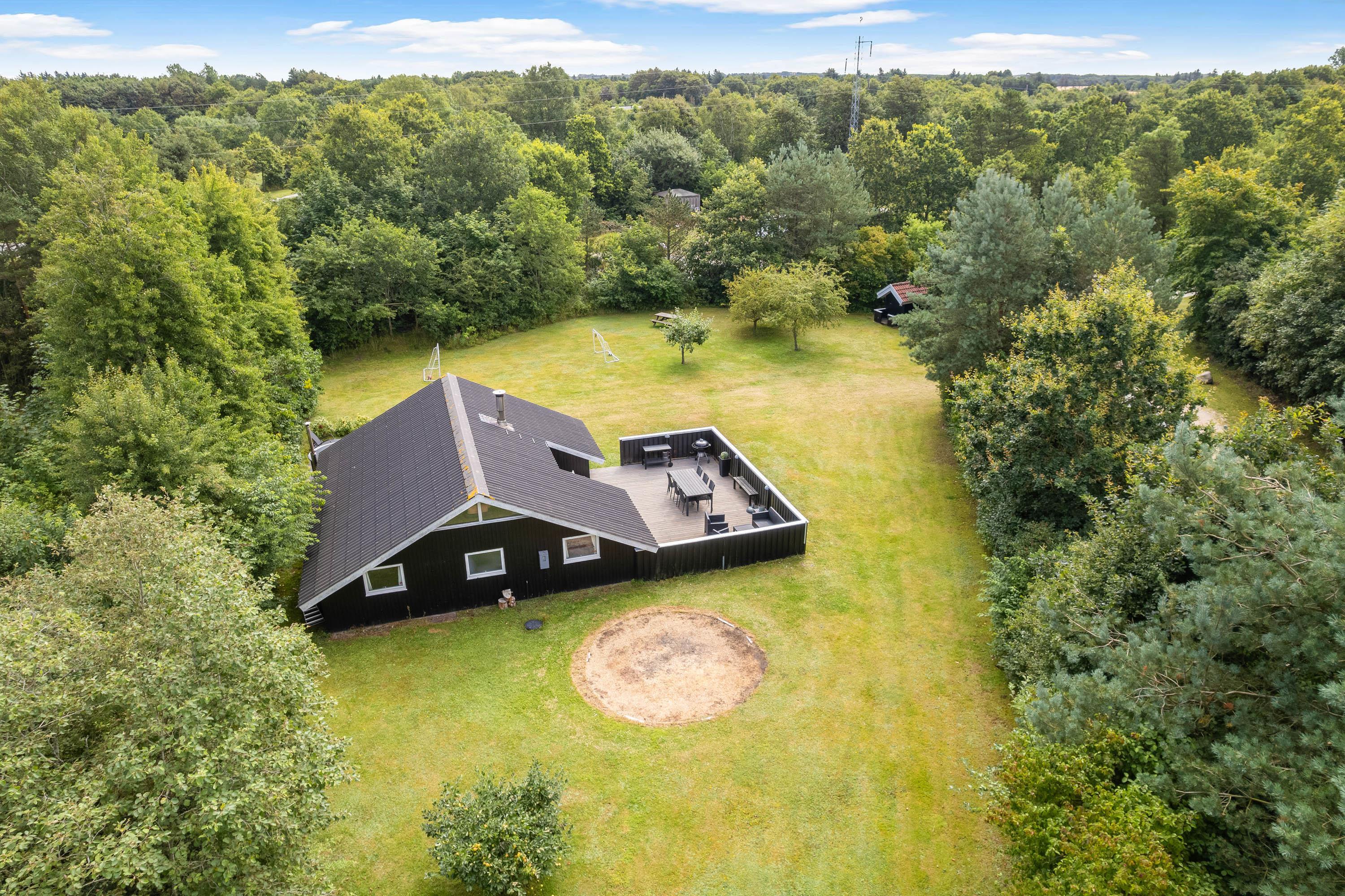 Stor græsplæne med åben terrasse, vildmarksbad og shelter