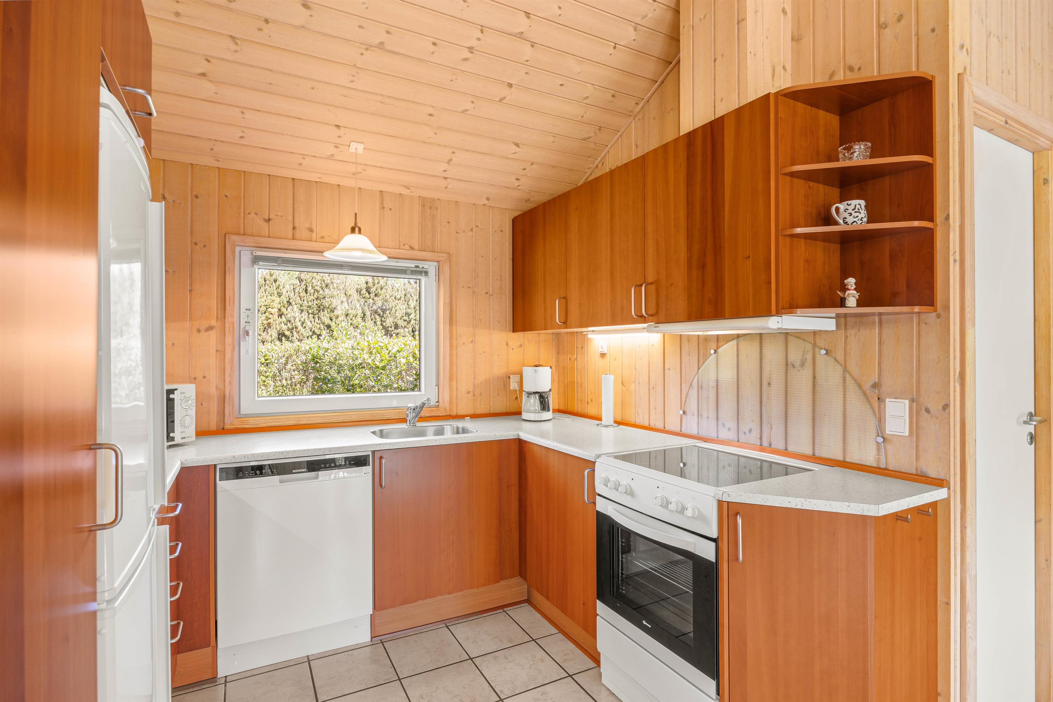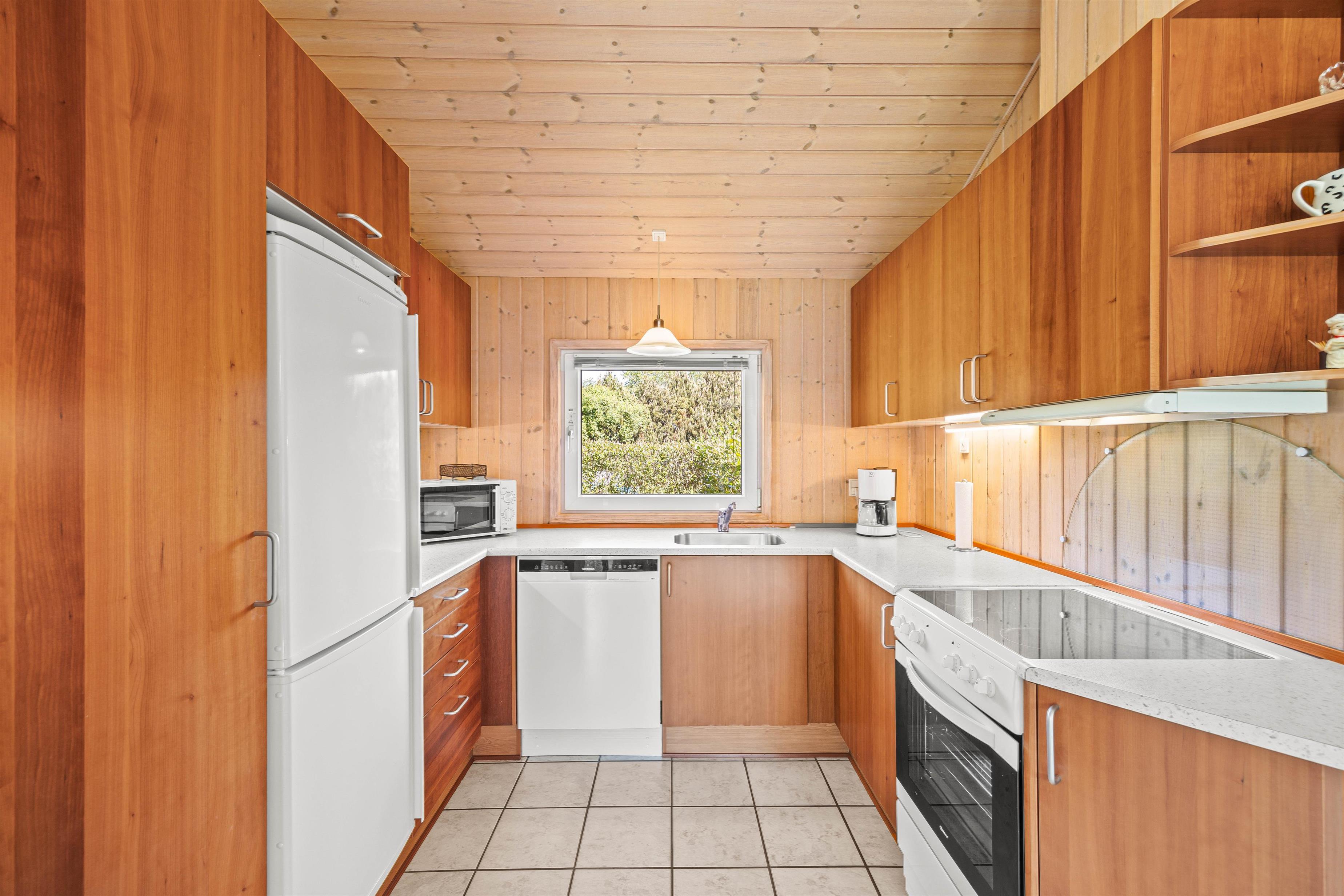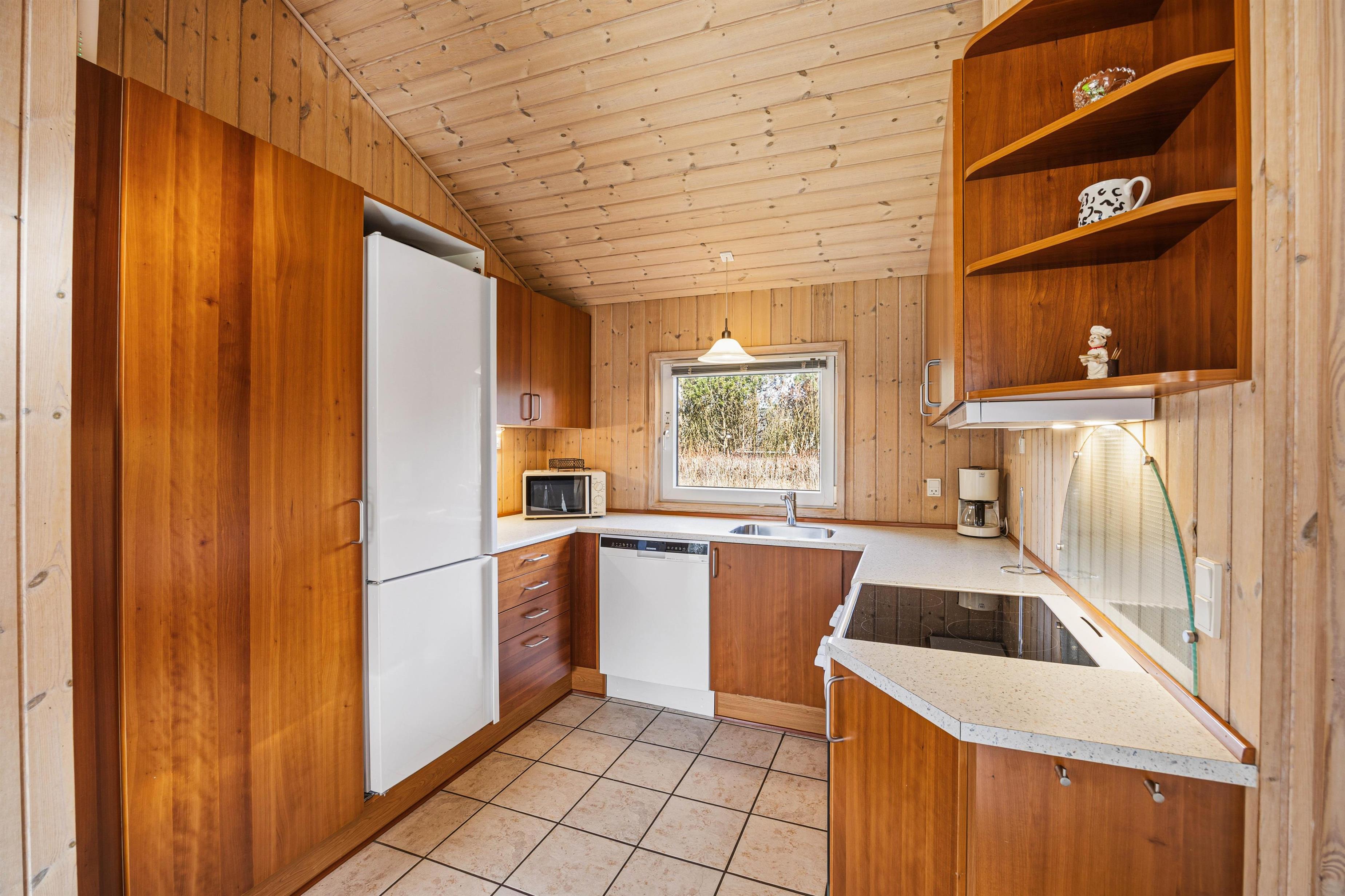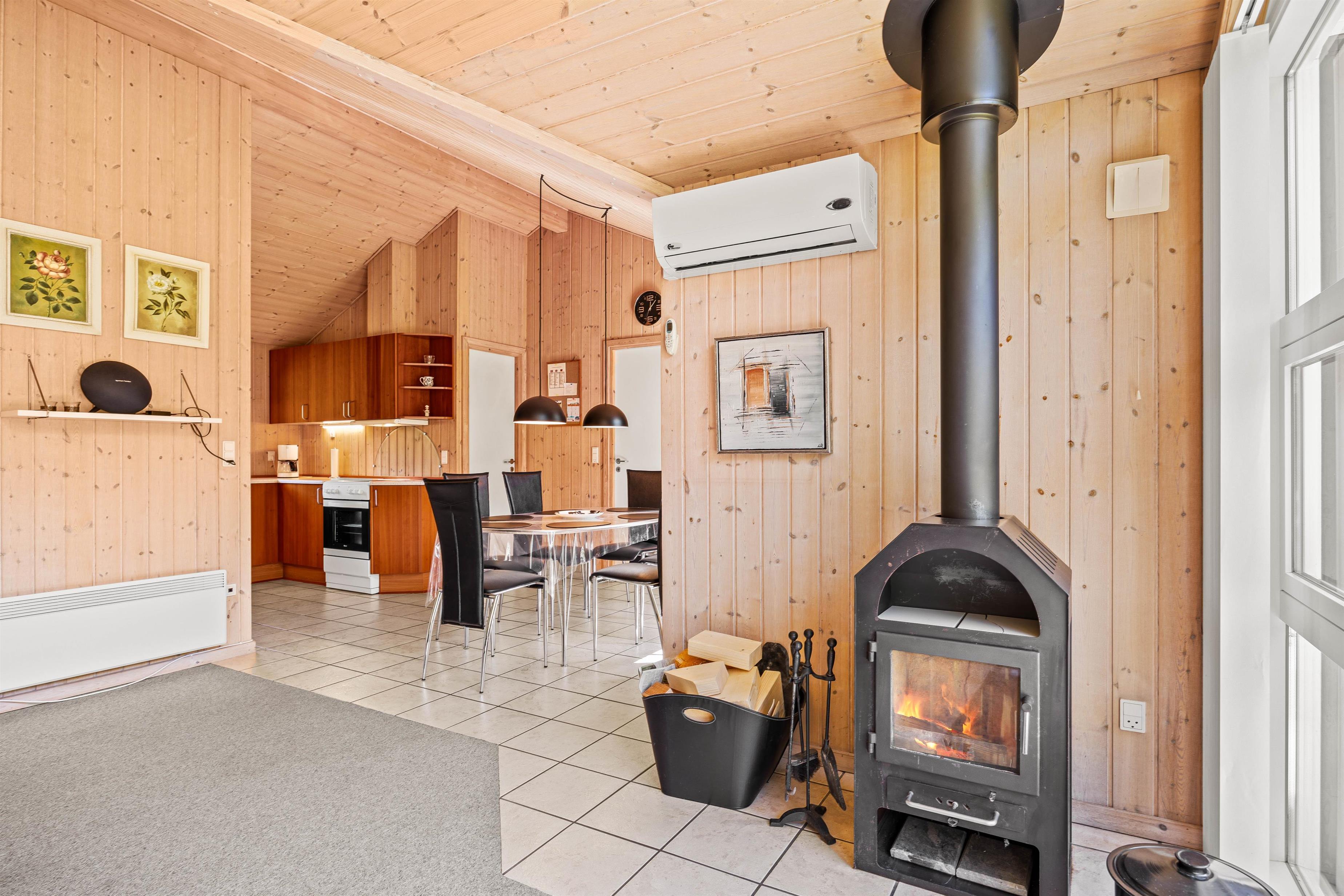 Køkkenet er praktisk indrettet med en opvaskemaskine, så I hurtigt kan tage jer af opvasken og komme videre med jeres eventyr langs Vestkysten. I stuen finder I komfortable møbler, der giver plads til alle, og en hyggelig brændeovn til at varme jer på kolde morgener. Sommerhuset er lyst med træpaneler på væggene og store vinduer, der inviterer masser af naturligt lys indenfor.
