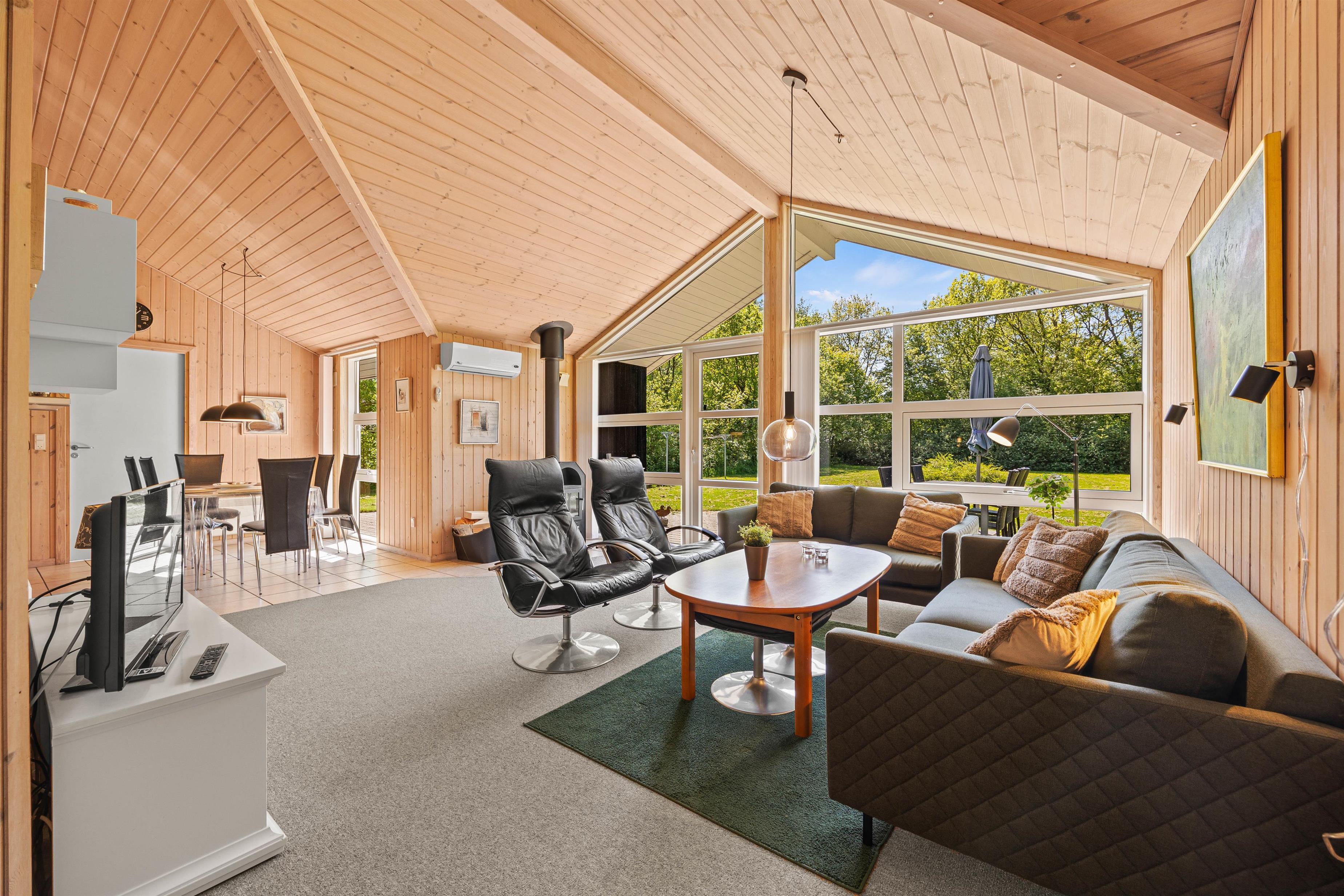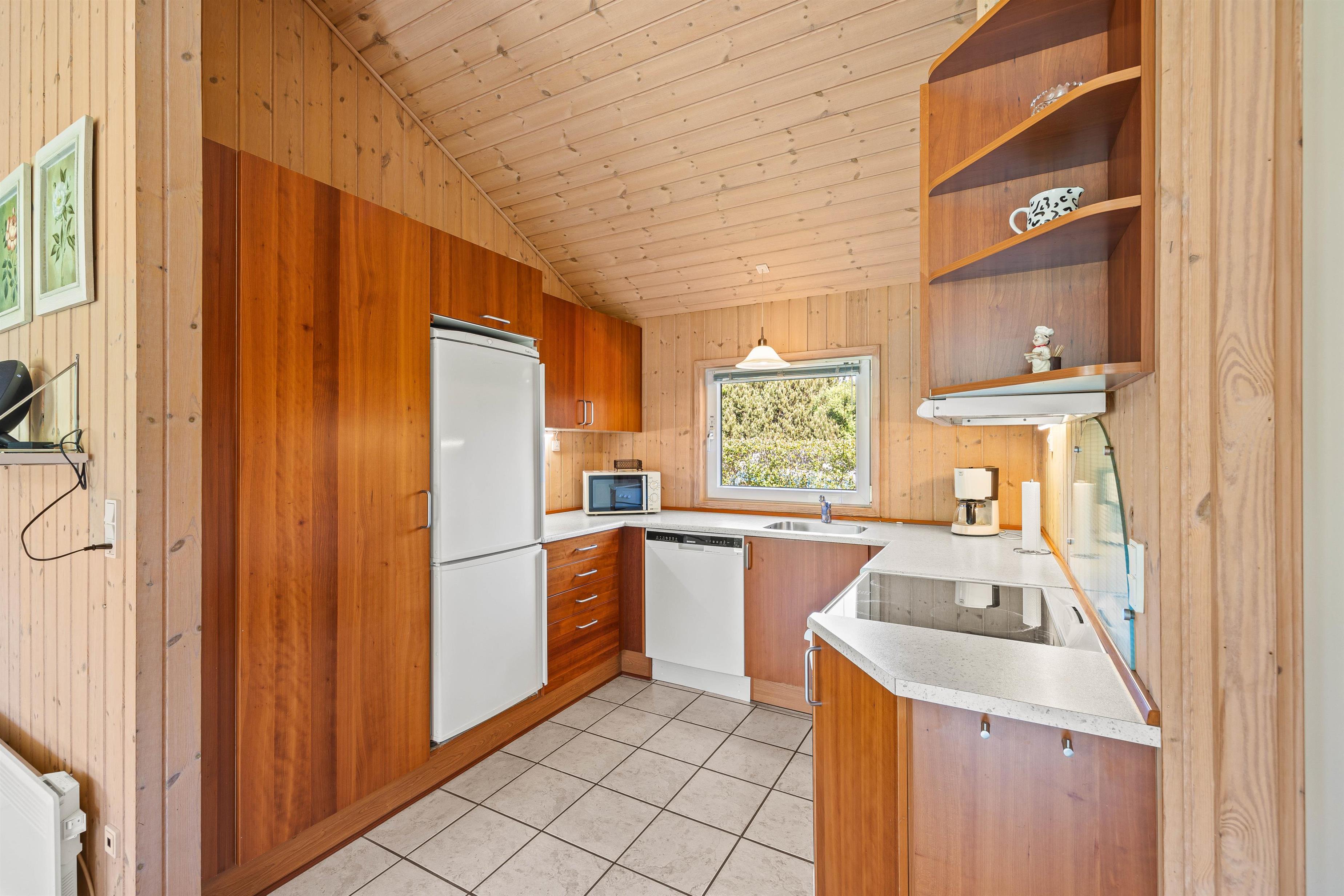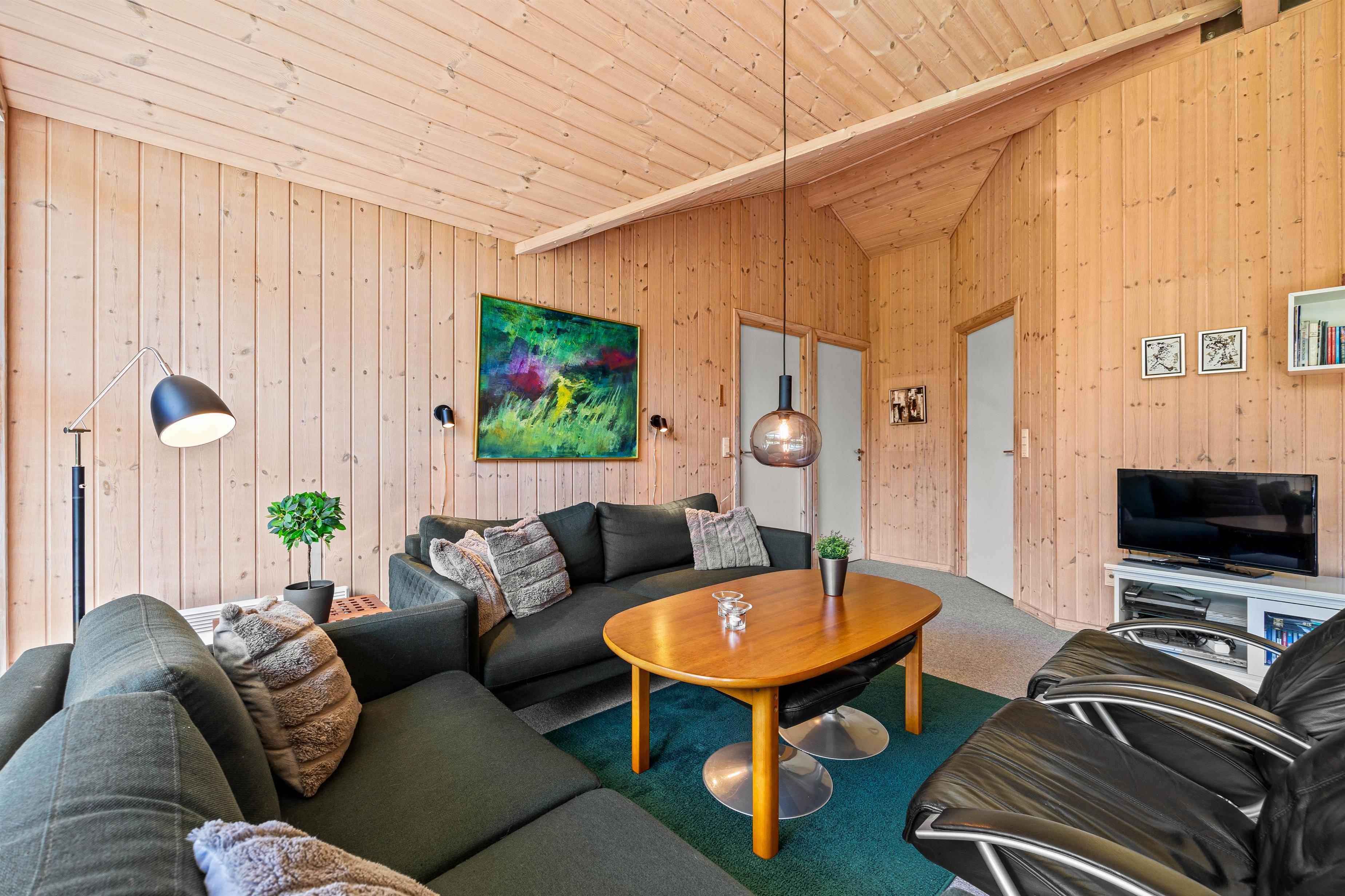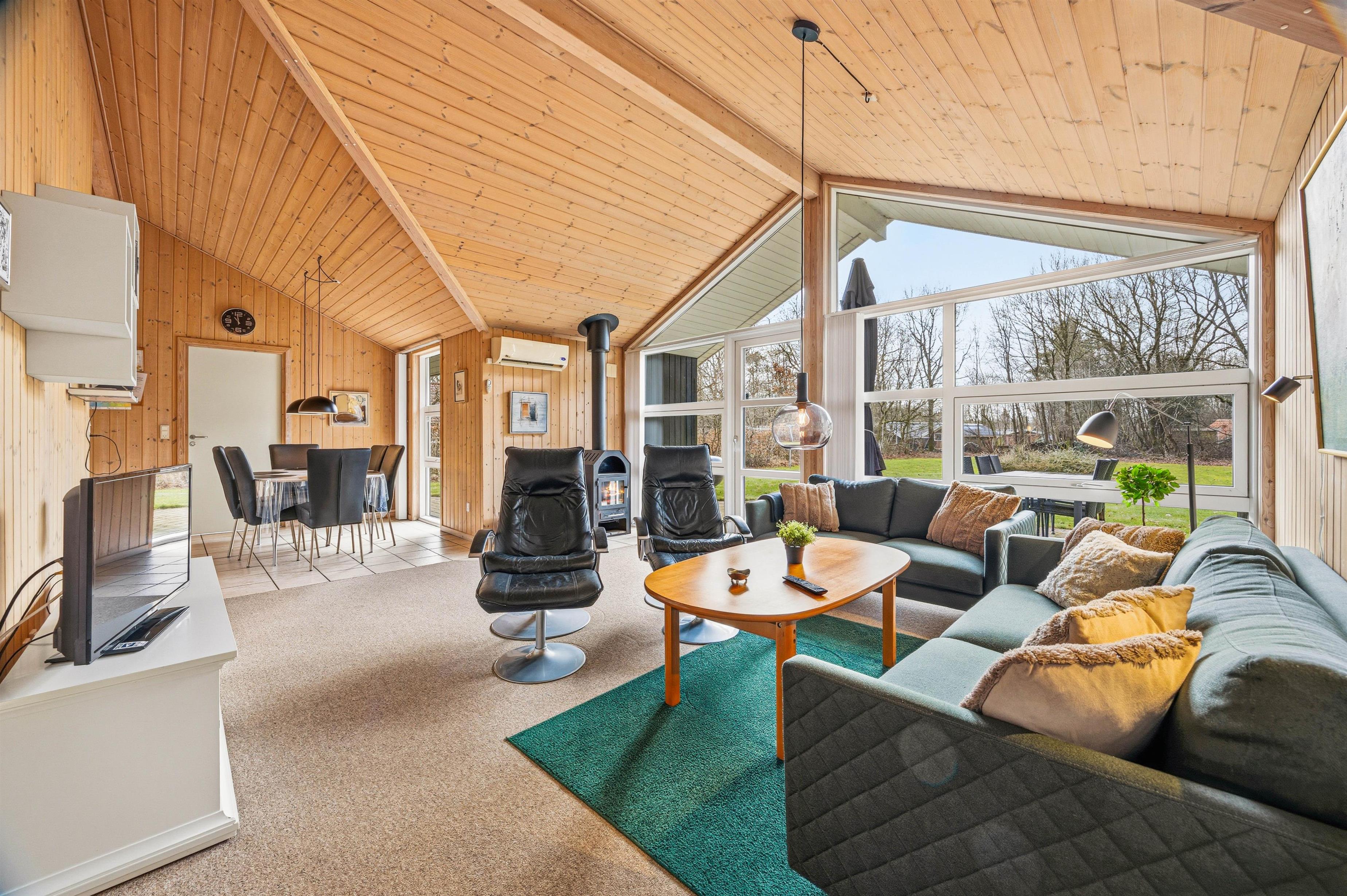 Køkkenet er praktisk indrettet med en opvaskemaskine, så I hurtigt kan tage jer af opvasken og komme videre med jeres eventyr langs Vestkysten. I stuen finder I komfortable møbler, der giver plads til alle, og en hyggelig brændeovn til at varme jer på kolde morgener. Sommerhuset er lyst med træpaneler på væggene og store vinduer, der inviterer masser af naturligt lys indenfor.