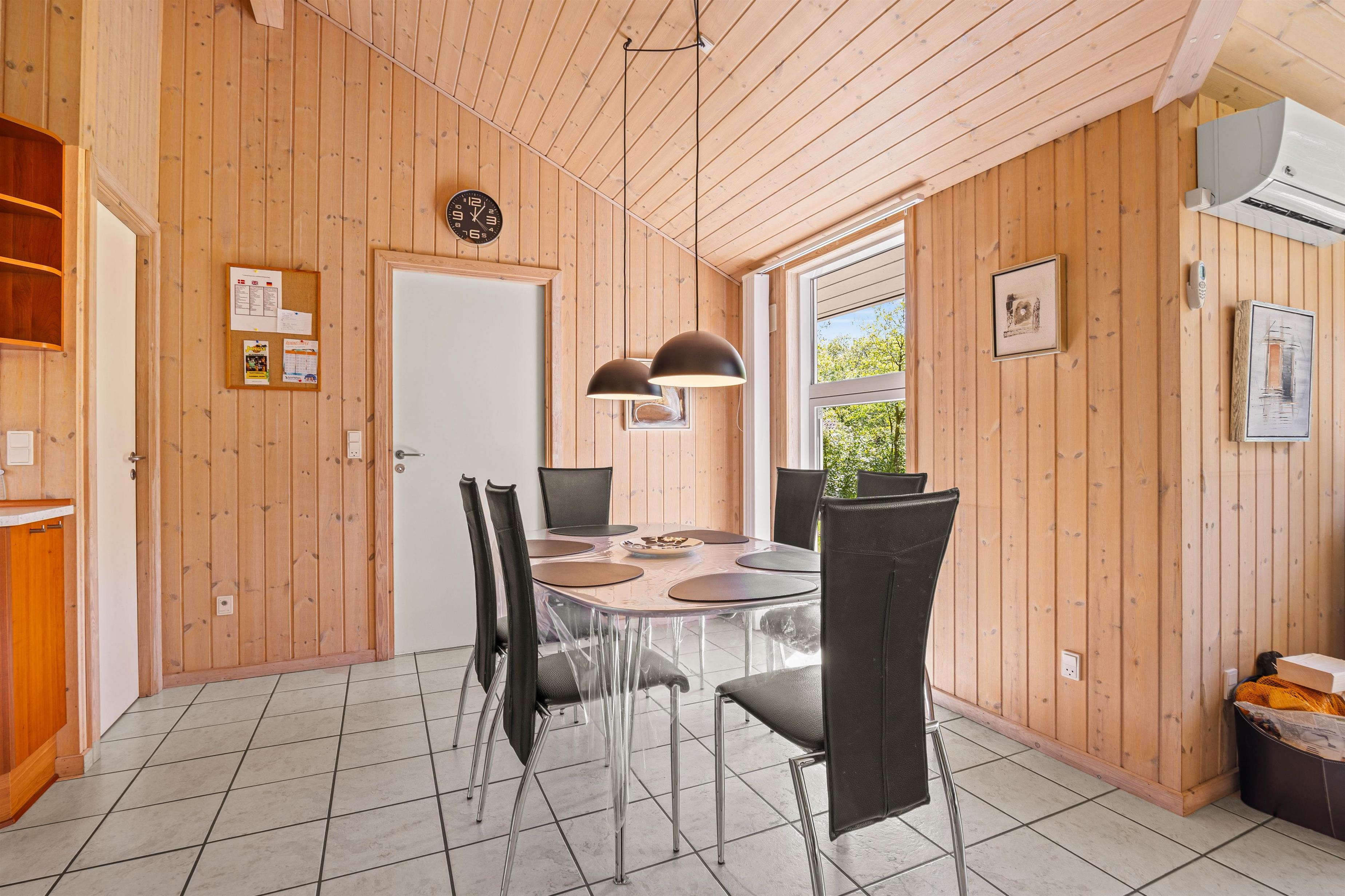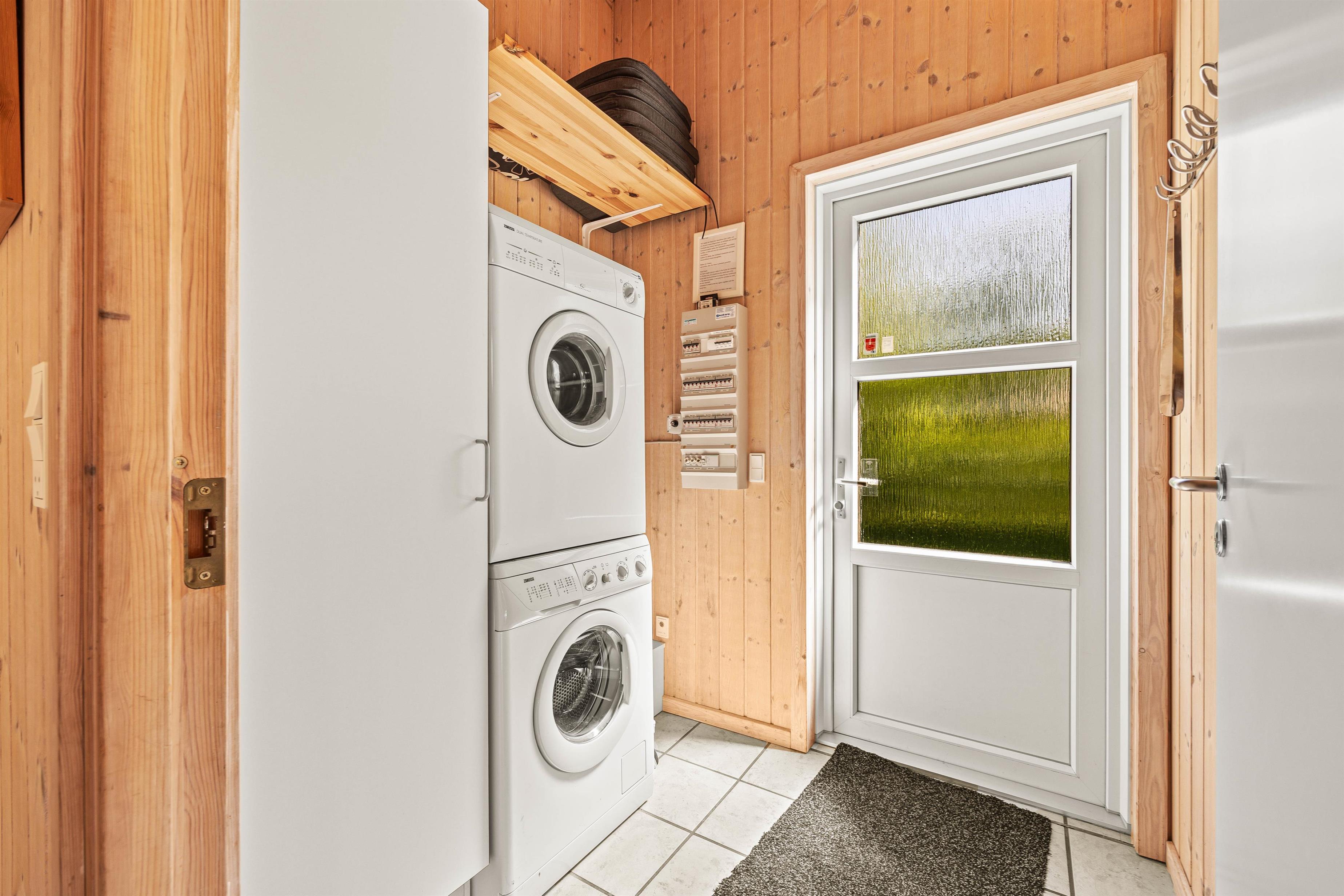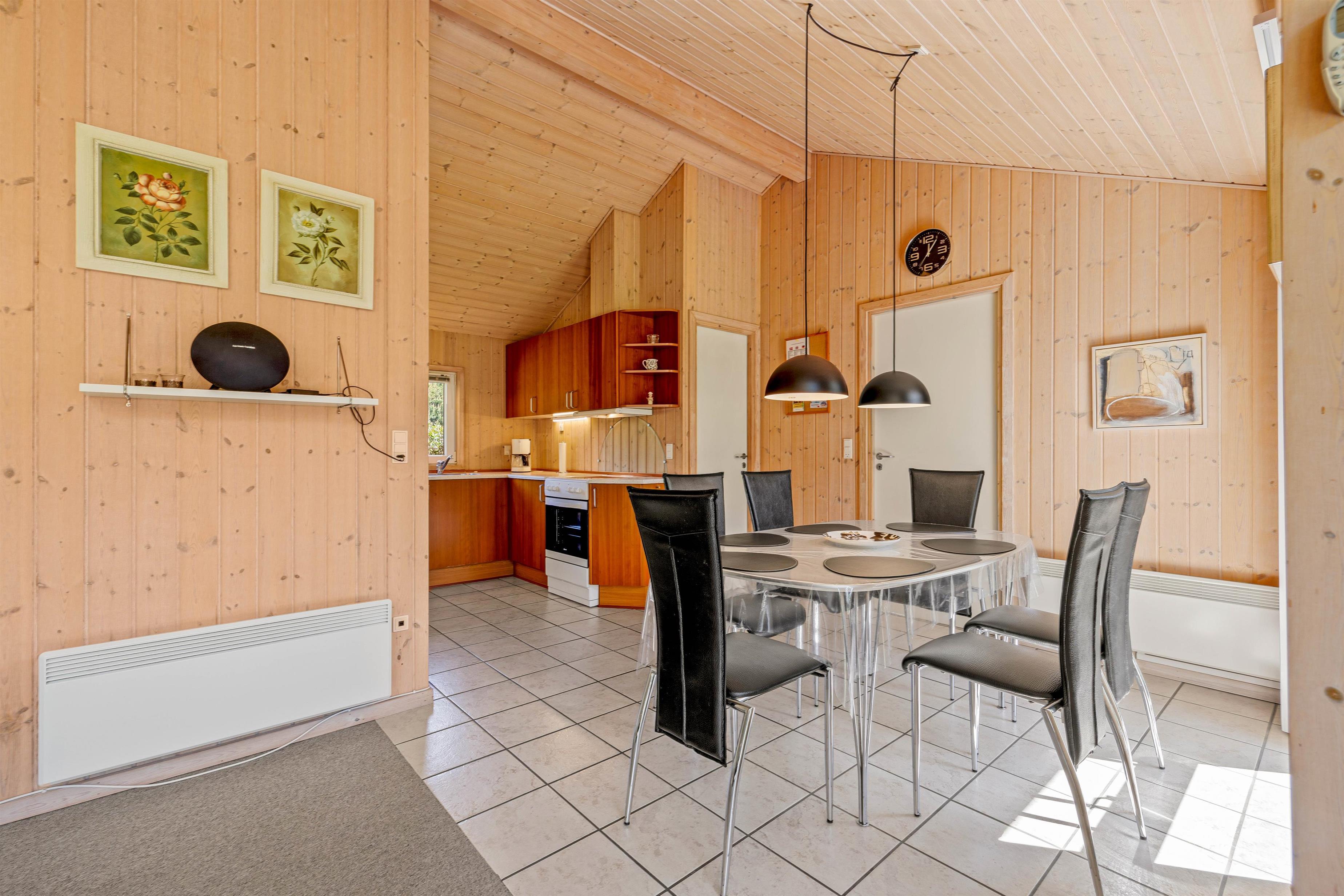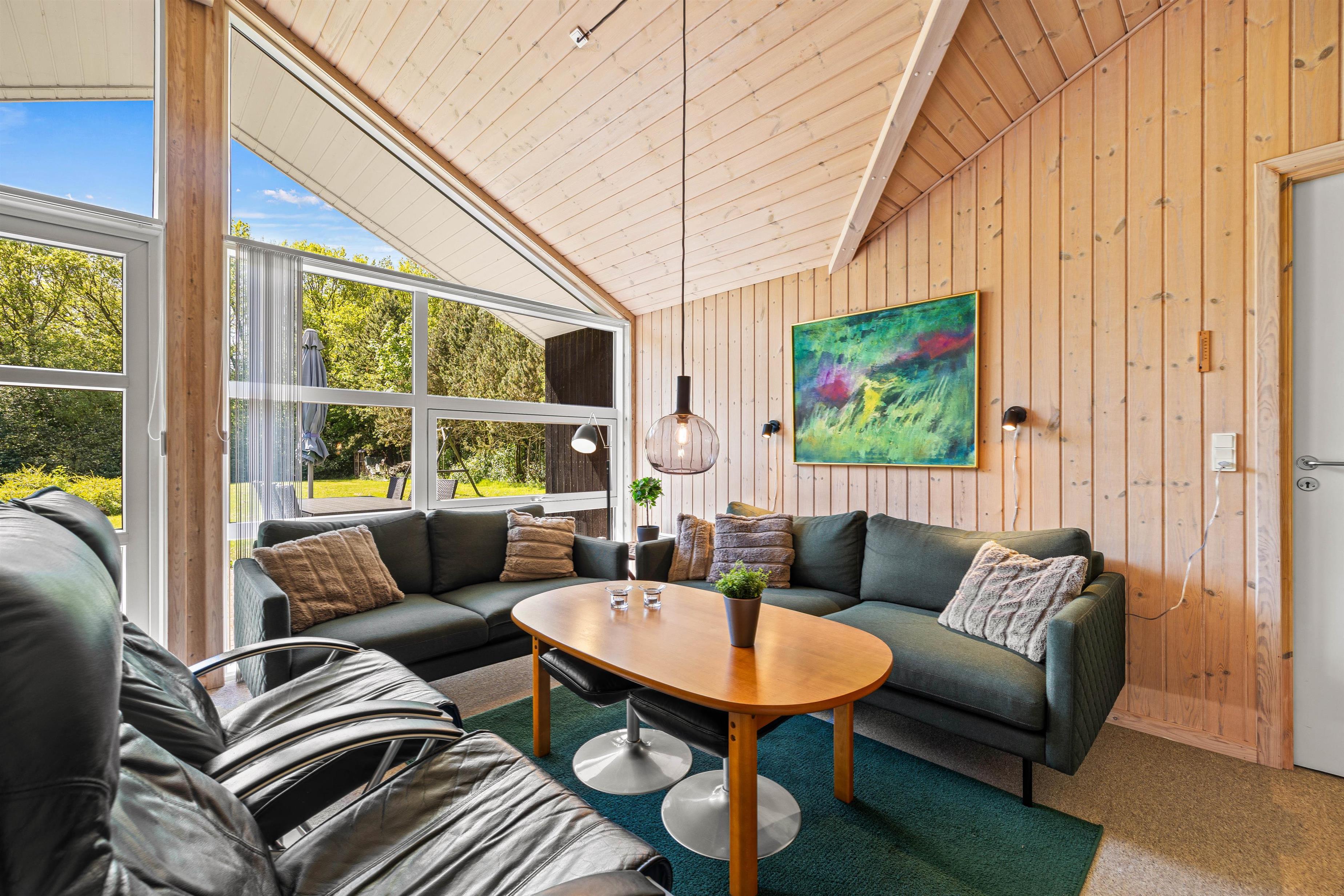 Køkkenet er praktisk indrettet med en opvaskemaskine, så I hurtigt kan tage jer af opvasken og komme videre med jeres eventyr langs Vestkysten. I stuen finder I komfortable møbler, der giver plads til alle, og en hyggelig brændeovn til at varme jer på kolde morgener. Sommerhuset er lyst med træpaneler på væggene og store vinduer, der inviterer masser af naturligt lys indenfor.