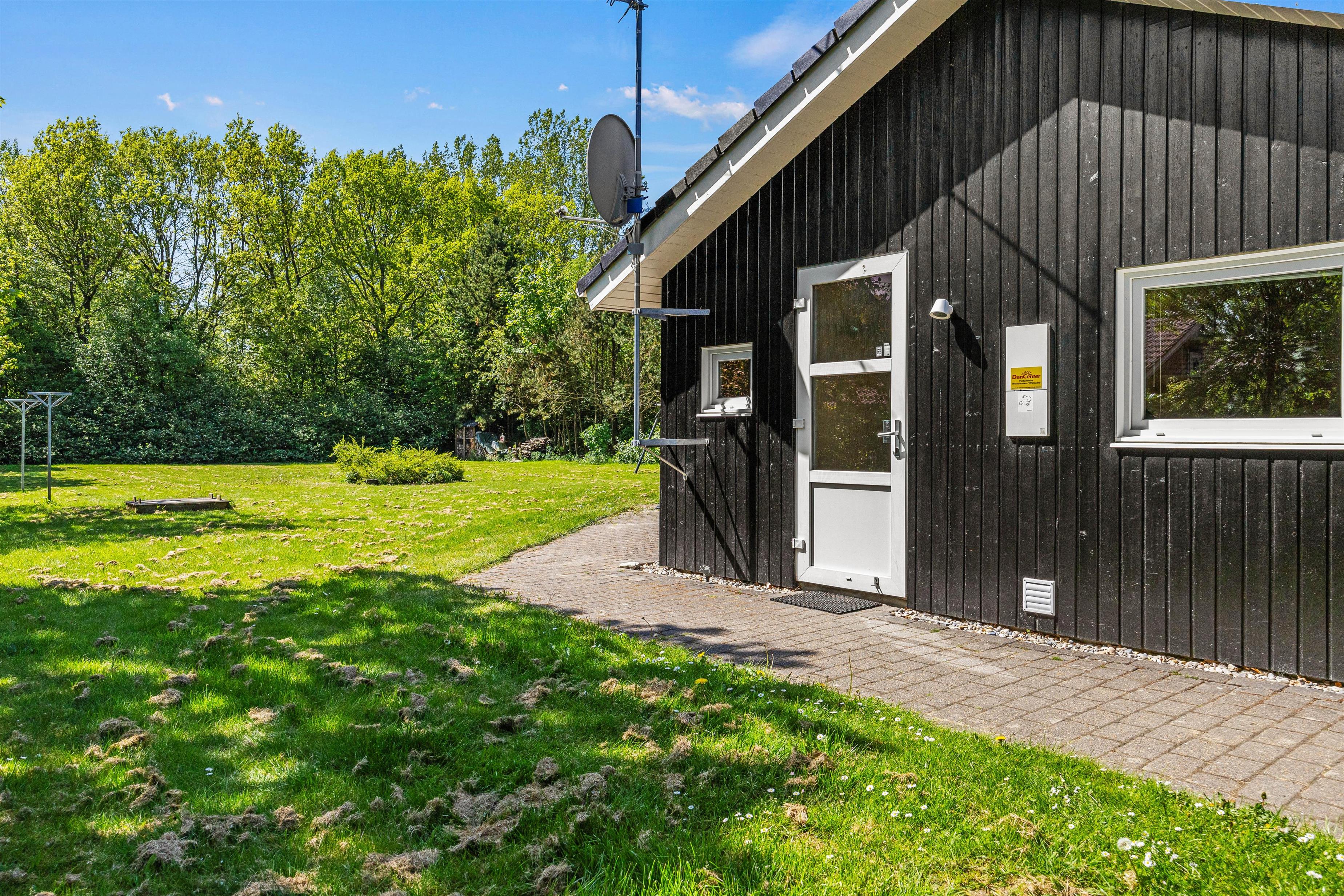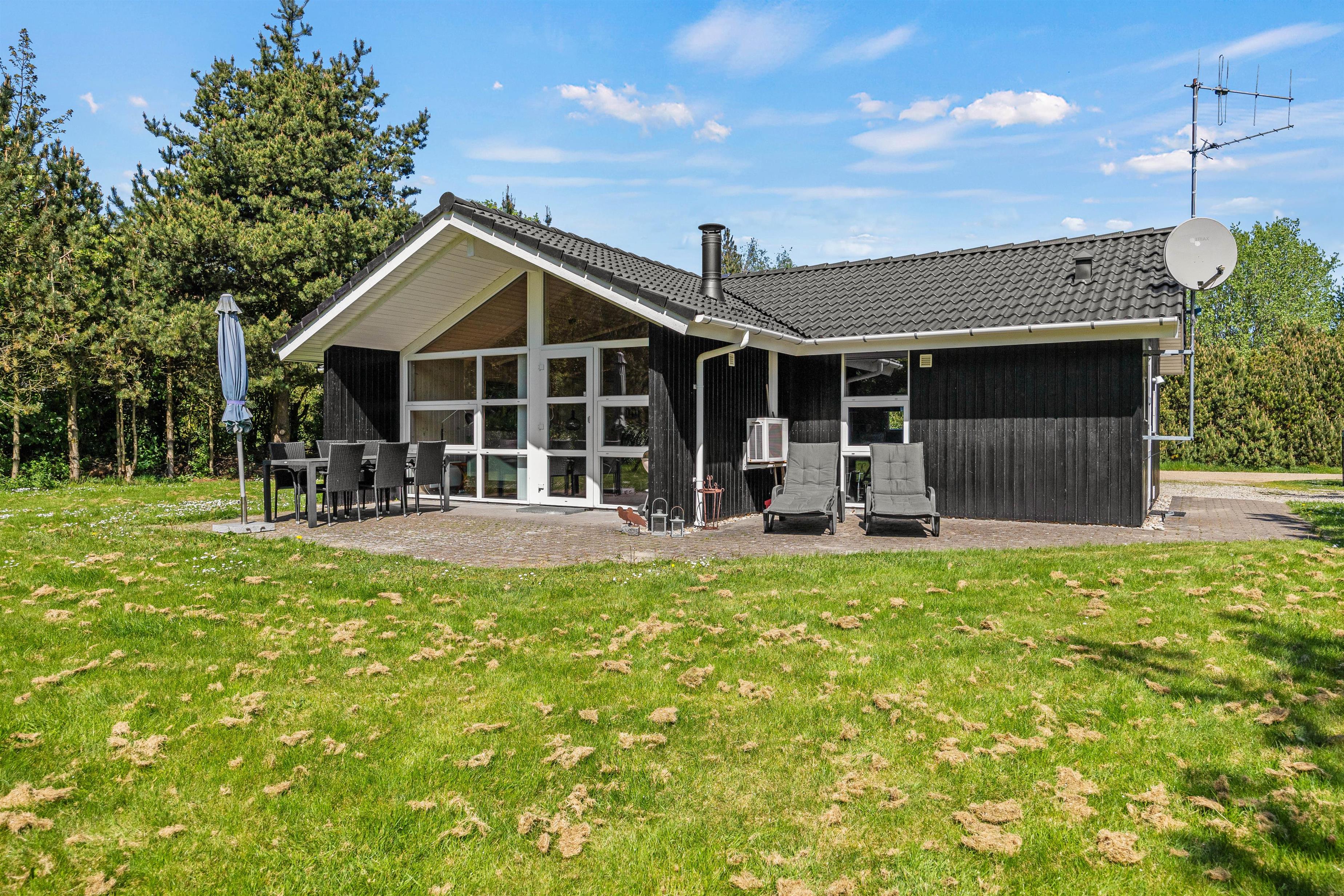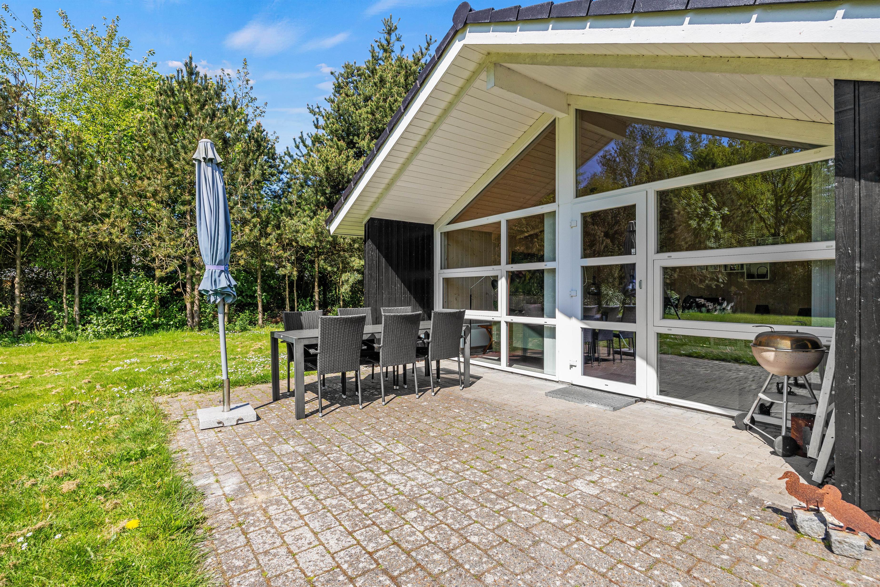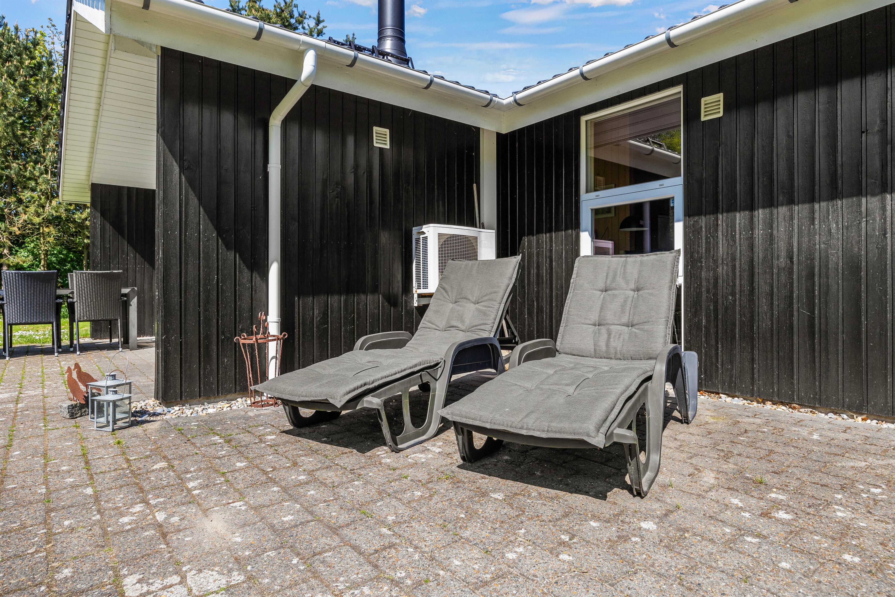 Fra stuen kan I træde ud på sommerhusets overdækkede terrasse, hvor alt er til rådighed for en skøn aften med udendørsmadlavning. Terrassen er udstyret med en grill og diverse havemøbler, perfekt til hyggelige måltider under åben himmel. Til de solrige dage er der også solsenge og en parasol, hvor I kan slappe af og nyde vejret. Dette er ikke den eneste terrasse ved sommerhuset, så der er altid en dejlig krog, hvor I kan nyde solens varme stråler og jeres friske morgenkaffe.