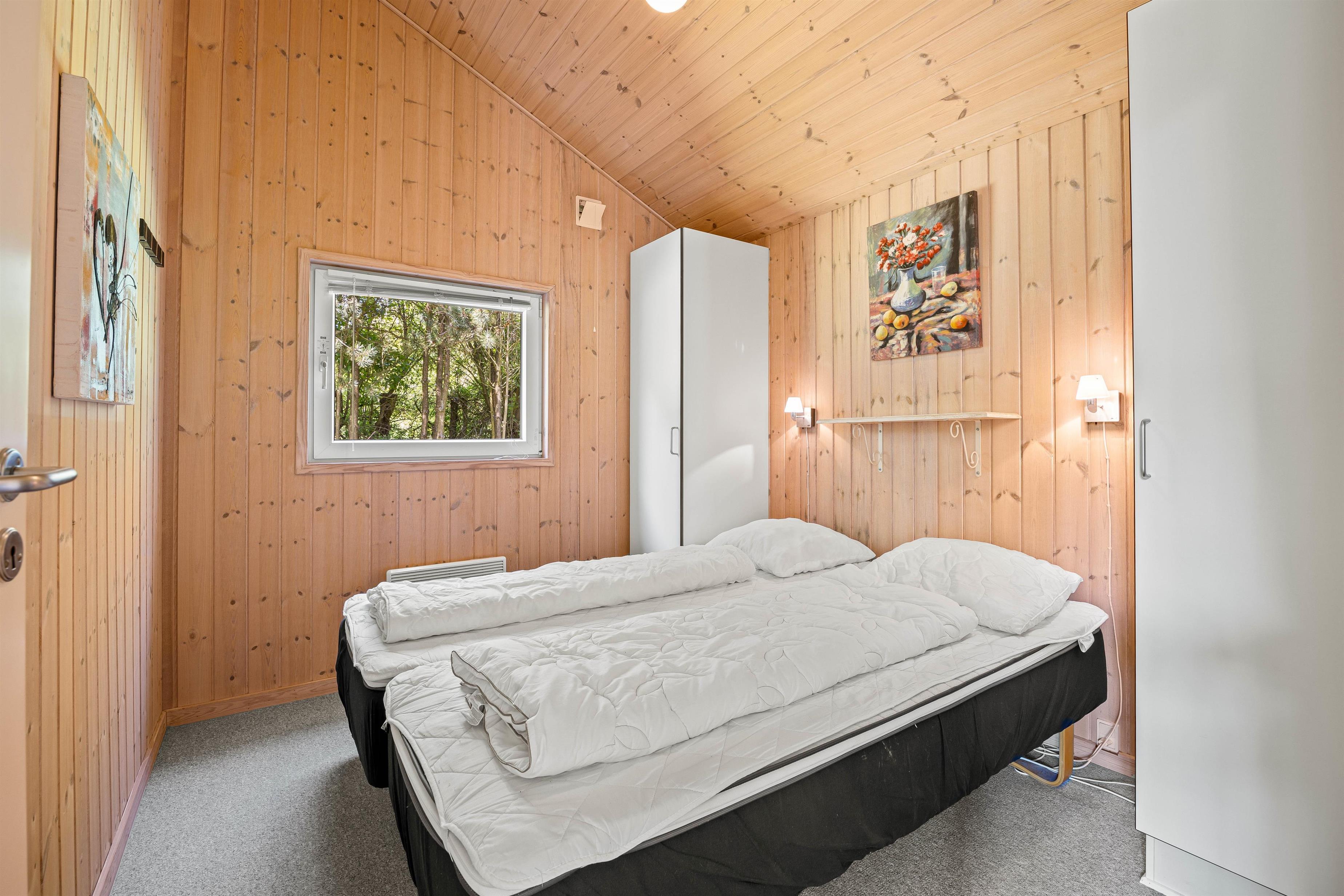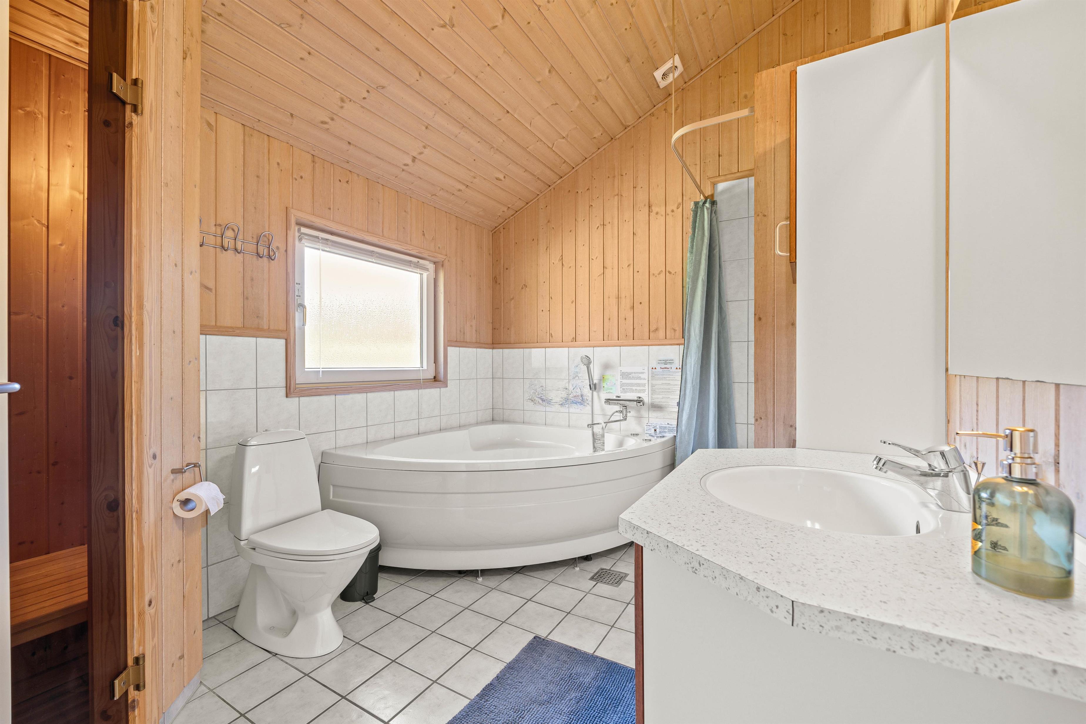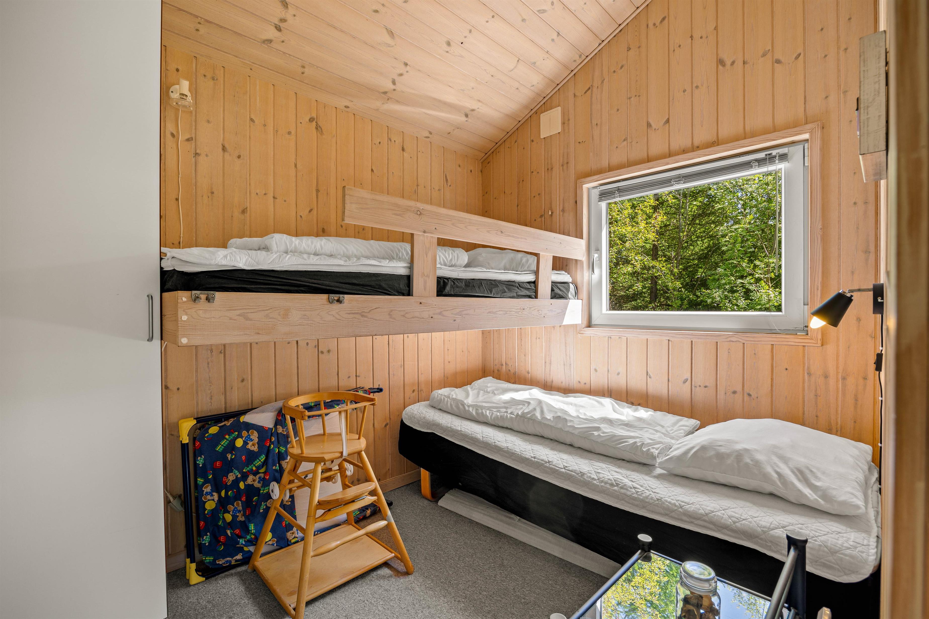 Der er 3 soveværelser i sommerhuset: 2 soveværelser med hver en dobbeltseng og det sidste soveværelse er med en køjeseng, hvilket gør det ideelt til både familier og vennegrupper. Sommerhuset byder også på et badeværelse og et gæstetoilet, begge med gulvvarme. Badeværelset er perfekt til afslapning, takket være saunaen og spaen, der har plads til 2 personer, hvor I kan slappe af efter en dag fyldt med aktiviteter. Desuden er der både vaskemaskine og tørretumbler, så I nemt kan holde styr på jeres tøj under hele opholdet.