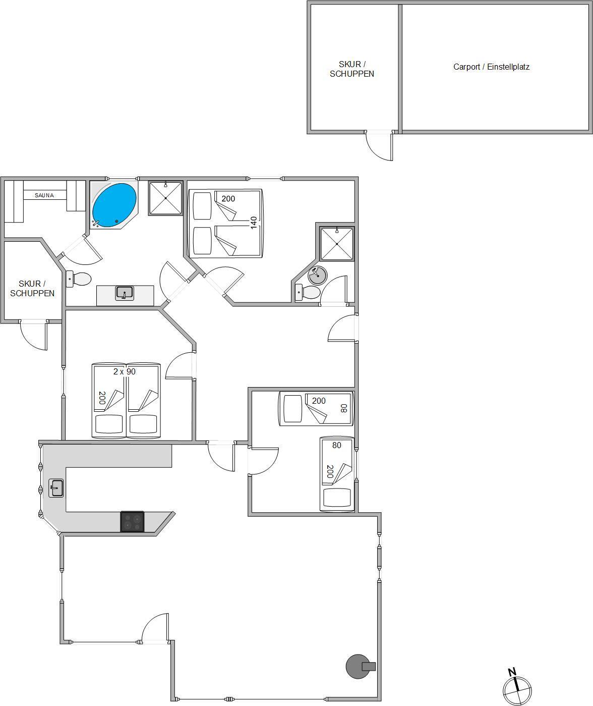 Når det er tid til at trække sig tilbage, venter 3 soveværelser på jer. To af dem er udstyret med dobbeltsenge, mens det tredje har to enkeltsenge, så alle har en behagelig soveplads. Badeværelset byder på både en tømmespa og en sauna - begge perfekte til at koble af efter en dag fuld af oplevelser. Gulvvarme findes her og på gæstetoilettet, hvilket sikrer ekstra komfort på de kølige morgener.