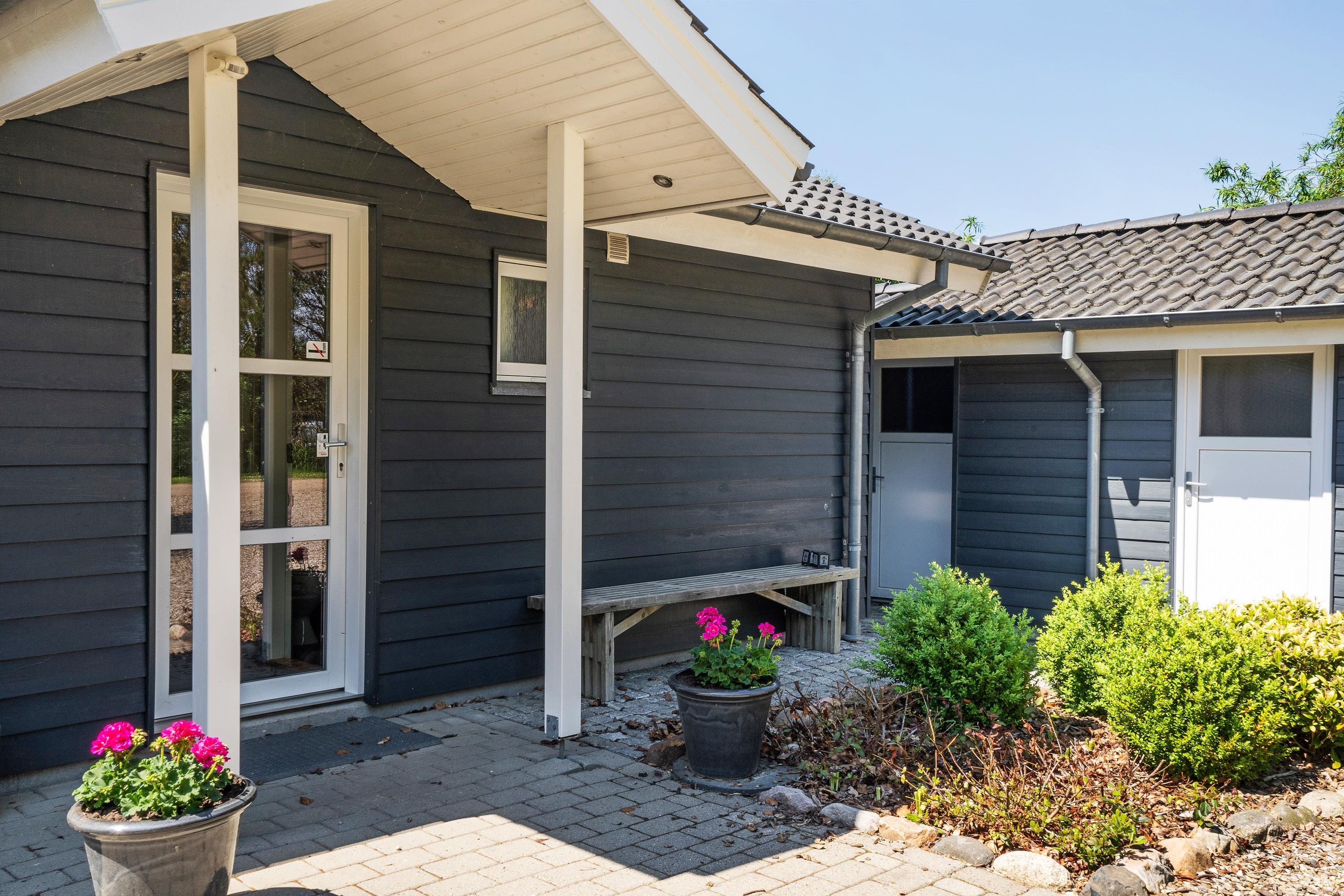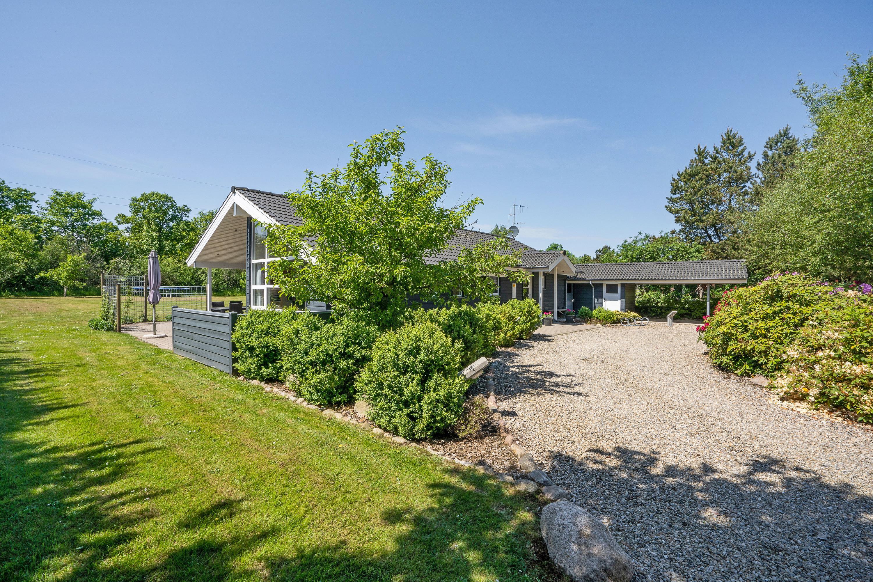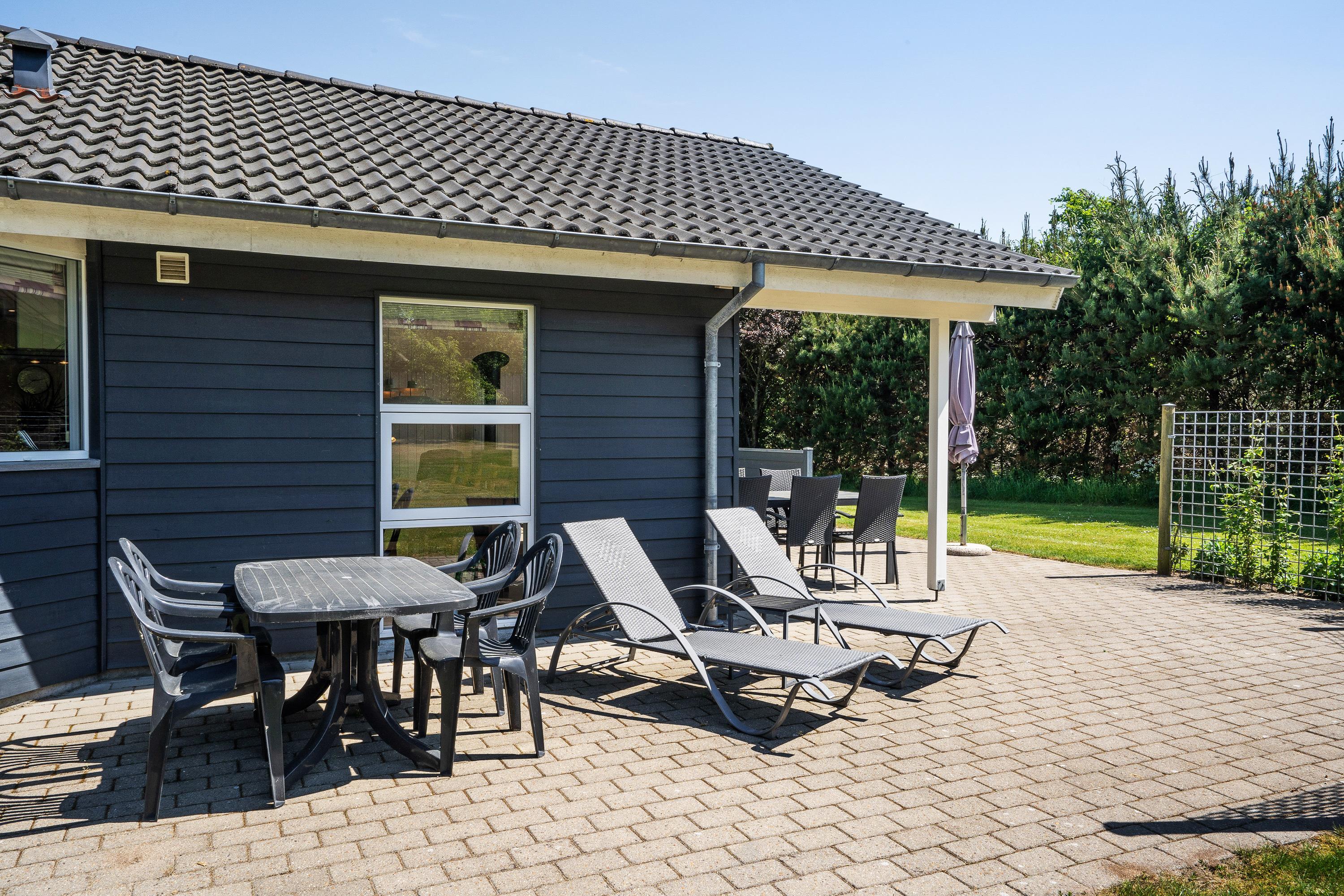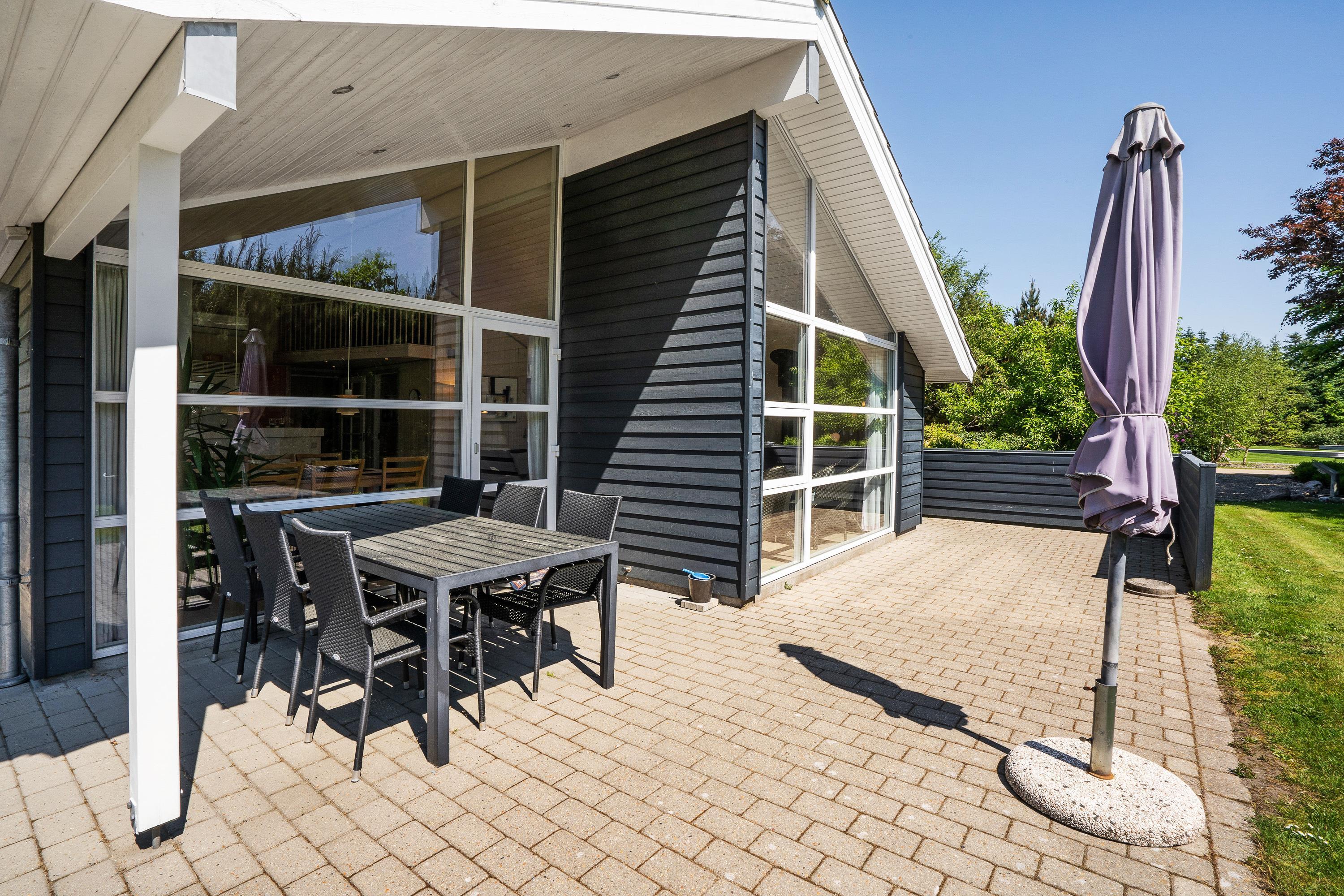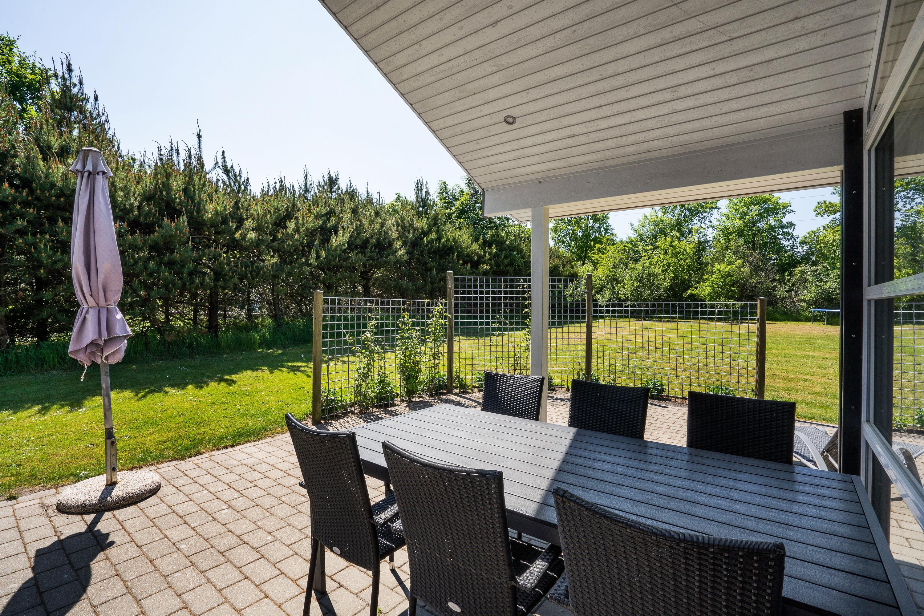 Sommerhuset har en delvist overdækket terrasse, som I kan nyde de solrige og varme feriedage fra. På terrassen kan I finde jer et godt spot i solen, hvor I kan sætte jer til rette i havemøbler og liggestole med en god bog.