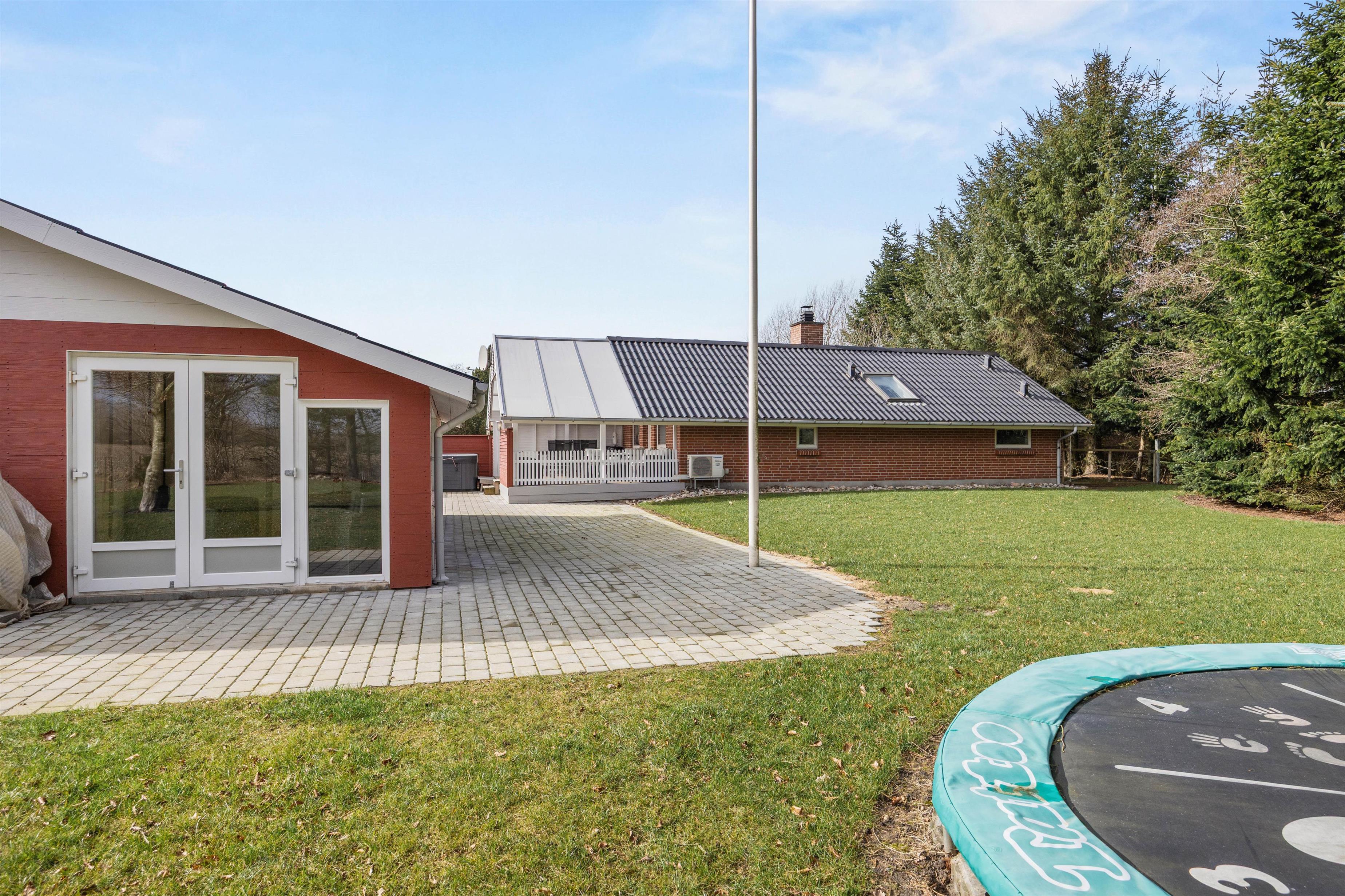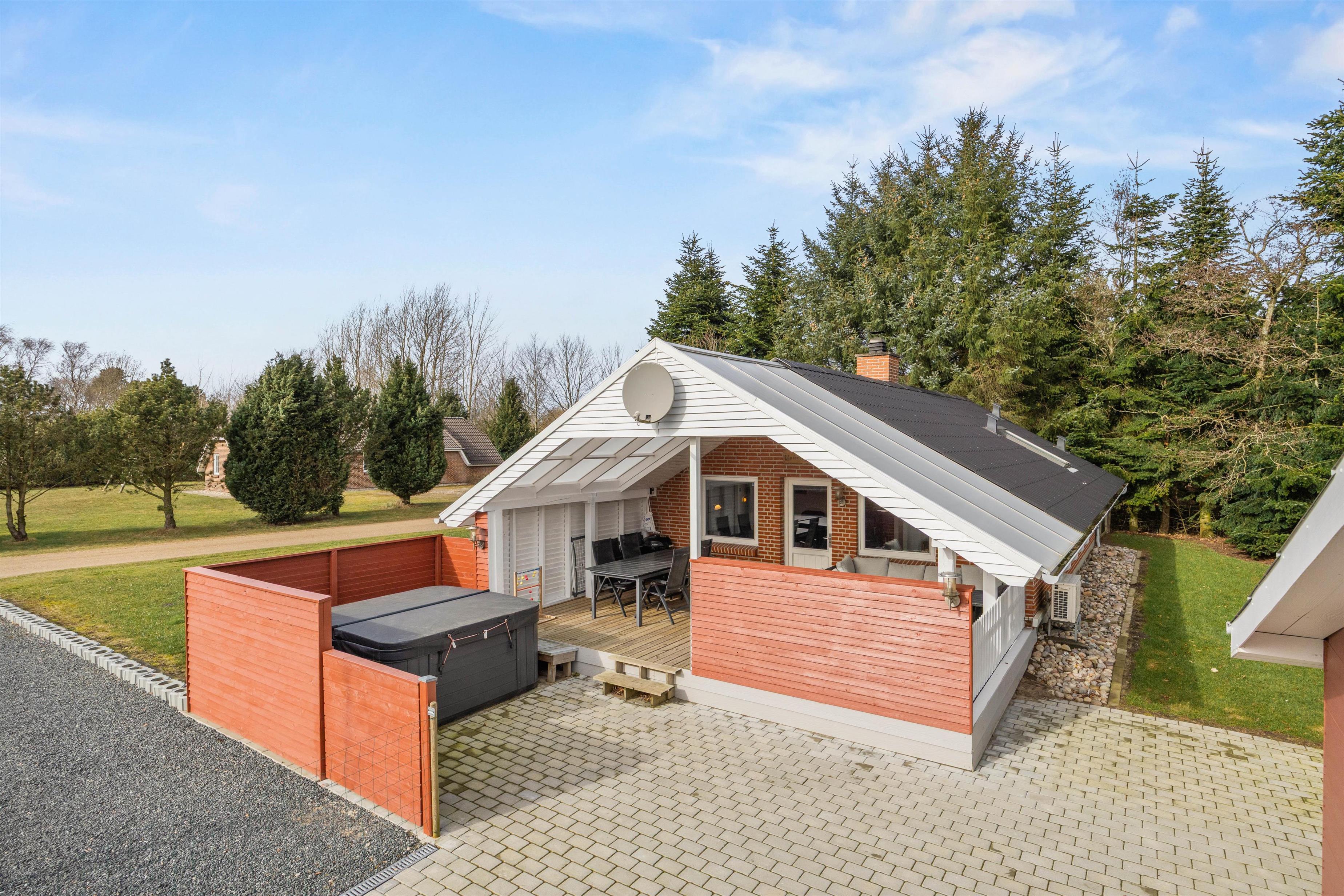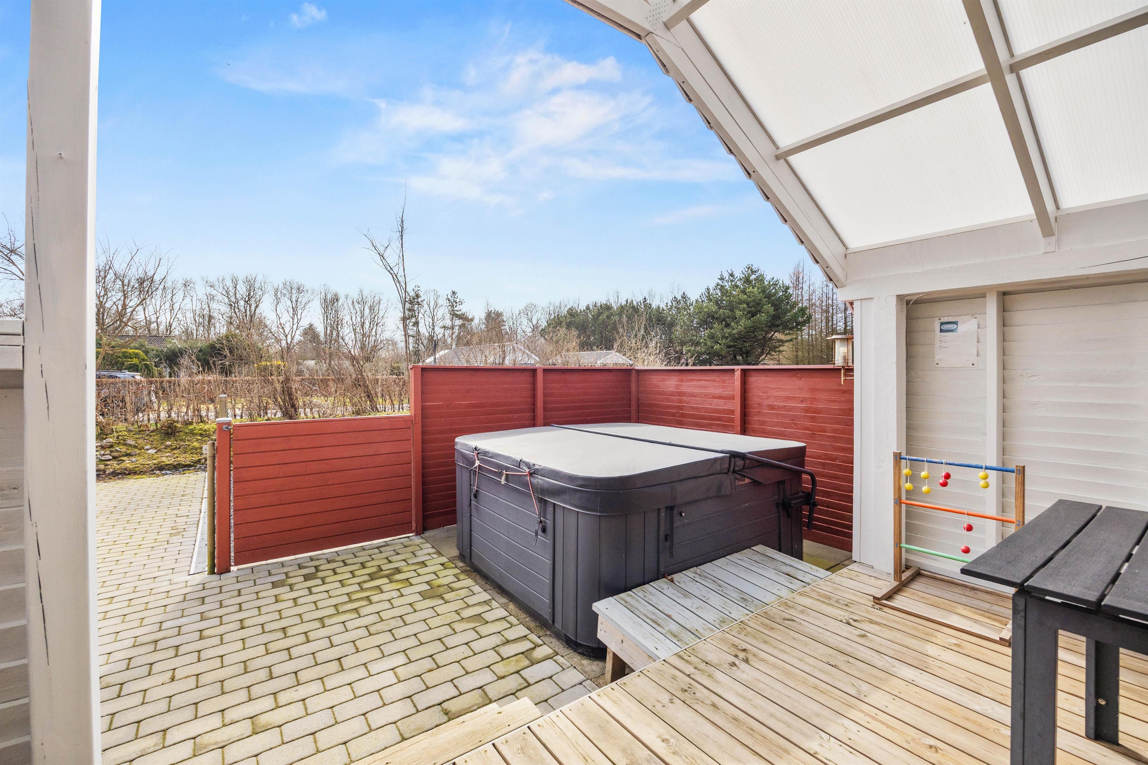 Udearealet giver dig masser af plads til at nyde ferien i det fri på den store 1622 m2 plænegrund, hvor både leg og afslapning kan fylde dagen. Du kan vælge mellem flere skønne terrassemiljøer, da sommerhuset har både åben, afskærmet, lukket og overdækket terrasse, så du altid kan finde læ, sol eller skygge alt efter vejr og humør. Den indhegnede grund gør det ekstra trygt, hvis du har børn eller hund med, og der er rig mulighed for at aktivere familiens mindste med sandkasse og gynge. Trampolinen indbyder til timevis af sjov og bevægelse, mens du selv kan sænke tempoet og forkæle dig med en tur i udespaen, der har plads til 6 personer og er oplagt til afslapning både dag og aften.